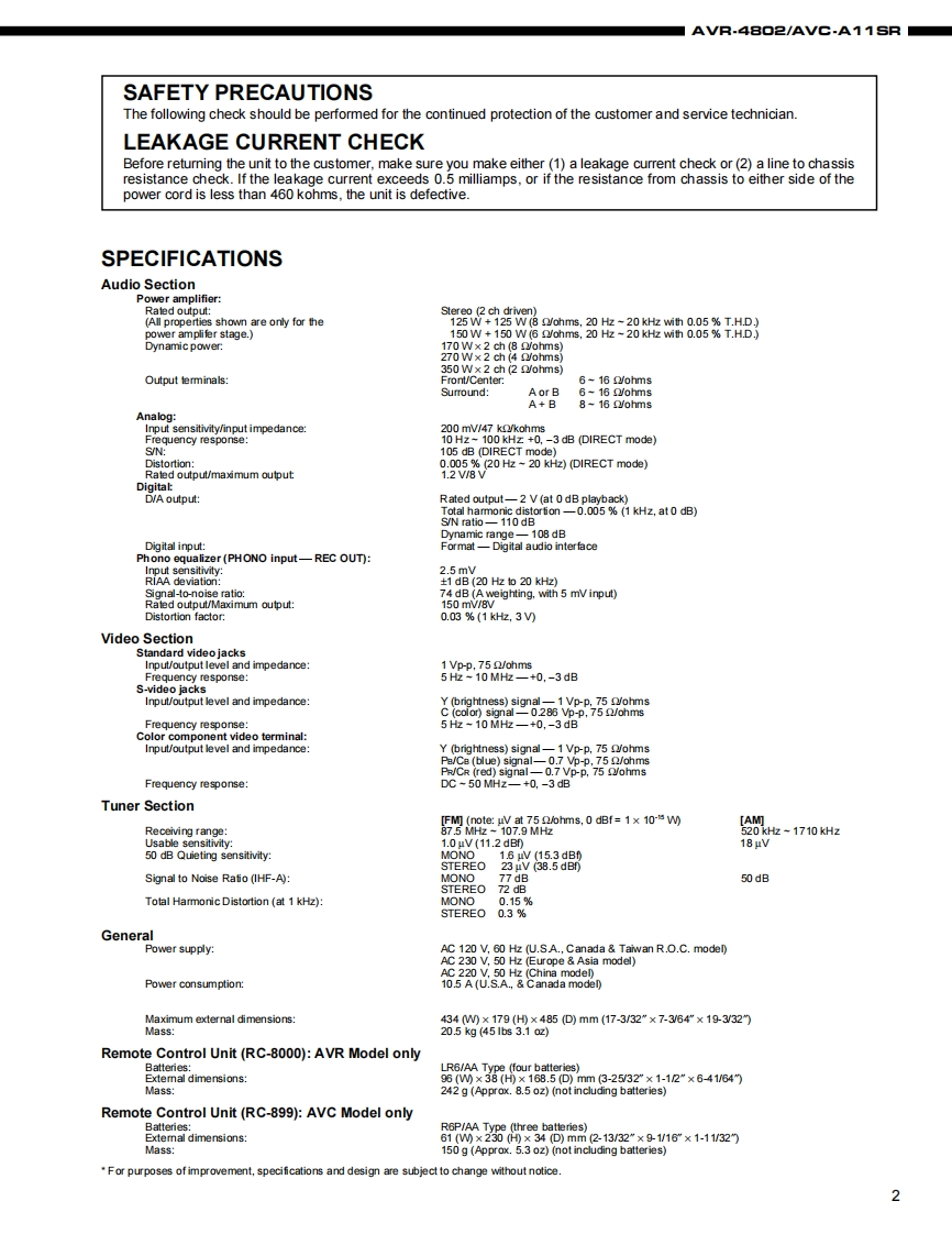 DENONFor U.S.A.,Canada,Europe,Asia,China,Hong Kong,Korea Taiwan R.O.C.modelHi-Fi ComponentSERVICE MANUALMODEL AVR.4B▣2MODEL AVC-A11SRAV SURROUND RECEIVER AMPLIFIER8888DENON足甲6国。ga68ES DSCRT DUD44a30000壶用限四898⊙EFor AVR-4802For AVC-A11SRSome illustrations using in this service manual are slightly different from the actual setNIPPON COLUMBIA CO,LTD.14-14.AKASAKA 4-CHOME.MINATO-KU.TOKYO 107-8011 JAPANTelephone:03 (3584)8111X01201174N可0108