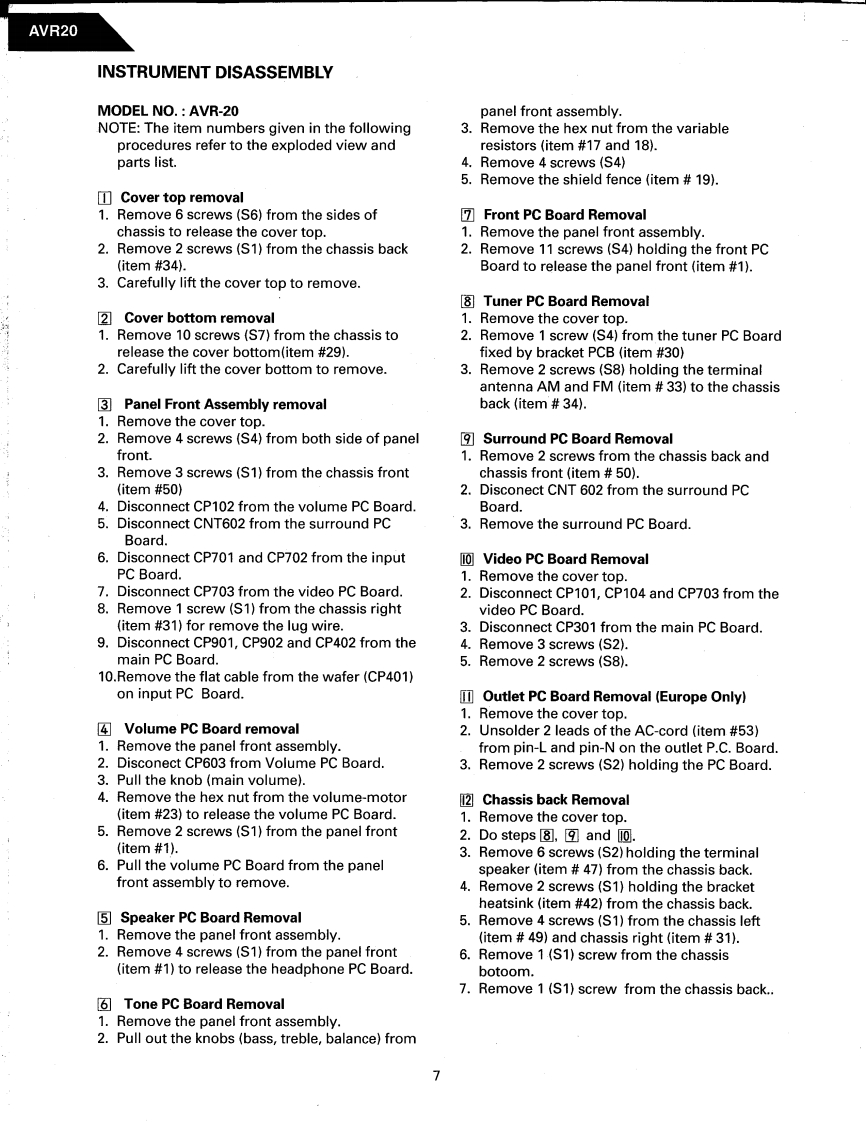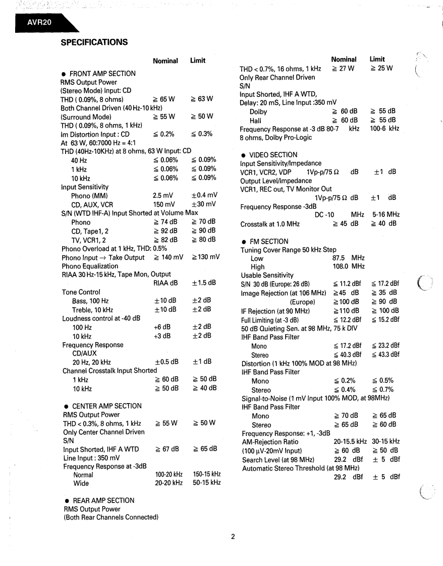The Harman KardonModel AVR20Manual 188AAUDIO AND VIDEO RECEIVERTechnical Manualharman/kardonR着0⑧⑧002⑦⑧0gQ8=:00O■CONTENTS■SPECIFICATIONS…2GENERAL UNIT…6LEAKAGE TESTP.C.B0ARDS…8CONTROLS AND FUNCTIONSELECTRICAL PARTS LIST...........13DISASSEMBLY PROCEDURES...........4BL0CKD1 AGRAM…28ALIGNMENT PROCEDURES........4IC BLOCK DIAGRAMS29CIRCUIT DESCRIPTION ..........SCHEMATIC DIAGRAMS....................32GENERAL UNIT PARTS LIST...........6WIRING DIAGRAM..................42harman/kardonParts and Service Office240 Crossways Park West,Woodbury,N.Y.117971112-0330A152 G9212 1500 Printed in Korea