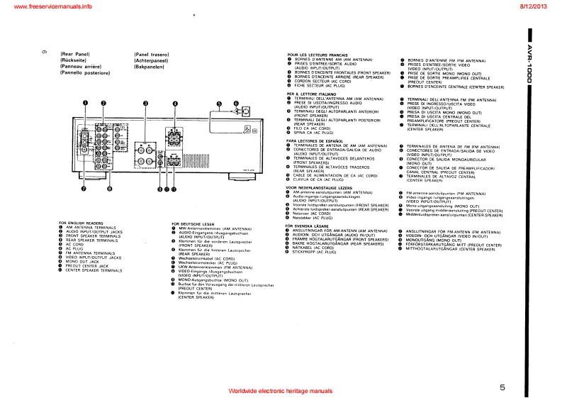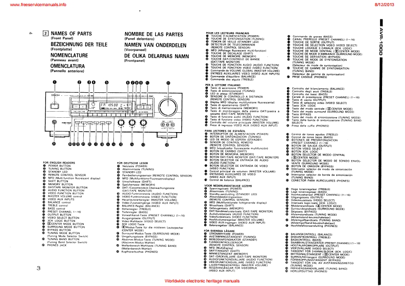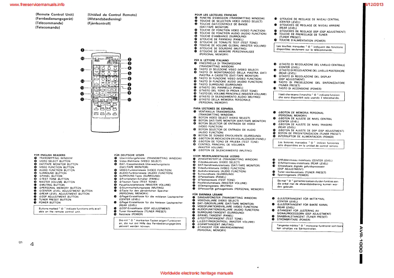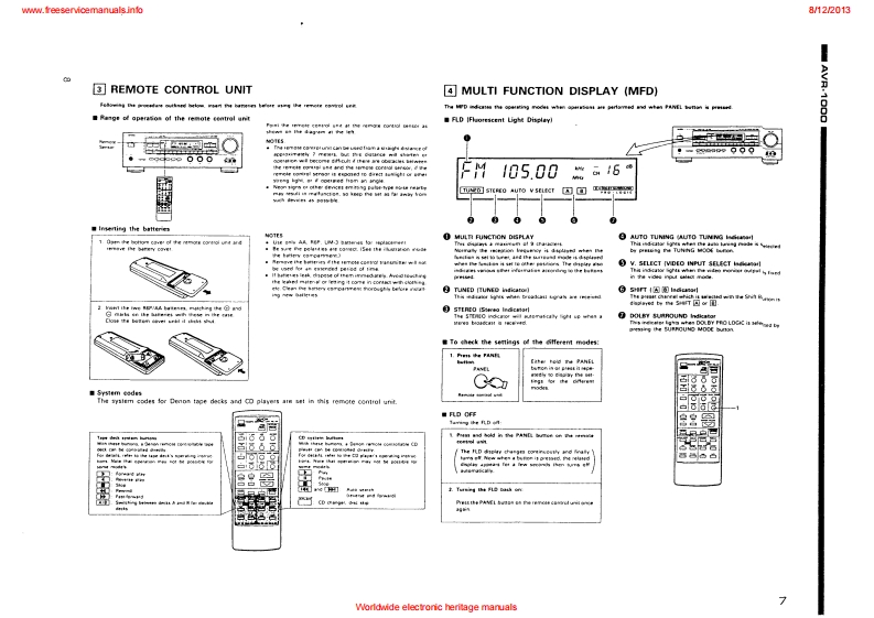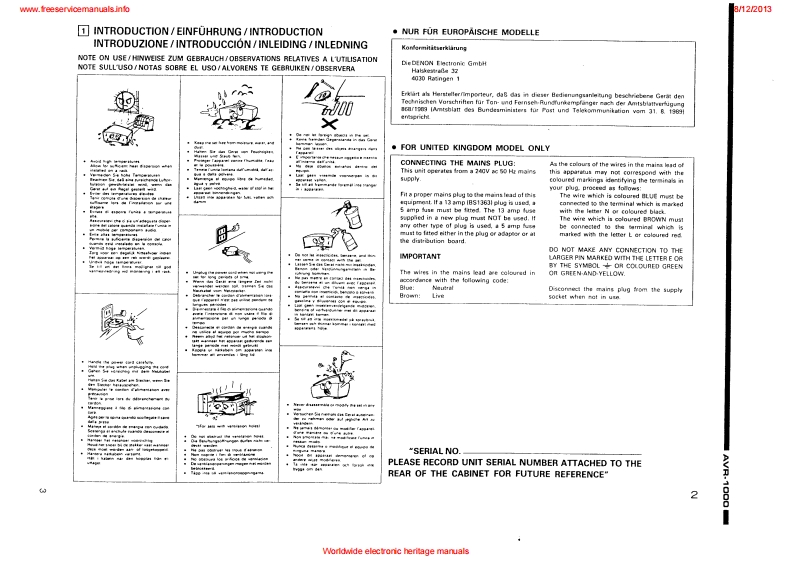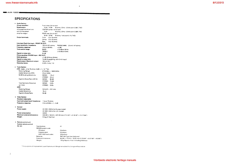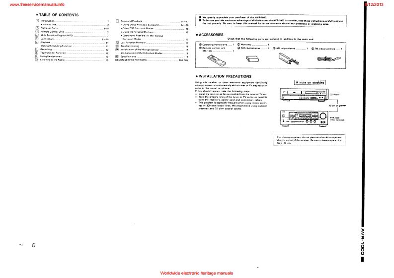 www.freeservicemanuals.info8/122013DENONHi-Fi AV Surround ReceiverSERVICE MANUALEurope ModelMODE是AWR1OOQAV SURROUND RECEIVERCONTENTSOPERATING INSTRUCTIONS2-20NIRE ARRANGEMENT.,,...,:,。,··DISASSEMBLY .........................................................................23ADJUSTMENT24-27SEMICONDUCTORS28-35PRINTEDWIRING BOARD.......................................................36-38PRINTED WIRING BOARD PARTS UST ................................................39-44BLOCKDIAGRAM....................................................................45NIRING DIAGRAM.........·,...··.SCHEMATIC DIAGRAM4749EXPLODED VIEW OF CHASSIS AND CABINET................................................50PARTS LIST OF EXPLODED VIEW .........................................................REMOTE CONTROLUNIT ...............................................................5PARTS LISTCORDS TABLESCHEMATIC DIAGRAM .................NIPPON COLUMBIA CO.LTDWorldwide electronic heritage manuals