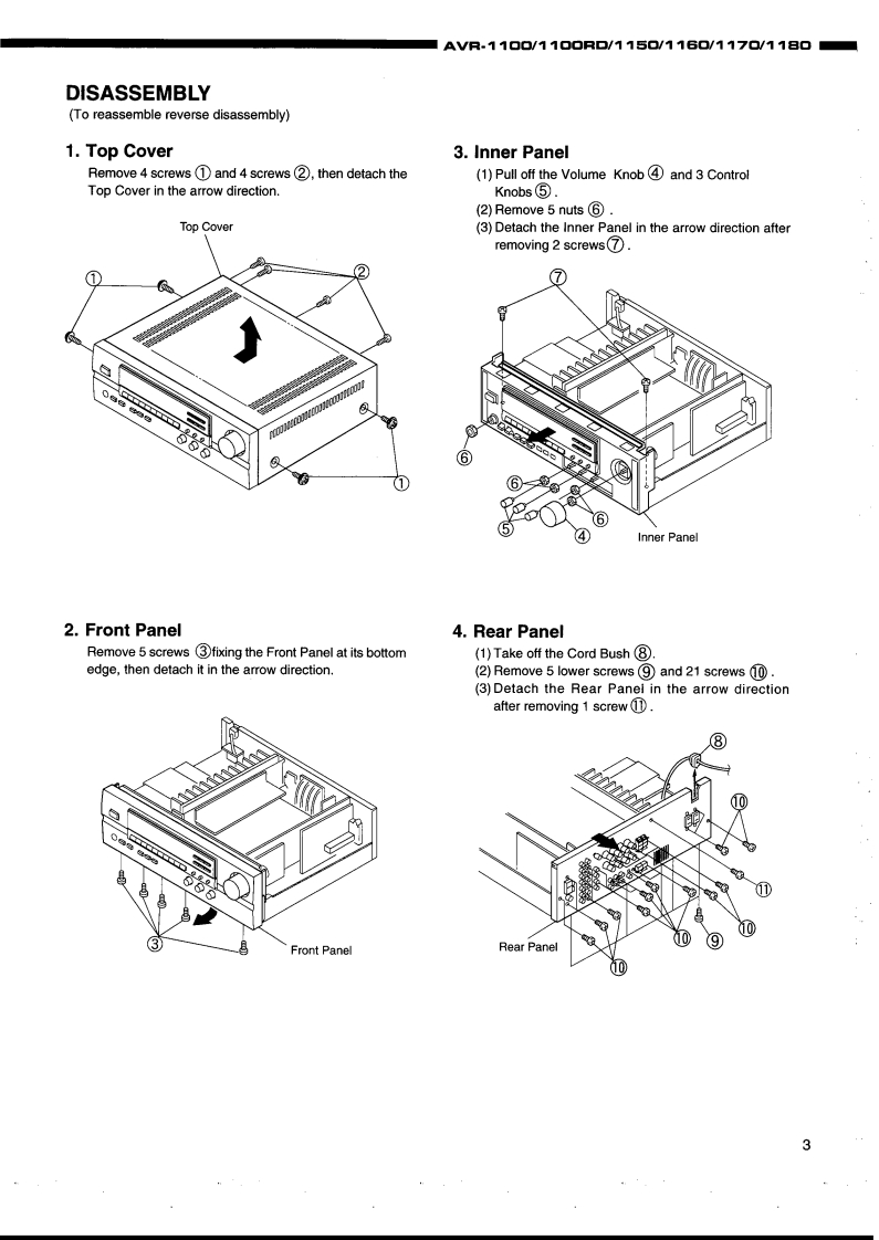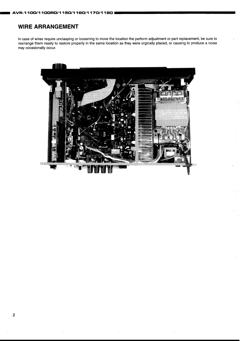 DENONHi-Fi AV Surround ReceiverSERVICE MANUALMODEL AVR-1 100/1 100RD/115▣/116▣/117▣/118▣AV SURROUND RECEIVER平同866000POICA一TABLE OF CONTENTSWIRE ARRANGEMENT......DISASSEMBLY.⊙CONNECTION DIAGRAM OF MEASURING INSTRUMENTS.4,5SEMICONDUCTORS.........6-14NOTE FOR PARTS LIST.15PARTS LIST OF P.W.B.UNIT16-25PRINTED WIRING BOARD25-27EXPLODED VIEW28PARTS LIST OF EXPLODED VIEW....29ADDENDUM PARTS LIST…29BLOCK DIAGRAM30NIRING DIAGRAM…31REMOTE CONTROL UNIT (RC-841)....................32SCHEMATIC DIAGRAM.33-35.37-39Some illustrations using in this service manual are slightly different from the actual set.NIPPON COLUMBIA CO,LTD.