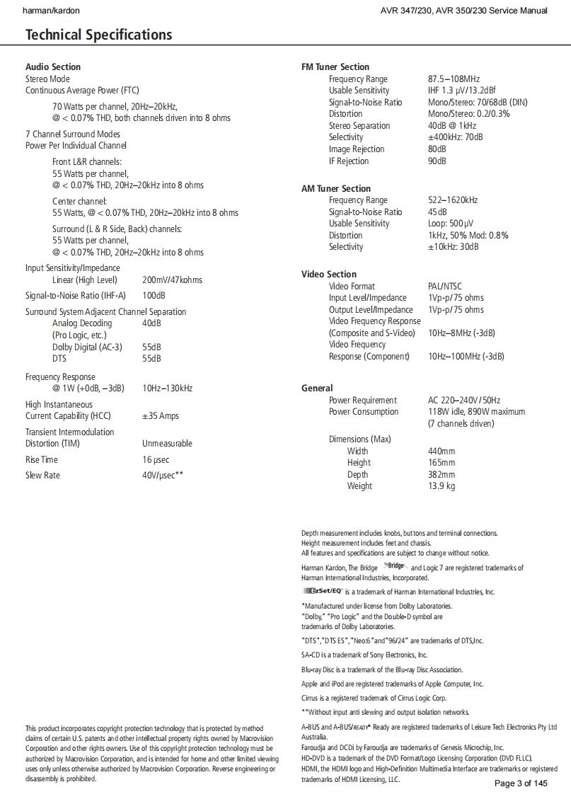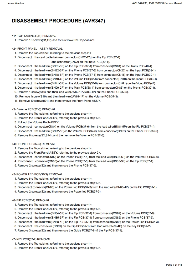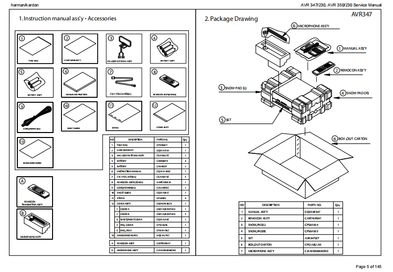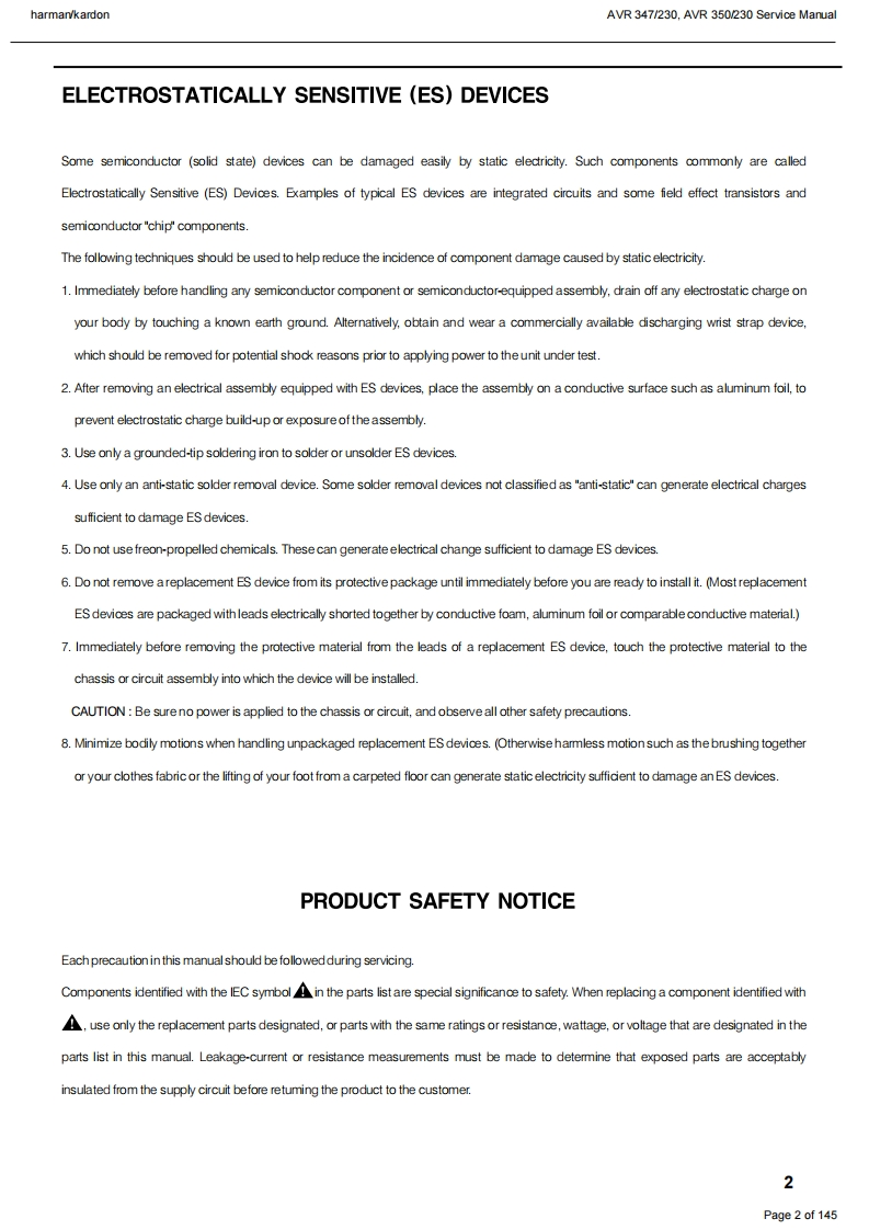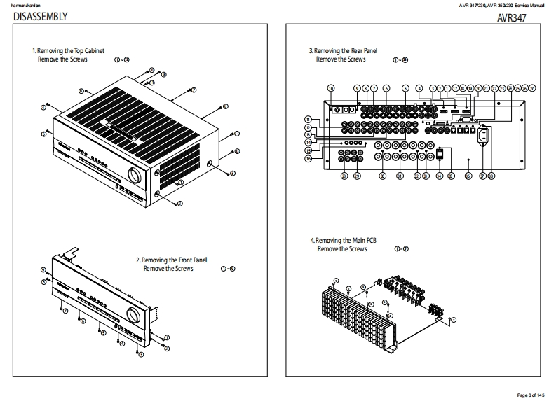 harman/kardonAVR 347/230.AVR 350/230 Service Manualharman/kardonService ManualAVR347I230AVR350/2307 x 55W 7.1 CHANNEL A/V RECEIVERSAWR四·DDC0AX1回吕国LOGIC77cHcI昌目050"06harman/kardonCONTENTSESD WARNING.....3AVR 350 DISASSEMBLY........13BASIC SPECIFICATIONS..................3AVR 350 EXPLODED VIEW AND PARTS.....14TROUBLESHOOTING GUIDE.............4ELECTRICAL PARTS LIST...................15PROCESSOR RESET........4SEMICONDUCTOR PINOUTS.74AVR 347 PACKAGE LIST AND PARTS.......5PCB DRAWINGS......124AVR 347 DISASSEMBLY.................6BLOCK DIAGRAM....................133AVR 347 DISASSEMBLY PROCEDURE......7WIRING DIAGRAM................134AVR347 EXPLODED VIEW AND PARTS...11AMP BIAS ADJUSTMENT.....................135AVR350 PACKAGE LIST AND PARTS......12SCHEMATIC DIAGRAMS........136Released EU2008harman/kardon,Inc.Rev0,072008250 Crossways Park Dr.Woodbury,New York,11797Page 1 of 145