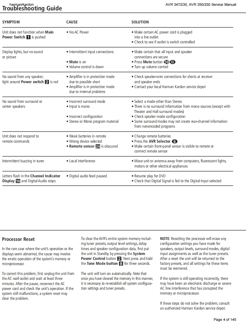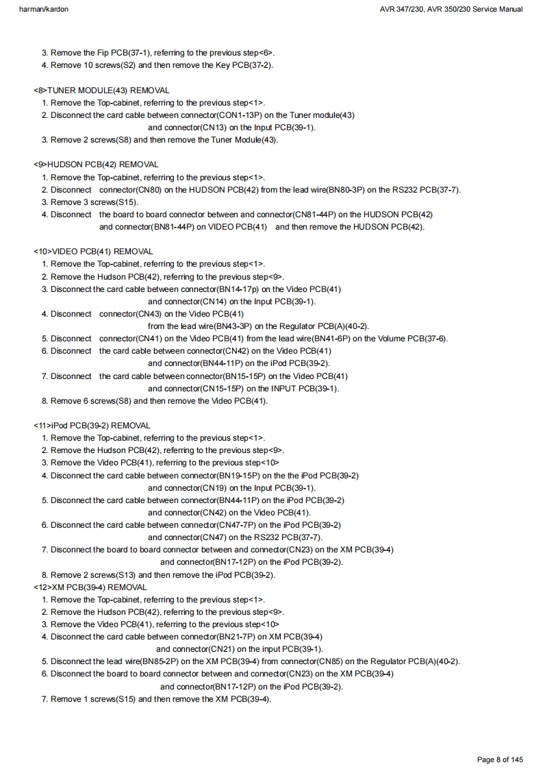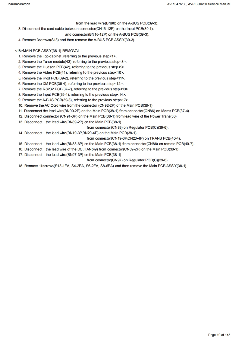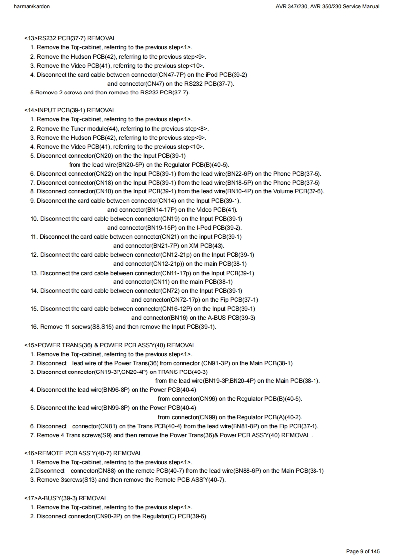 harman/kardonAVR 347/230.AVR 350/230 Service Manualharman/kardonService ManualAVR347I230AVR350/2307 x 55W 7.1 CHANNEL A/V RECEIVERSAWR四·DDC0AX1回吕国LOGIC77cHcI昌目050"06harman/kardonCONTENTSESD WARNING.....3AVR 350 DISASSEMBLY........13BASIC SPECIFICATIONS..................3AVR 350 EXPLODED VIEW AND PARTS.....14TROUBLESHOOTING GUIDE.............4ELECTRICAL PARTS LIST...................15PROCESSOR RESET........4SEMICONDUCTOR PINOUTS.74AVR 347 PACKAGE LIST AND PARTS.......5PCB DRAWINGS......124AVR 347 DISASSEMBLY.................6BLOCK DIAGRAM....................133AVR 347 DISASSEMBLY PROCEDURE......7WIRING DIAGRAM................134AVR347 EXPLODED VIEW AND PARTS...11AMP BIAS ADJUSTMENT.....................135AVR350 PACKAGE LIST AND PARTS......12SCHEMATIC DIAGRAMS........136Released EU2008harman/kardon,Inc.Rev0,072008250 Crossways Park Dr.Woodbury,New York,11797Page 1 of 145