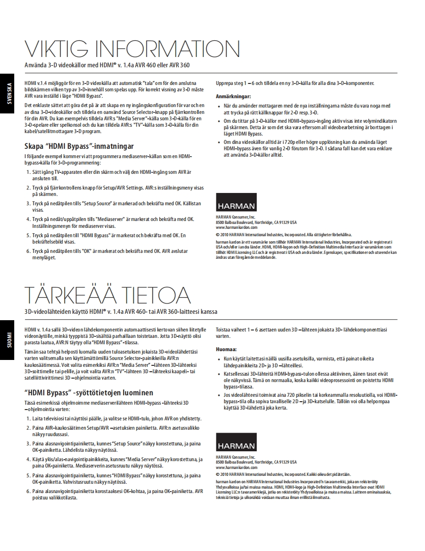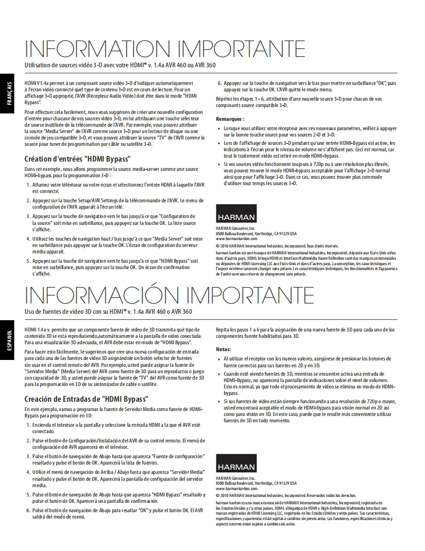 harman/kardonby HARMANIMPORIANTINFORMATIONUsing 3-D video sources with your HDMIv.1.4a AVR 460 or AVR 360HDMI v.1.4a allows a 3-D-video source component to automatically tell the connectedRepeat Steps 1-6,assigning a new 3-D source for each of your 3-D-capable sourcevideo display which type of 3-D content is currently playing.For proper 3-D display,thecom ponents.AVR must be in the"HDMI Bypass"mode.To do this easily,we suggest that you create a new input configuration for each of yourNotes:3-D-video sources by assigning it an unused Source Selector button on the AVR's remoteWhen using your receiver with these new settings,be sure to press the correct sourcecontrol.For example,you can assign the AVR's"Media Server"source as the 3-D source forbuttons for your 2-D and 3-D sources.a 3-D-capable disc player or game,and you can assign the AVR's"TVsource as the 3-DWhen viewing 3-D sources while an HDMI-bypass input is active,the on-screensource for your cable or satellite tuner's 3-D programming.indications for volume level will notappear.This is normal,since all video processingis removed in the HDMI-bypass mode.Creating "HDMI Bypass"InputsIf your video sources are always operating at 720p or higher resolution,you may findIn this example,we will program the media-server source as an HDMI-bypass source forthe HDMI-bypass mode acceptable for normal 2-D viewing as well as for 3-D viewing3-D programming:In this case,you may find it more comvenient to use the 3-D sources at all times.1.Turn your TV or display on and select the HDMI input that the AVR is connected to.2.Press the AVR remote's Setup/AVR Settings button.The AVR's setup menu will appearon your TV.3.Press the navigation Down button until "Setup Source"is highlighted,and press theOK button.The source list will appear.HARMAN4.Use the navigation Up/Down buttons until"Media Server"is highlighted and pressthe OK button.The media-server setup screen will appear.8500 Balboa Boulevad,Northridge,CA91329USAwww.harm.ankardon.com5.Press the navigation Down button until "HDMI Bypass"is highlighted and press the2010 HARMAN Intemational Industries,Incorporated.All rights eserved.OK button.A confirmation screen will appear.harman kardon is a trademark of HARMAN Intemationalindustries Incorporated,segistesed in the UnitedStates6.Press the navigation Down button to highlight"OK,"and press the OK button.The AVRthe HDMigh-Defnition Mulmedia ademarks of HDMILicensingLIC,registered in the United Statesand other coun tries.Featues,spedifications and appeaancearewill exit the menu mode.subject to change without no tice.WICHTIGE INFORMATIONAusgabe von 3D-Videosignalen uber die HDMIv.1.4a-Schnittstelle lhres AVR 460 oder AVR 360Der HDMIv1.4a-Standard erlaubt,dass sich eine 3D-Videoquelle und ein passender,Wiederholen Sie die Schritte 1-6,um weitere Eingange fur die Wiedergabe von3D-fahiger Flachbildfernseher auf den Typ des gerade spielenden 3D-Videosignals3D-Programmmaterial zu konfigurieren.einigen konnen.Deswegen musse