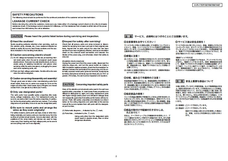 DENONFor U.S.A.,Canada,Europe,Taiwan R.O.C.modelSERVICE MANUALVer.1MODEL AVR-1707AVR-1507AVR-687AVR-587AVR-487AV SURROUND RECEIVER注意廿一七又在书乙存前、乙)片一又又二1了儿龙必寸书蔬4〈龙志。本機志、火災、感電、付岱存艺忙对寸石安全性在保寸石左协亿、志去芒未左配虚卷方乙存(方以、未上法的估「電氨用品安全法」E屯上老、所定)許可在得(造志九(訪)求寸。徙一(少一上又卷乙存際体、乙九5)安全性雜持志九石卡、乙)少一上久マ二1了記载志九(小石注意事項卷必式訪守)〈龙过。For purposes of improvement,specifications and●本機)仕横性能改良)左边、予告存〈变更寸石乙匕design are subject to change without notice.州杨少来寸。●補修用性能部品)保有期間:、製造打切後8年C寸。Please use this service manual with referring to the·修理)際仗、必寸取极脱明苦左参照)上、作業卷行一operating instructions without fail.((龙达。.Some illustrations using in this service manual are●本文中忙使用L(石亻与又卜休、脱明)都合上現物slightly different from the actual set.上多少異存石場合杨少李寸。DENONTOKYO,JAPANDenon Brand Company,D&M Holdings Inc.X0282M.01DE/CDM0605