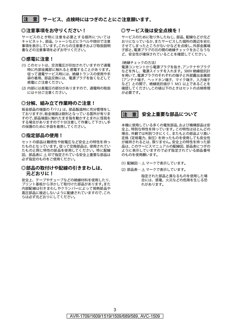 DENONVer.1SERVICE MANUALMODELJPE3E2EKE2AE1CEAAVR-1709AVR-1609VAVR-1519AVR-1509√AVR-689√√AVR-589AVC-1509√AV SURROUND RECEIVER注意圹一上又在方乙存前:、乙0圹一上又又二1了儿在必寸书蔬〈龙过U。本機体、火災、感電、付存忙对村石安全性左確保寸石左忙、志丰式未存配感在方乙存一(方、求大法的忙休「電氨用品安全法忙花上一老、所定)許可在得(製造过九(方)求寸。徙(圹一上又在方乙存際.、乙九5)安全性維持志九石太、乙)圹一上又又二1了儿无記載志九(小石注意事項在必寸守)〈龙这。For purposes of improvement,specifications and·本機0仕横性能改良)尤协、予告在〈变更寸石乙上design are subject to change without notice.州逝)李寸。·補修用性能部品)保有期間法、製造打切後8年C寸。Please use this service manual with referring to the·修理)際太、必寸取极脱明害左参照)上、作業卷行)operating instructions without fail.乙〈龙达。.Some illustrations using in this service manual are·本文中忙使用L(石亻与又卜体、脱明)都合上現物slightly different from the actual set.上多少異在石場合扬)李李。DENONDenon Brand Company,D&M Holdings Inc.X0382 V.01 DE/CDM 0806