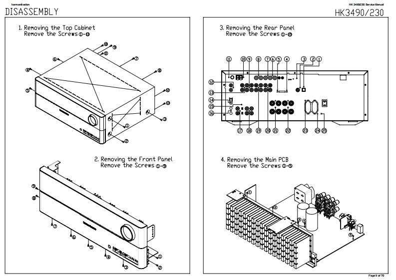 harman/kardonHK 3490/230 Service Manualharman/kardonService ManualHK3490/2302 x 120W STEREO RECEIVERHK圆VID 1 /OPTICALSPK 1 DUS-WIDEharman/kardonCONTENTSLEAKAGE CHECK2EXPLODED VIEW AND PARTS1ESD WARNING3ELECTRICAL PARTS LISTTECHNICAL SPECIFICATIONS4SEMICONDUCTOR PINOUTS34TROUBLESHOOTING GUIDE5PCB DRAWINGSFRONT PANEL CONTROLS6BLOCK DIAGRAMREAR PANEL CONNECTIONS7WIRING DIAGRAM85PACKAGE LIST AND PARTS8AMP BIAS ADJUSTMENTDISASSEMBLY9SCHEMATIC DIAGRAMSReleased EU2008harman/kardon,Inc.Rev0,09/2008250 Crossways Park Dr.Woodbury,New York,11797Page 1 of 70