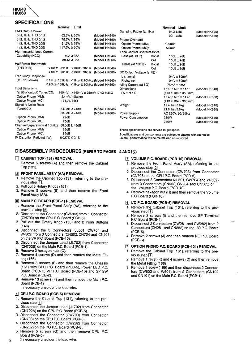 The Harman KardonModel HK640/HK660Manual 198AINTEGRATED AMPLIFIERTechnical Manualhamman/kardon06The following marks found in the parts list of this manualidentify the models as follows:HK640/HK660:International model Black versionHK640/HK660:International modelHK640 Asia/Oceania model Black versionCONTENTSSPECIFICATIONS2IC BLOCK DIAGRAM.....…14DISASSEMBLY PROCEDURES...2NIRING DIAGRAM…15CONTROLS AND FUNCTIONSSCHEMATIC DIAGRAM…15POWER CORD REPLACEMENT..........PH600 PHONO P.C.BOARD OPTIONALIGNMENT PROCEDURES.............HOW TO INSTALL........19BLOCK DIAGRAM.....3GENERAL UNIT PARTS LIST+**19GENERAL UNIT EXPLODED VIEW..........P.C.B0ARD…20GENERAL UNIT PARTS LIST.....5NIRING DIAGRAM…20P.C,B0ARDS…SCHEMATIC DIAGRAM…21ELECTRICAL PARTS LIST.ELECTRICAL PARTS LIST.22IC TERMINAL FUNCTION..13harman/kardonParts and Service Office80 Crossways Park West,Woodbury.N.Y.117971112-HK640-A A9502 300 Printed in Japan