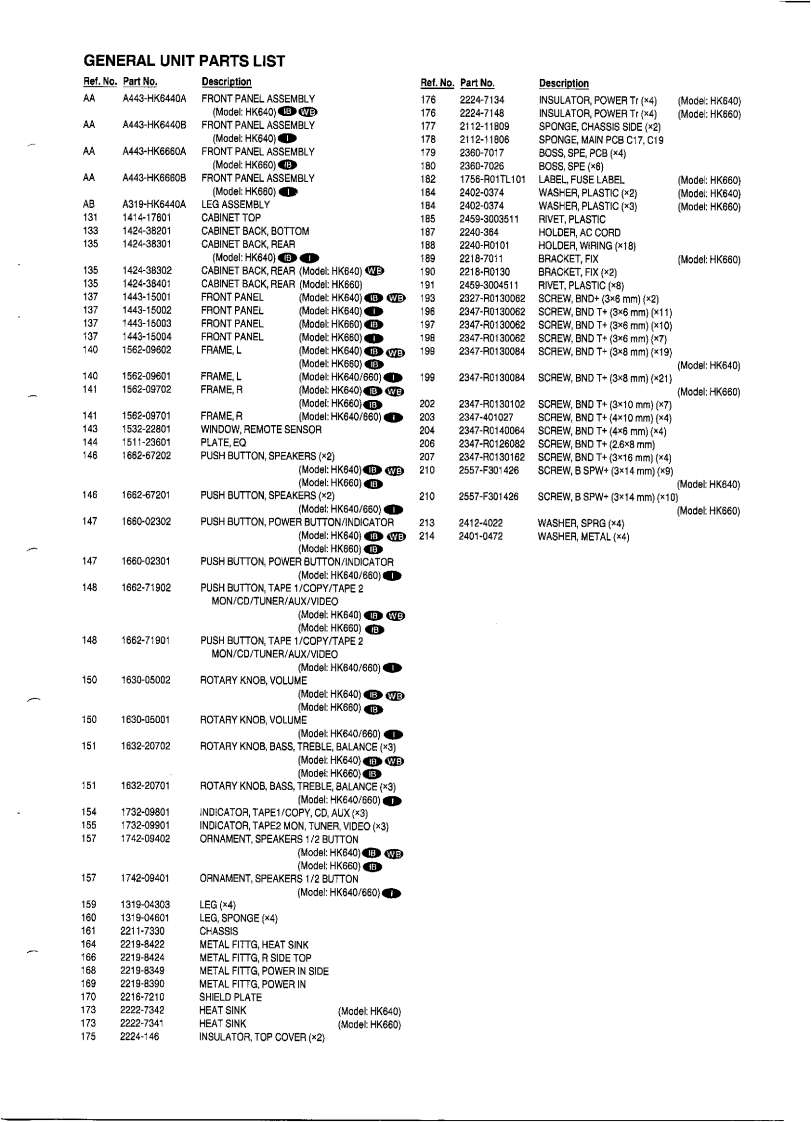 The Harman KardonModel HK640/HK660Manual 198AINTEGRATED AMPLIFIERTechnical Manualhamman/kardon06The following marks found in the parts list of this manualidentify the models as follows:HK640/HK660:International model Black versionHK640/HK660:International modelHK640 Asia/Oceania model Black versionCONTENTSSPECIFICATIONS2IC BLOCK DIAGRAM.....…14DISASSEMBLY PROCEDURES...2NIRING DIAGRAM…15CONTROLS AND FUNCTIONSSCHEMATIC DIAGRAM…15POWER CORD REPLACEMENT..........PH600 PHONO P.C.BOARD OPTIONALIGNMENT PROCEDURES.............HOW TO INSTALL........19BLOCK DIAGRAM.....3GENERAL UNIT PARTS LIST+**19GENERAL UNIT EXPLODED VIEW..........P.C.B0ARD…20GENERAL UNIT PARTS LIST.....5NIRING DIAGRAM…20P.C,B0ARDS…SCHEMATIC DIAGRAM…21ELECTRICAL PARTS LIST.ELECTRICAL PARTS LIST.22IC TERMINAL FUNCTION..13harman/kardonParts and Service Office80 Crossways Park West,Woodbury.N.Y.117971112-HK640-A A9502 300 Printed in Japan