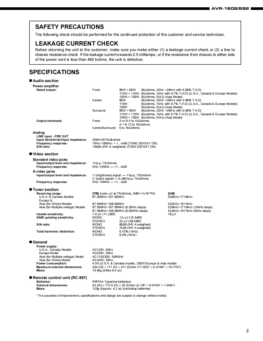 DENONFor U.S.A.,Canada,Europe,Asia,China,Hong KongTaiwan R.O.C.modelHi-Fi ComponentSERVICE MANUALMODEL AVR-1802/882AV SURROUND RECEIVERDENON显猫尚西号DTS回95666666606o吕占百台吕当芦回@@回O层豆四冒吉DENONSome illustrations using in this service manual are slightly different from the actual set.NIPPON COLUMBIA CO,LTD.14-14,AKASAKA 4-CHOME,MINATO-KU,TOKYO 107-8011 JAPANTelephone:03 (3584)8111X01171174N@0109