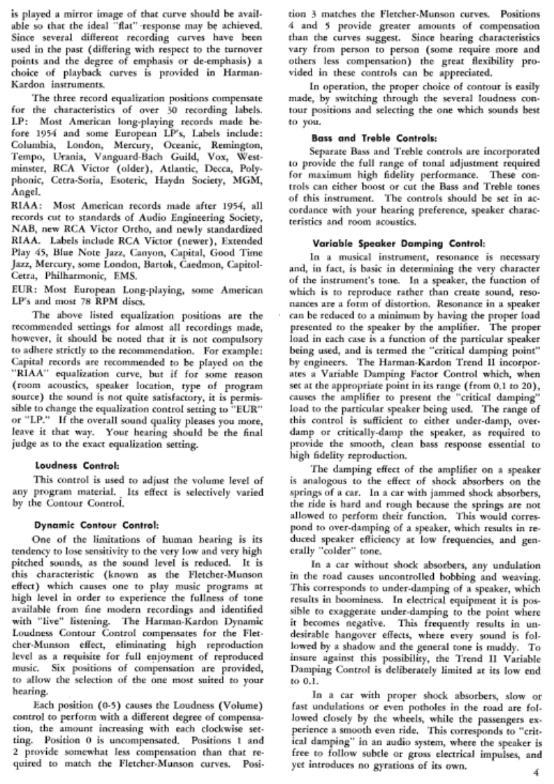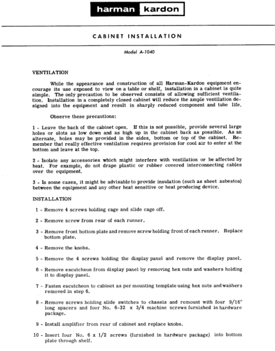 harmankardonTiend IM00ELA-1040CUSTOM HIGH FIDELITY AMPLIFIEROPERATION AND SERVICE INSTRUCTIONSIMPORTANTsubjected to many inspections and tests prior to pack.It is essential you read this instruction booking.If damage is visible,notify your dealer immedi-carefully hefore setting up your Harman-Kardon sys.ately.If the unit was shipped to you,notify the trans-tem.You have invested in a fine instrument into whichportation company at once.many excellent engineering developments have beenCheck the contents of the carton carefully.Beincorporated.Each is important for the proper opera-sure to inspect the folds of the packing material beforetion of your system.This book has been written indiscarding it.Your package should contain:simple nontechnical language and if you will take the1 Trend II,Mode!A-1040time to read it first before doing anything else you1Instruction Bookletwill find it simple to obtain optimum performance1Warranty Cardfrom your Trend Il.1 Template and Cabinet Installation InstructionsWe especially call your attention to UNDER THE1 Package Mounting HardwareCHASSIS CONTROLS,pages 5 and 6 with special em-It is strongly urged that the warranty card be com-phasis to the following paragraphs.pleted and mailed without delay,to protect your rightsVariable Speaker Damping Control.under warranty.If you should require repair serviceHum Bucking Control.or information on the use of your high fidelity instru.These controls must be properly adjusted prior toment,we will be able to identify your unit immediately,permanent installation of the instrument!and respond quickly.NOTE:To expedite service,UNPACKINGwhen necessary,please contact Harman-Kardon first.We will suggest a warranty station in your area andAfter unpacking the Trend II,inspect it care.give you the proper procedure and authorization forfully for signs of damage in transit.Your unit wasshipping.COPYRIGHT 1956 in U.S.A.and CANADA by HARMAN-KARDON,Ine.ALL RIGHTS XESERVED