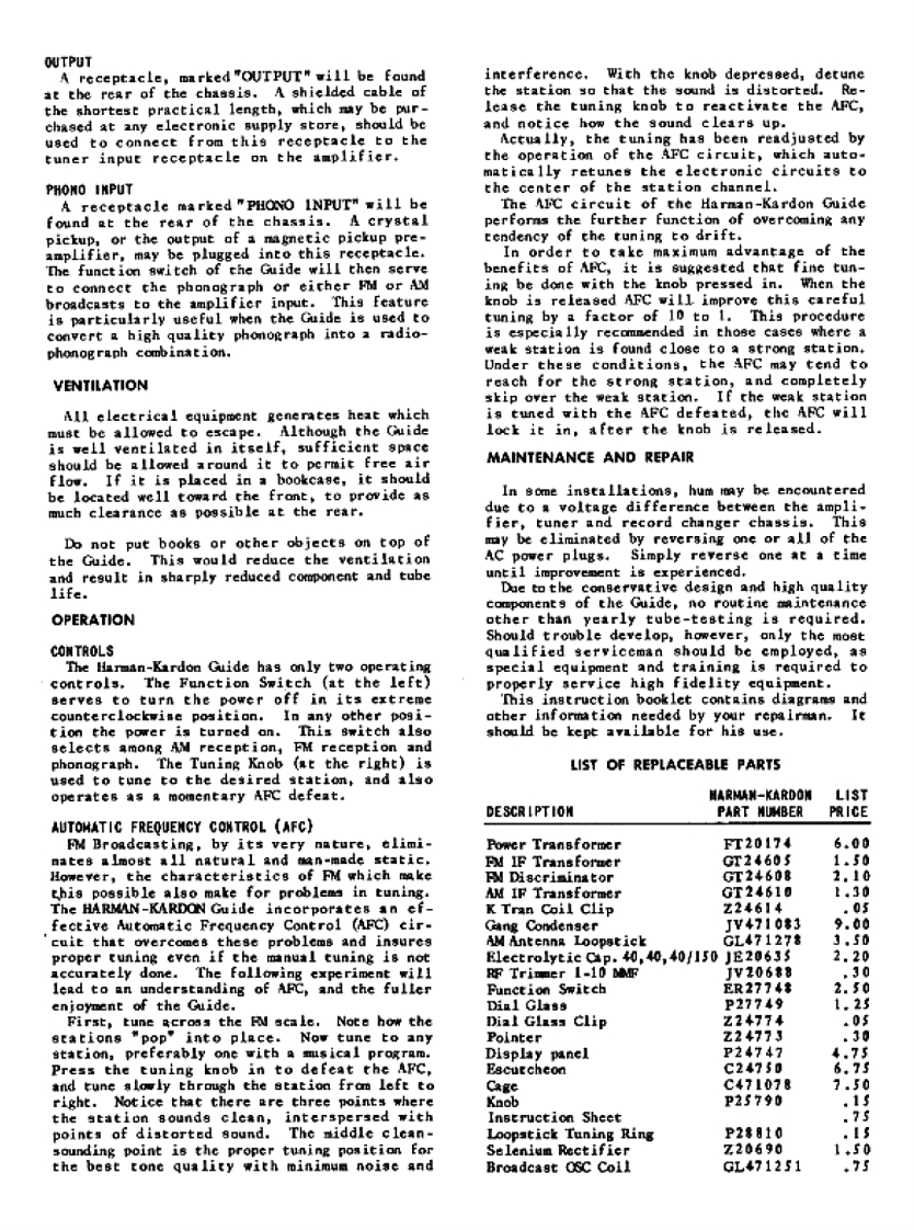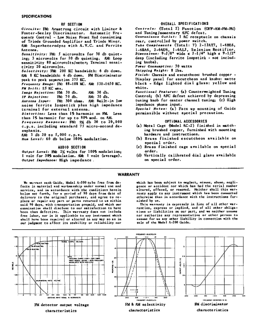 harmankardonMODEL-A200The GaideHIGH FIDELITY AM-FM TUNEROPER ATIO N AN D S ERV I CE INST RUC T I O NSUNPACKINGAfter unpacking the Guide,inspect it care-FM ANTENNAfully for any signs of damage in transit.YourA short length of ordinary wire,connected tounit was subjected to many inspections and tests,the terminal narked FM vill prove adequate inand then carefully packed.If any damage ismost installations.A loop of wire,approxi-visible,notify the transportation company atmately 36 inches long,connected between "PMonce.and "G and hung inside the cabinet will proveCheck the contents of the package carefully.useful in increasing the rejection of spuriousYou should find:signala.In those situations requiring an ex-1 Tuner,ModeI A-200ternal FM antenna,comnection should be made】Inatruction Bookletbetween "G"and "Fr.A single dipole will be1肠rranty Carduseful when stations to be received are locatedIt is strongly urged that the warranty card bein opposite directions from each other.A non-completed and mailed without delay,to protectdireetional dipole should be used if the sta-your rights under the warranty.If you shouldtions are located in dispersed directions.Arequire repair service or information on the usefolded dipole antenna with reflector will pro-of the Guide,we will be able to identify yourvide naximun efficiency and nay increase theunit immediately,and respond quiekly.number of distant FM stations your A-200 canreceive.CONNECTIONSPOVERAM ANTEKHAPlug the power cord into any outlet furnish-The Harman-Kardon ceramic loopstick,builting 117 volts,60 cycles house current.Theinto the Guide,conprises all the antenna re-exact roltage is relatively unimportant,and myquired for the finest in noise-free local AMvary between 105 and 125.Be sure,however,reception.In locations more removed fron metro-that you have 60 cyele Ac power.For many in-politan area8,an outdoor antenna may be re-stallations,such as with the MELODY Modelquired.This should comsist of a single wire,C100 Amplifier,it will be more convenient,fromas long as is reasonably practical,located awayan operational point of view,to plug the powerfrom large metal obiects,powor lines or elec-cord of the Guide into the convenience outletstrical machinery.Connect one end to the AMprovided on the amplifier chassis.The tunerterminal of the ANTENNA terminal strip on thewill then be turned on or off by the amplifierrear of the chassis.power switch.HARMAN-KARDON INC.520 MAIN STREET,WESTBURY,L.L.,N.Y.