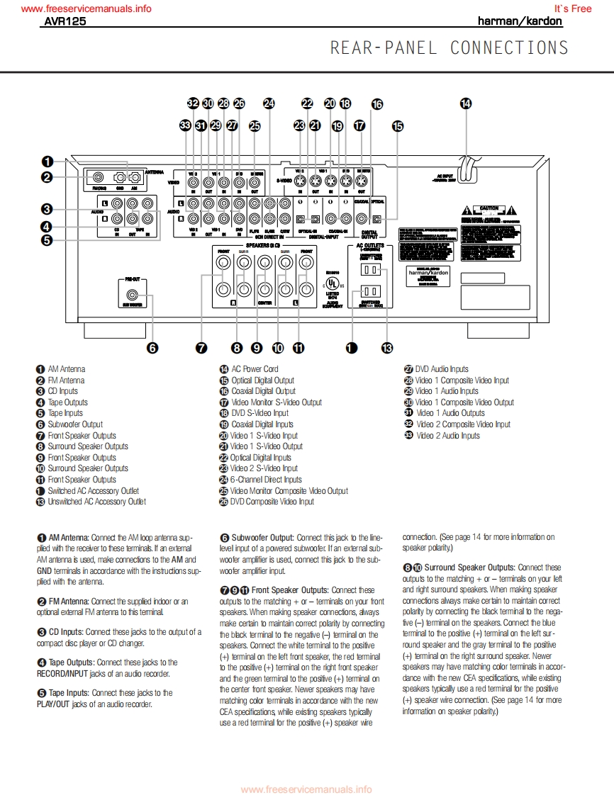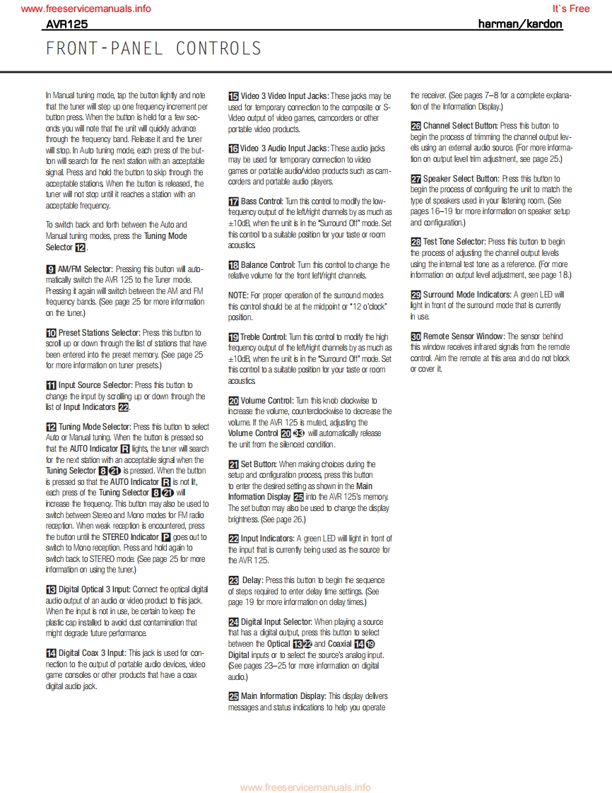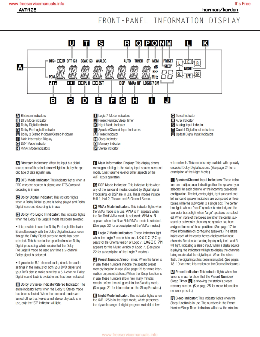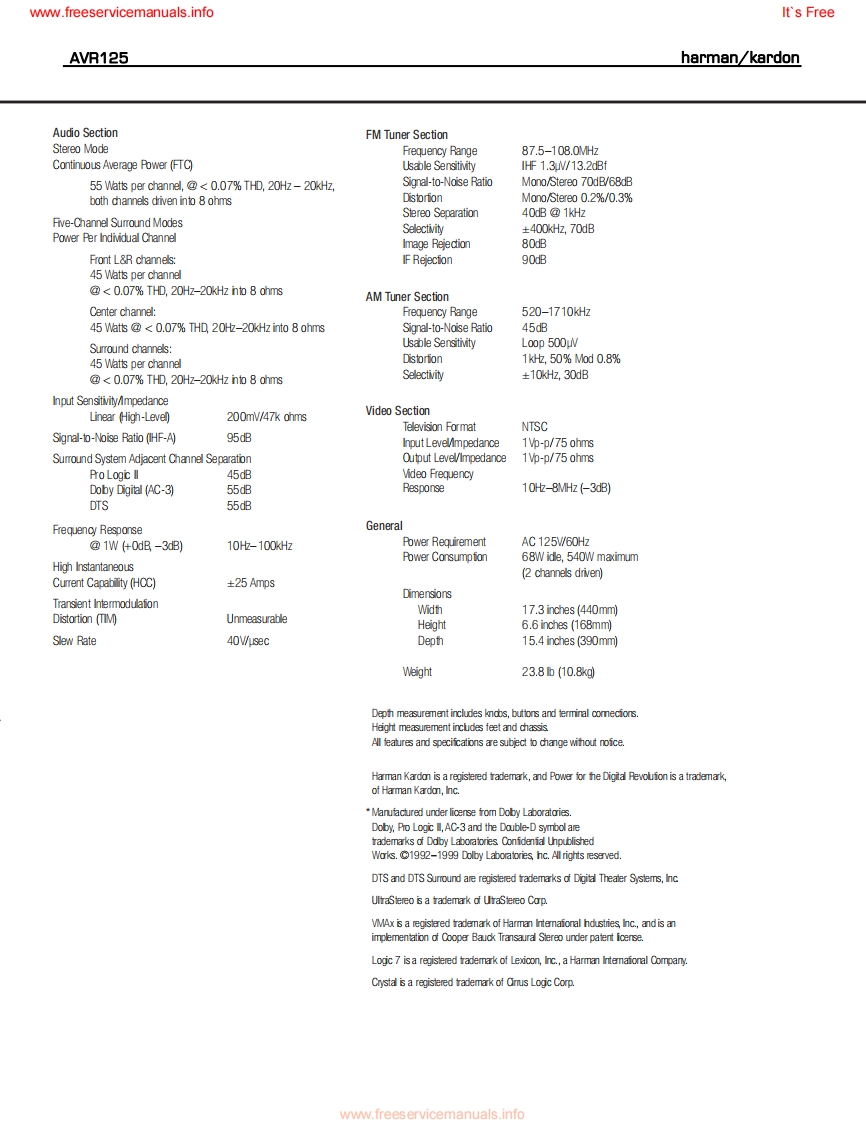 www.freeservicemanuals.infoIt's Freeharman/kardonAVR125AV DOLBY DIGITAL RECEIVERSERVICE MANUALharman/kardon AVR12500CONTENTSESD WARNING.......2DISASSEMBLY PROCEDURE...............18LEAKAGE TESTING.......3AMPLIFIER BIAS ADJUSTMENT............21BASIC SPECIFICATIONS...4BLOCK DIAGRAM.….22FRONT PANEL CONTROLS................5IC PINOUTS..23FRONT PANEL DISPLAY......7TRANSISTOR PINOUTS.................5.2REAR PANEL CONNECTIONS.................9ELECTRICAL PARTS LIST..................53REMOTE CONTROL FUNCTIONS.............11PCB DRAWINGS....62INSTALLATION AND CONNECTIONS........14SCHEMATICS...........70TROUBLESHOOTING GUIDE..................16WIRING DIAGRAM.......82MICROPROCESSOR RESET............16PACKAGING..........83UNIT EXPLODED VIEW...................17harman/kardon,Inc.250 Crossways Park Dr.Woodbury,New York 11797Rev52/2005www.freeservicemanuals.info