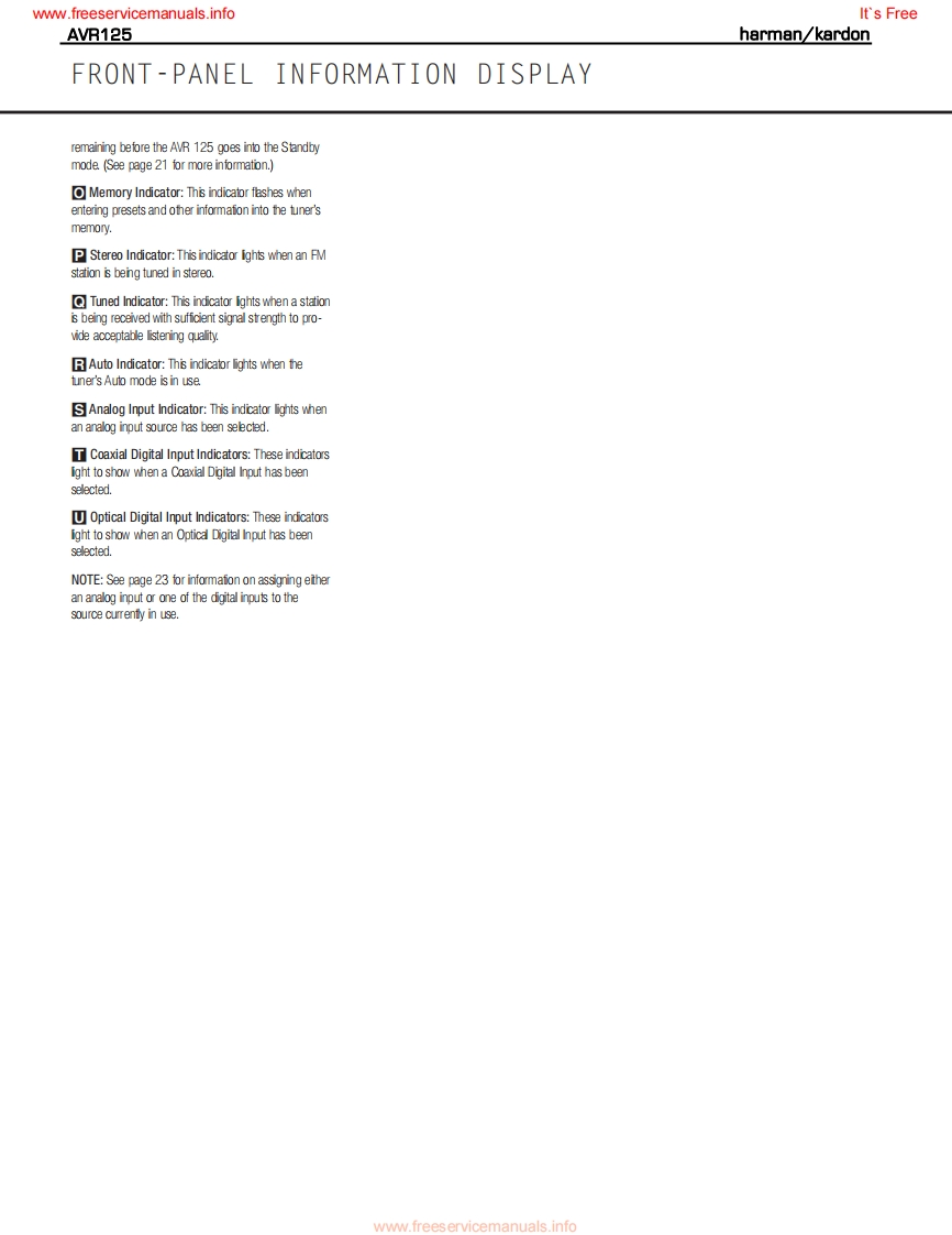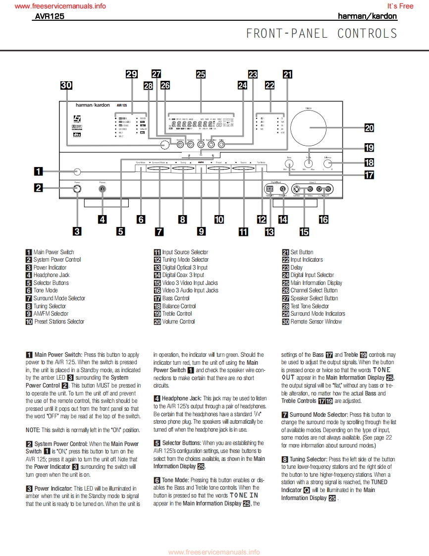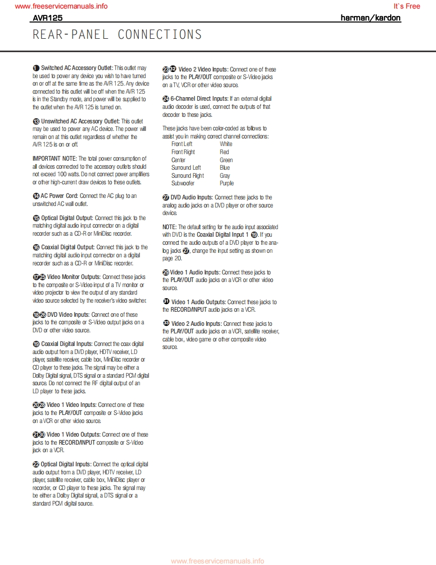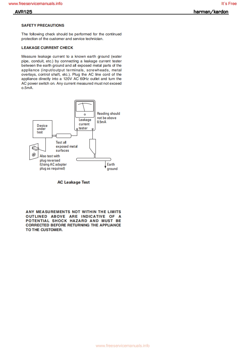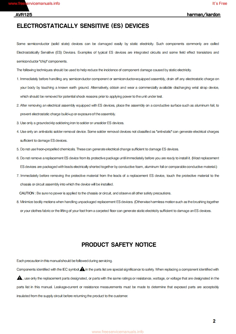 www.freeservicemanuals.infoIt's Freeharman/kardonAVR125AV DOLBY DIGITAL RECEIVERSERVICE MANUALharman/kardon AVR12500CONTENTSESD WARNING.......2DISASSEMBLY PROCEDURE...............18LEAKAGE TESTING.......3AMPLIFIER BIAS ADJUSTMENT............21BASIC SPECIFICATIONS...4BLOCK DIAGRAM.….22FRONT PANEL CONTROLS................5IC PINOUTS..23FRONT PANEL DISPLAY......7TRANSISTOR PINOUTS.................5.2REAR PANEL CONNECTIONS.................9ELECTRICAL PARTS LIST..................53REMOTE CONTROL FUNCTIONS.............11PCB DRAWINGS....62INSTALLATION AND CONNECTIONS........14SCHEMATICS...........70TROUBLESHOOTING GUIDE..................16WIRING DIAGRAM.......82MICROPROCESSOR RESET............16PACKAGING..........83UNIT EXPLODED VIEW...................17harman/kardon,Inc.250 Crossways Park Dr.Woodbury,New York 11797Rev52/2005www.freeservicemanuals.info