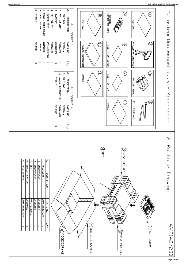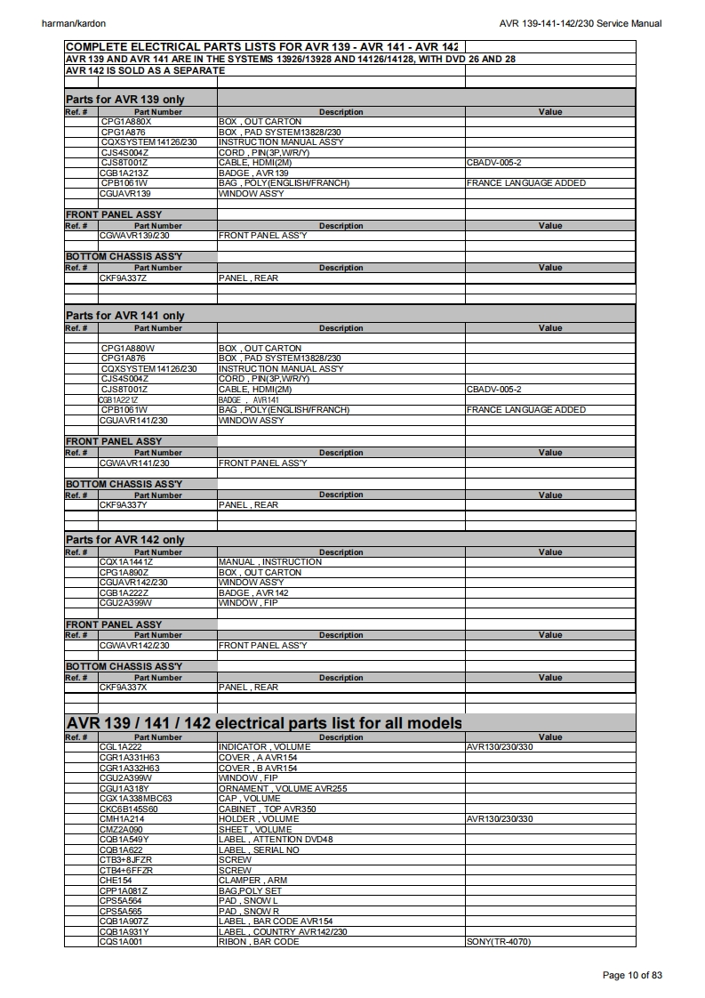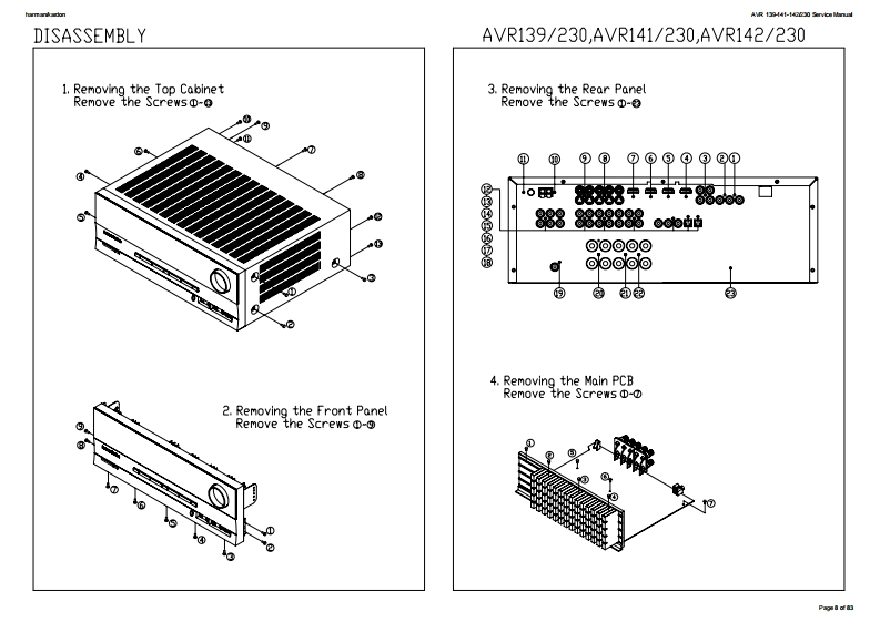 harman/kardonService ManualAVR139/230AVR141/230AVR142/2305 x 40W 5.1 CHANNEL A/V RECEIVERWR围·m:DWB/ANALOGLOGIC 7 5CH CIharman/kardonCONTENTSESD WARNINGELECTRICAL PARTS LIST10BASIC SPECIFICATIONS3IC LISTTROUBLESHOOTING GUIDE4SEMICONDUCTOR PINOUTS3PROCESSOR RESET4PCB DRAWINGSPACKAGE LISTS AND PARTS5BLOCK DIAGRAM74DISASSEMBLY8WIRING DIAGRAM75EXPLODED VIEW AND PARTS9AMP BIAS ADJUSTMENT76SCHEMATIC DIAGRAMS77-83Released EU2009Harman Consumer Group,Inc.Rev0,04/20098500 Balboa BoulevardNorthridge,California 91329