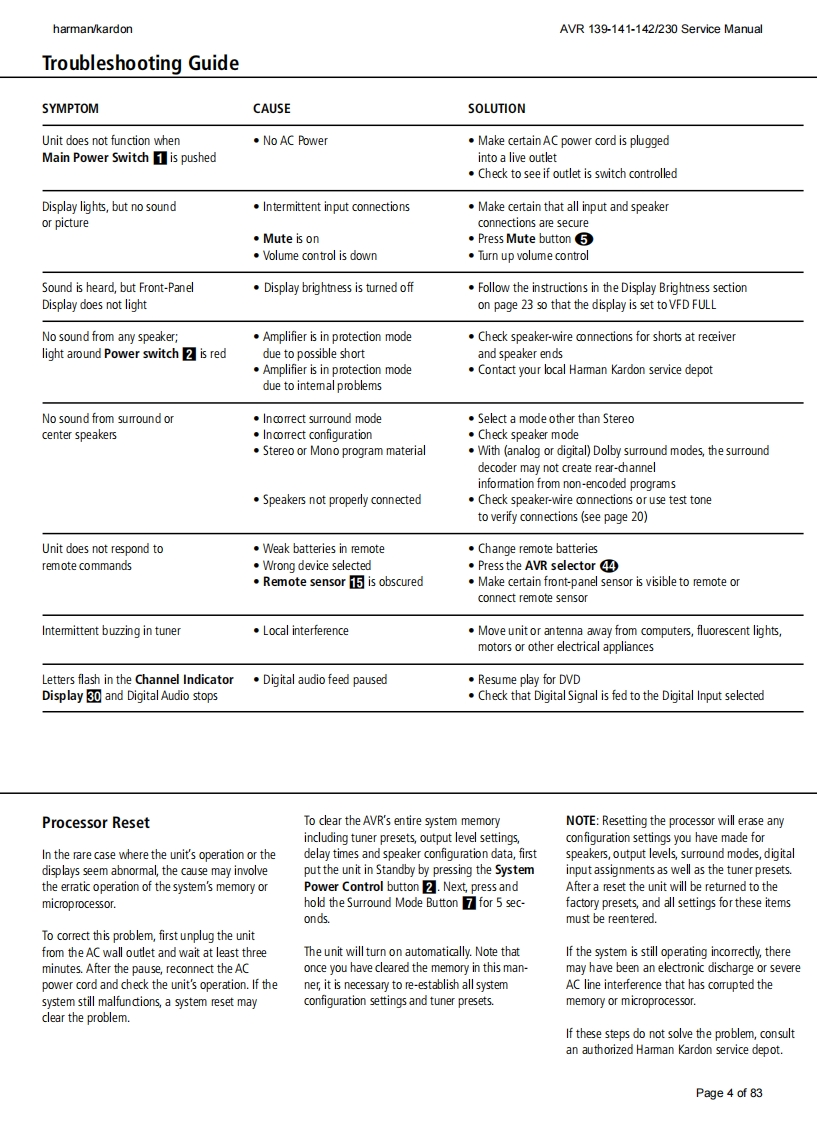 harman/kardonService ManualAVR139/230AVR141/230AVR142/2305 x 40W 5.1 CHANNEL A/V RECEIVERWR围·m:DWB/ANALOGLOGIC 7 5CH CIharman/kardonCONTENTSESD WARNINGELECTRICAL PARTS LIST10BASIC SPECIFICATIONS3IC LISTTROUBLESHOOTING GUIDE4SEMICONDUCTOR PINOUTS3PROCESSOR RESET4PCB DRAWINGSPACKAGE LISTS AND PARTS5BLOCK DIAGRAM74DISASSEMBLY8WIRING DIAGRAM75EXPLODED VIEW AND PARTS9AMP BIAS ADJUSTMENT76SCHEMATIC DIAGRAMS77-83Released EU2009Harman Consumer Group,Inc.Rev0,04/20098500 Balboa BoulevardNorthridge,California 91329