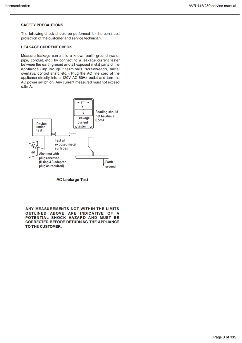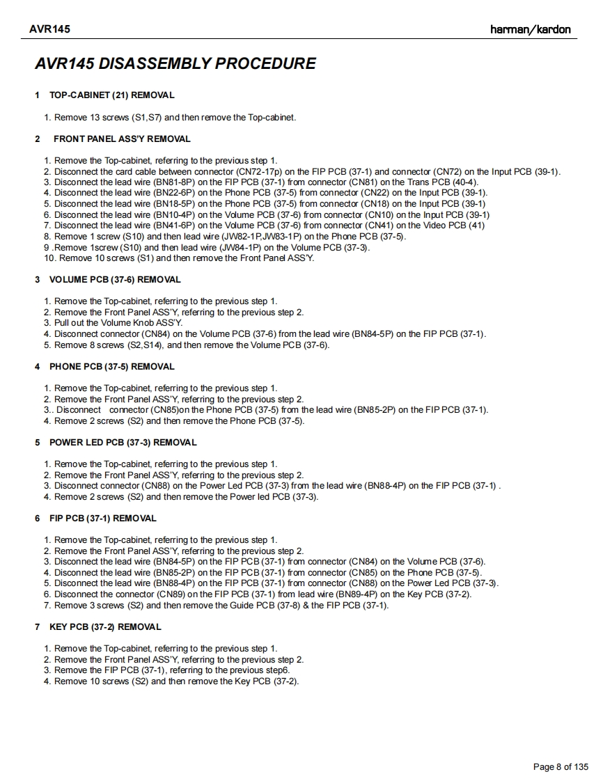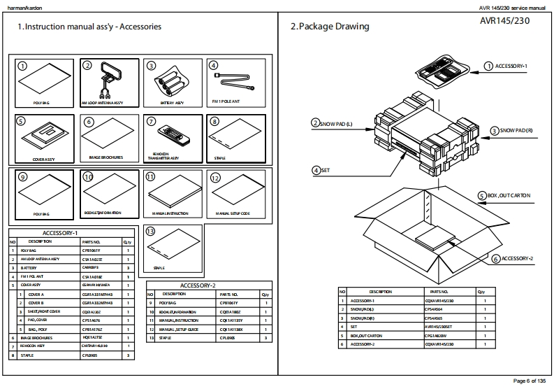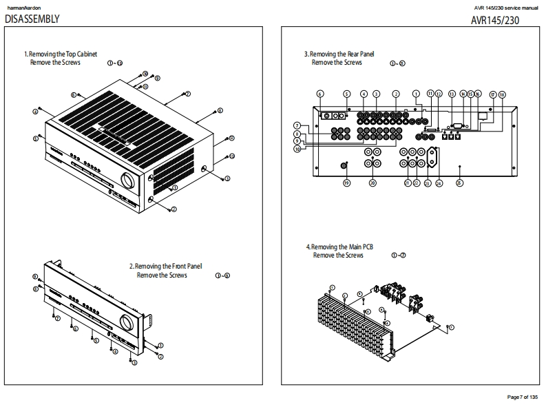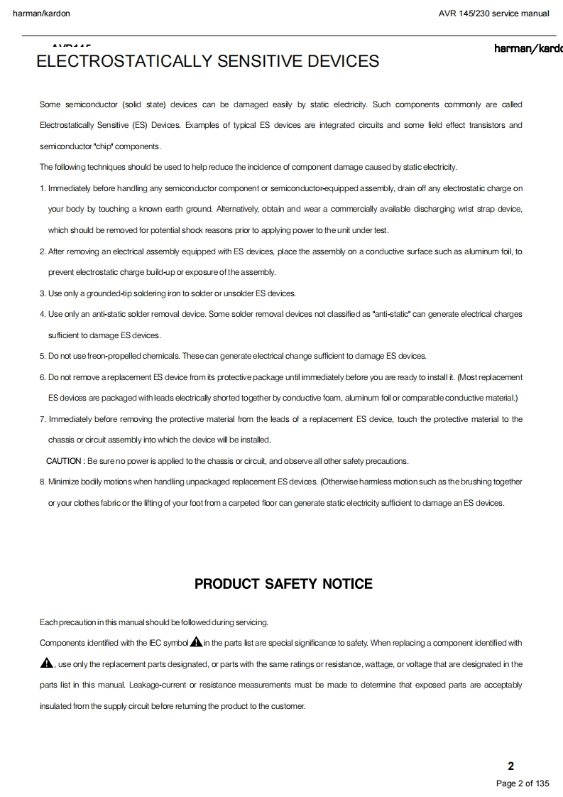 harman/kardonAVR 145/230 service manualharman/kardonAVR1455X 40W 5.1 CHANNEL AV RECEIVERSERVICE MANUAL解除g:DVD/C0A1回吕回LOGIC 7 5CH CI6do666dharman/kardonCONTENTSESD WARNING.…nELECTRICAL PARTS LIST....12LEAKAGE TESTING.........3SEMICONDUCTOR PINOUTS4BASIC SPECIFICATIONS.........gPCB DRAWINGS...119TROUBLESHOOTING GUIDE.....SBLOCK DIAGRAM.126PROCESSOR RESET.............①WIRING DIAGRAM..127PACKAGE LIST AND PARTS.......6AMP BIAS ADJUSTMENT128DISASSEMBLYSCHEMATIC DIAGRAMS.......129UNIT EXPLODED VIEW AND PARTS 11Released 2007Discontinued XXXXRev0,102007harman/kardon,Inc.250 Crossways Park Dr.Woodbury,New York,11797Page 1 of 135