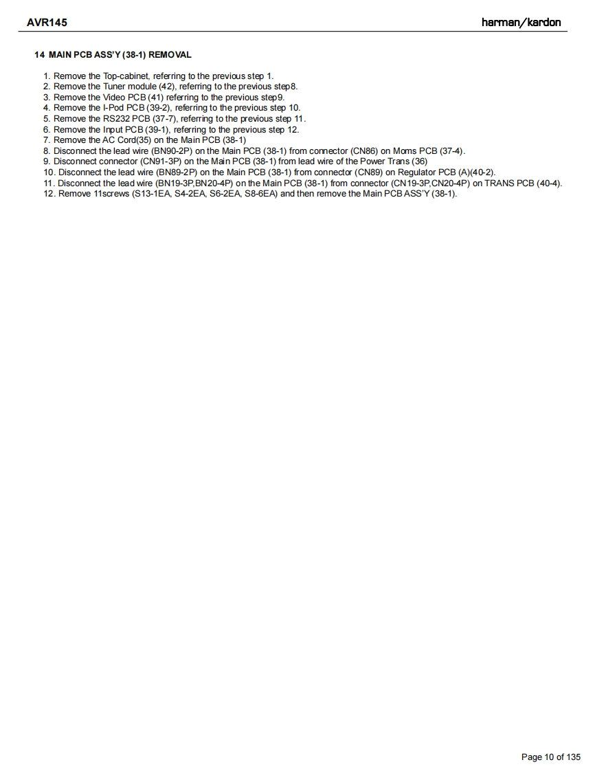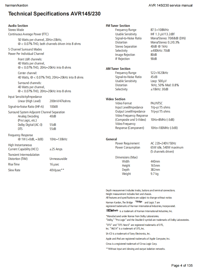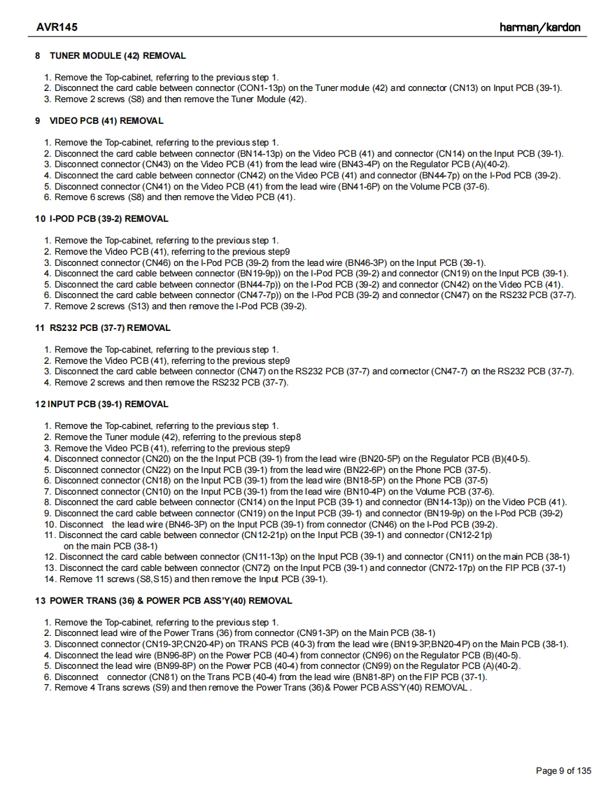harman/kardonAVR 145/230 service manualharman/kardonAVR1455X 40W 5.1 CHANNEL AV RECEIVERSERVICE MANUAL解除g:DVD/C0A1回吕回LOGIC 7 5CH CI6do666dharman/kardonCONTENTSESD WARNING.…nELECTRICAL PARTS LIST....12LEAKAGE TESTING.........3SEMICONDUCTOR PINOUTS4BASIC SPECIFICATIONS.........gPCB DRAWINGS...119TROUBLESHOOTING GUIDE.....SBLOCK DIAGRAM.126PROCESSOR RESET.............①WIRING DIAGRAM..127PACKAGE LIST AND PARTS.......6AMP BIAS ADJUSTMENT128DISASSEMBLYSCHEMATIC DIAGRAMS.......129UNIT EXPLODED VIEW AND PARTS 11Released 2007Discontinued XXXXRev0,102007harman/kardon,Inc.250 Crossways Park Dr.Woodbury,New York,11797Page 1 of 135