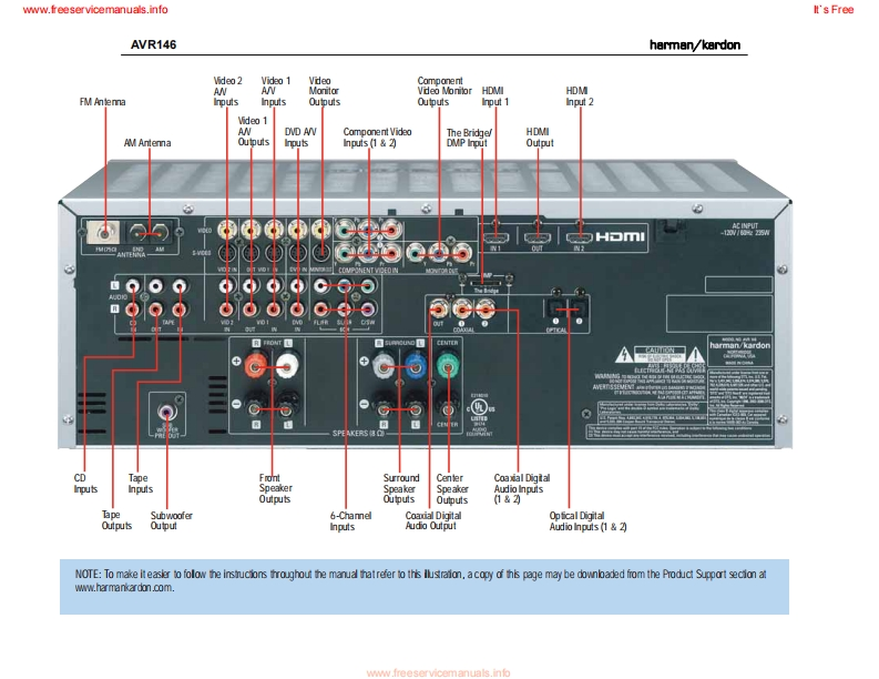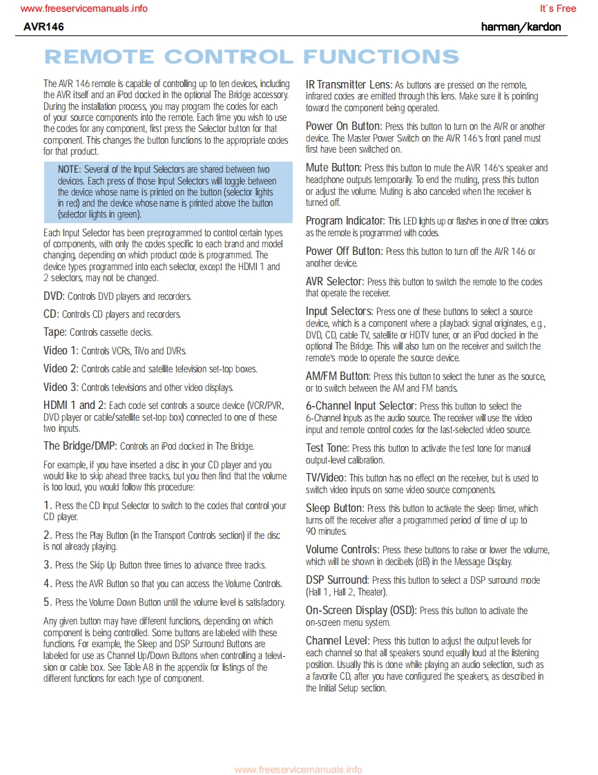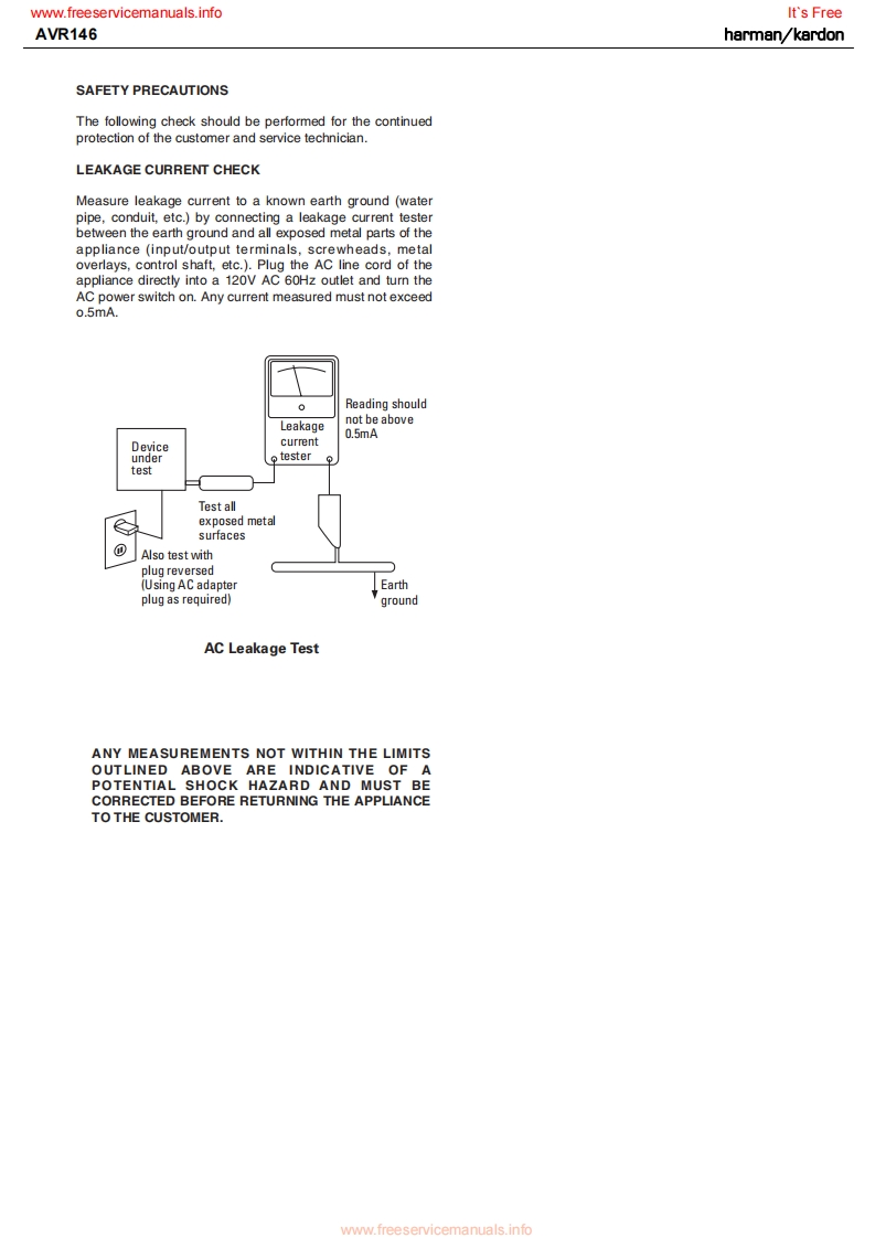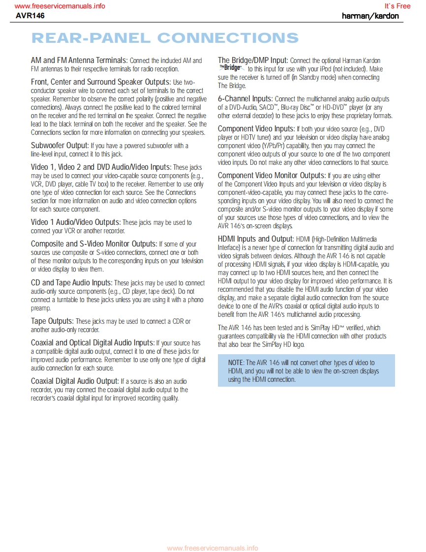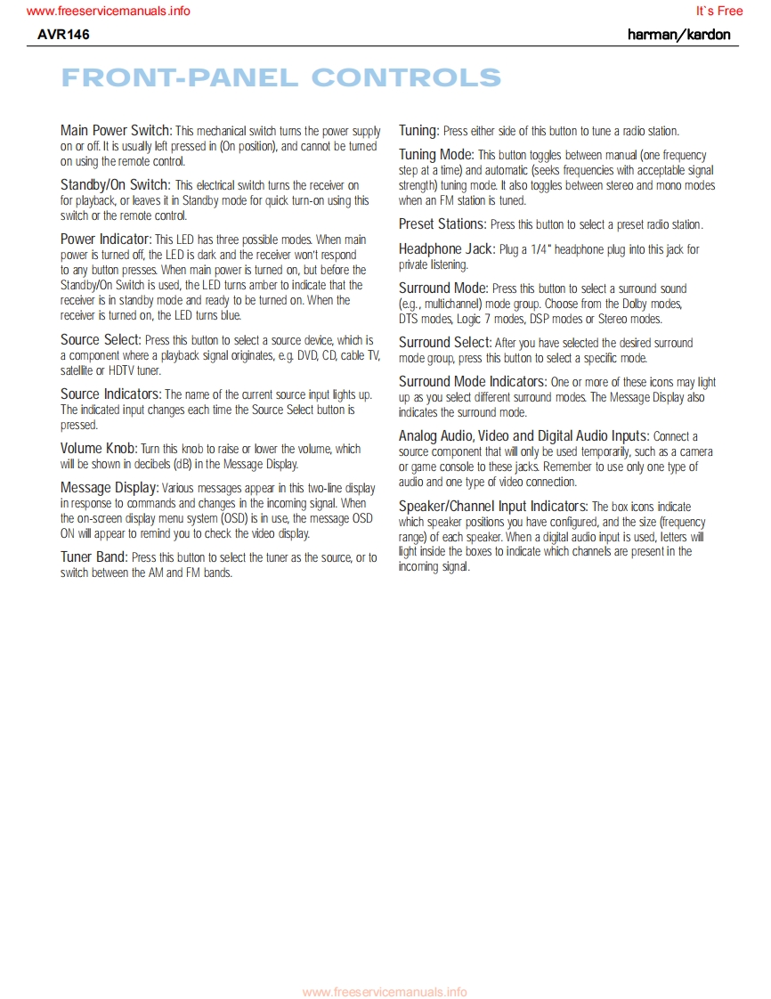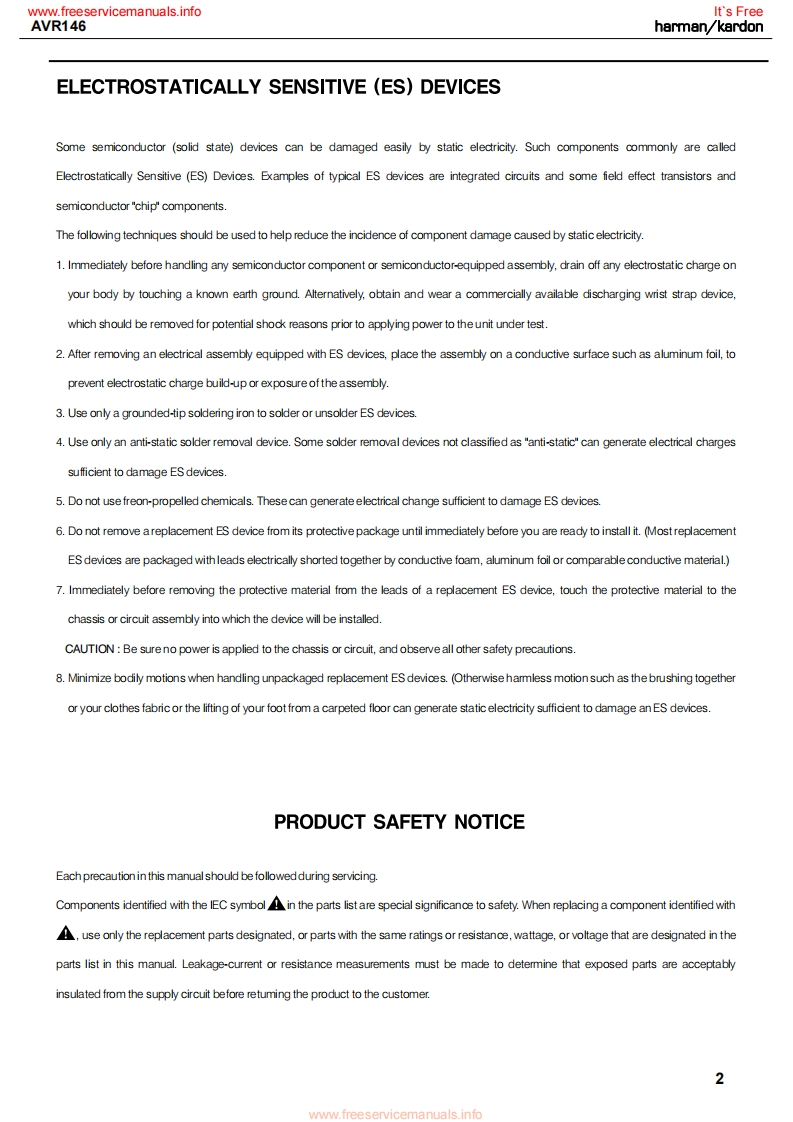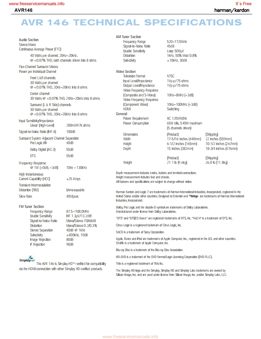 www.freeservicemanuals.infoIt's Freeharman/kardonAVR1465 X 30W 5.1 CHANNEL AV RECEIVERSERVICE MANUALAVR Gnun/舟州AL0省四日国LOGIC 7 5CH CIharman/kardon··w⊙⊙CONTENTSESD WARNING..2DISASSEMBLY.3LEAKAGE TESTING.....................3UNIT EXPLODED VIEW...................35BASIC SPECIFICATIONS..................4EXPLODED VIEW PARTS LIST...............36PACKAGING......5AMP BIAS ADJUSTMENT.....................37FRONT PANEL CONTROLS................6BLOCK DIAGRAM............................38REAR PANEL CONNECTIONS...............8PcB DRAWINGS..39REMOTE CONTROL FUNCTIONS..........10ELECTRICAL PARTS LIST...8CONNECTIONS/INSTALLATION...........13SEMICONDUCTOR PINOUTS..............8OPERATION..........23SCHEMATICS.164TROUBLESHOOTING GUIDE.................9WIRING DIAGRAM...........................172REMOTE PROCESSOR RESETS..........30haman/kardon,Inc.250 Crossways Park Dr.Released 2007Woodbury,New York 11797Rev06/2007Discontinued XXXXwww.freeservicemanuals.info