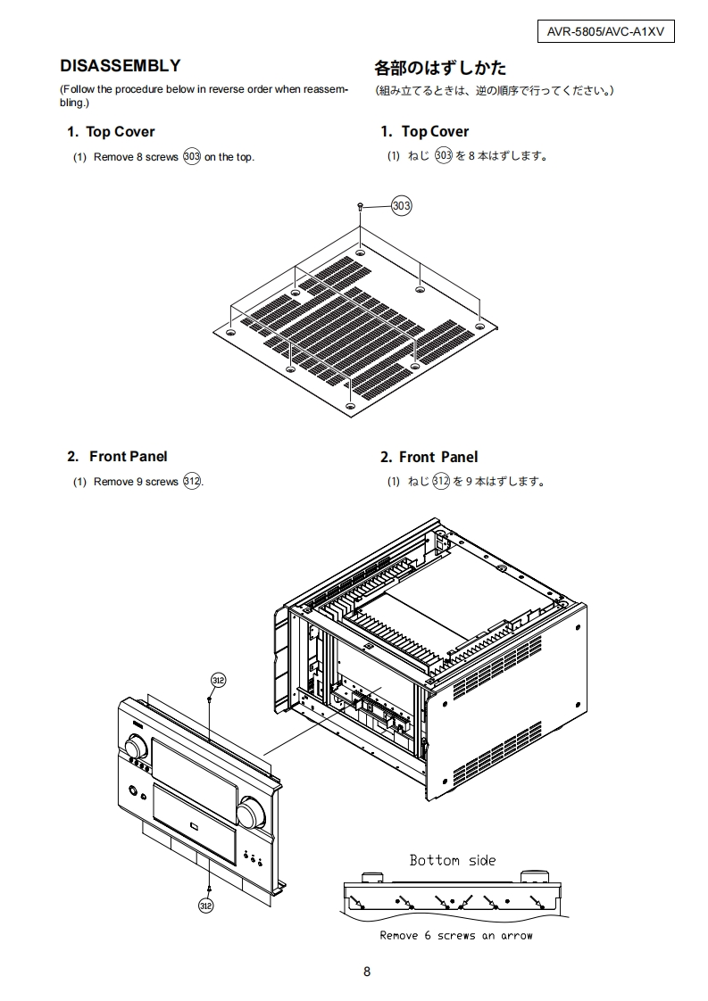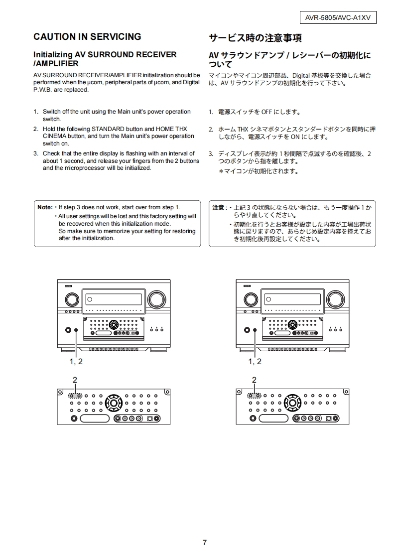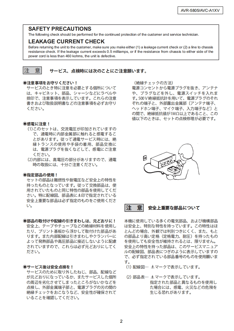 DENONFor U.S.A.Canada modelSERVICE MANUALVer.1MODEL AVR-5805AV SURROUND RECEIVER注意廿一七又在方乙存前、乙)廿一七又又二1了儿在必寸方蔬<龙过U。本機休、火災、感電、付存(仁对寸石安全性左確保寸石上忙、古未芒东存配虚苍乙存一乙訪、未左法的体「電氨用品安全法」屯上可老、所定)許可苍得(製造九(右)未寸。徙又力一上又卷右乙春際体、乙九5D安全性摊持老九石女、乙)廿一七又マ二ュ了儿記載志九乙小石注意事項在必寸方守)〈龙过。For purposes of improvement,specifications and●本機)仕横柱性能改良)龙协、予告在〈变更寸石乙上design are subject to change without notice.小态害寸。●補修用性能部品)保有期間志、製造打切後8年寸。Please use this service manual with referring to the●修理)際:、必寸取极脱明苦左参照)上、作業卷行一operating instructions without fail.(〈龙丈。Some illustrations using in this service manual are·本文中忙使用L(石亻与又卜仗、脱明)都合上現物slightly different from the actual set.上多少異在石場合扬)李寸。DENON,Ltd.TOKYO JAPANX0219-1V.01DECD☐0411