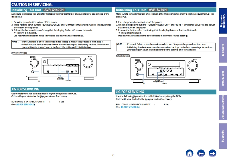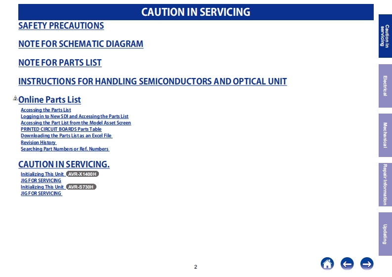 DENONService ManualVer.2INTEGRATED NETWORK AV RECEIVERAVR-X1400HClick here!On-line service parts listAVR-S730HuBLhttp:Mdmedia.dmglpbalcom/Document/DocumentDstails/23150Online Parts List (P5 to P7)On-line owner's manualDENONNA:http:M/ma nuals.denon.com/AVRX1400H/NA/EN index.phpAtmosB-ray-EU:http:/manua.ls.denon.comAYRX1400HELEN/index.phpAP:attp /manuals denon comAVBX1400HAP/ZHindex.phpNA:bttp:Mmanuals.denon.com/AVRS730H/NA/ENindex.p.hp9y9CAUTIONIN SERVICINGDENONELECTRICALEpatnosB-ray-MECHANICAL::;五点台8REPAIR INFORMATIONUPDATINGpurposes of improvement,specificaions and design are subject to change wthout no ticePlease use this service manual wth referring to the operating instructions without fal.Some ilustratons using in this service manual are slighdy dfferent fom the actual setPlease refer to the MODIFICATION NOTICE.