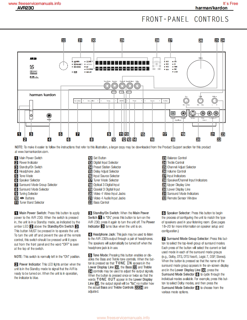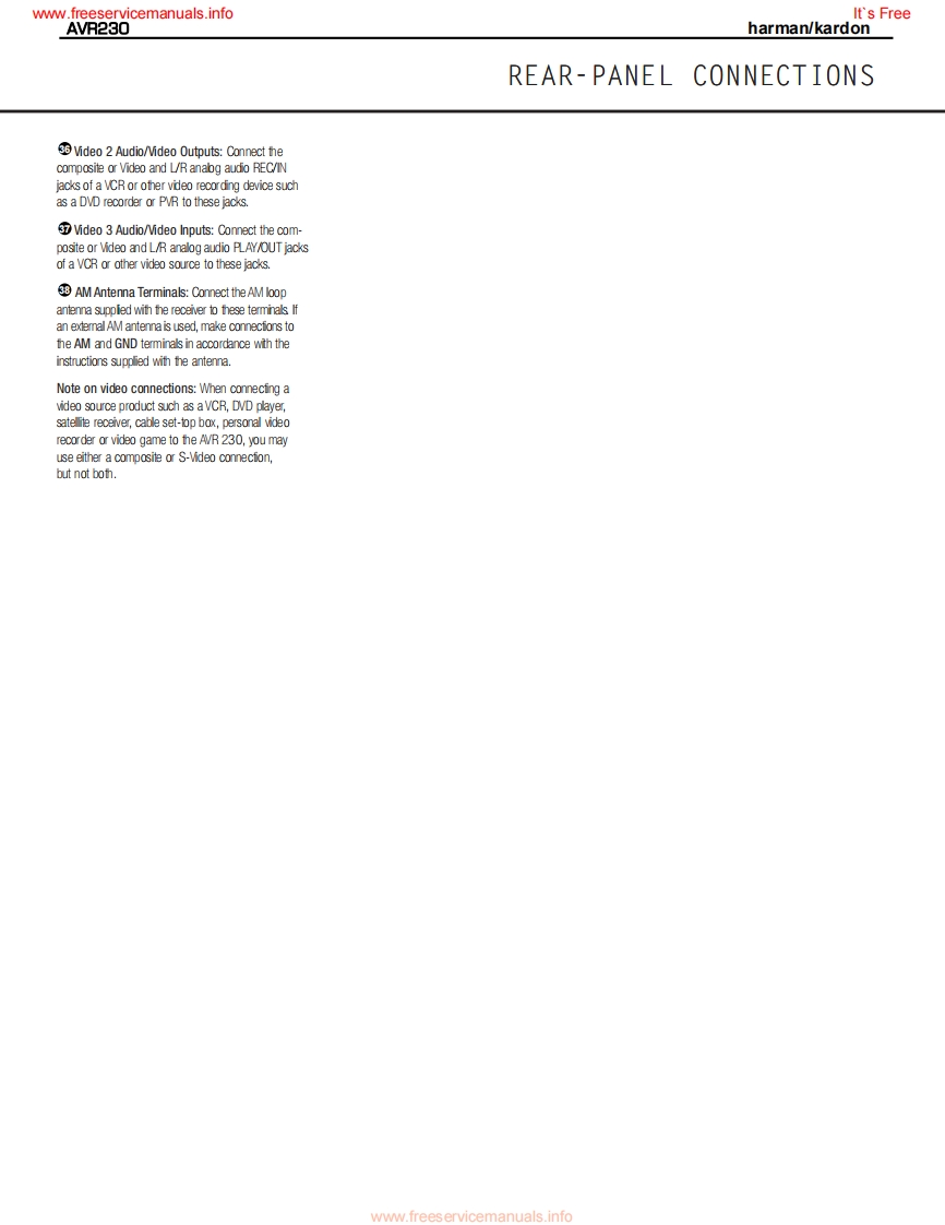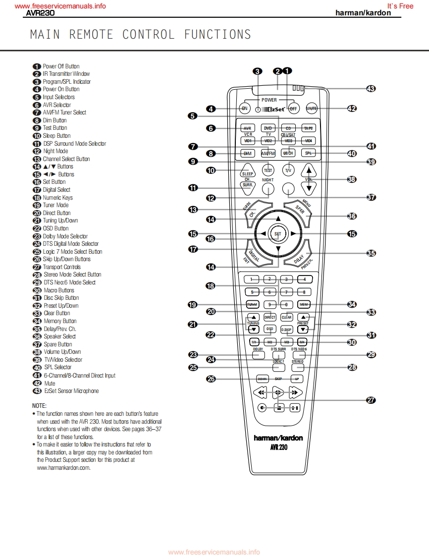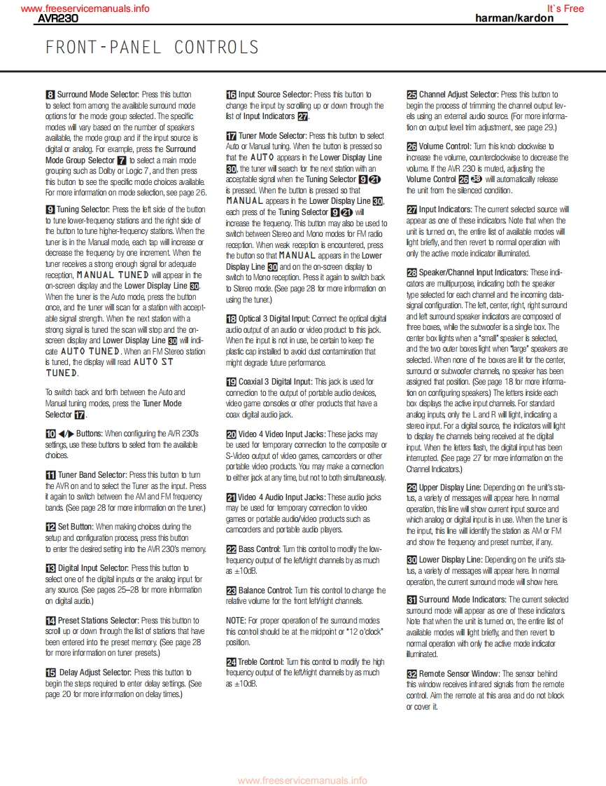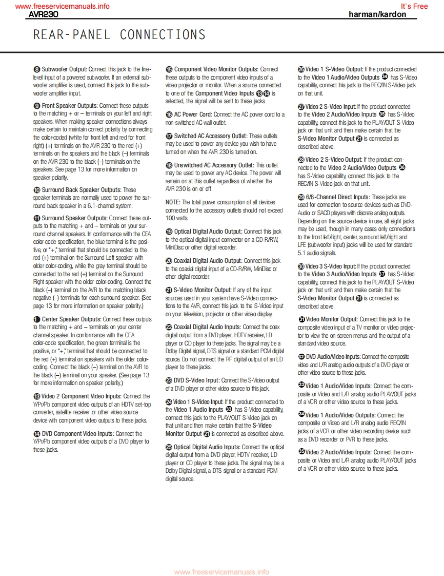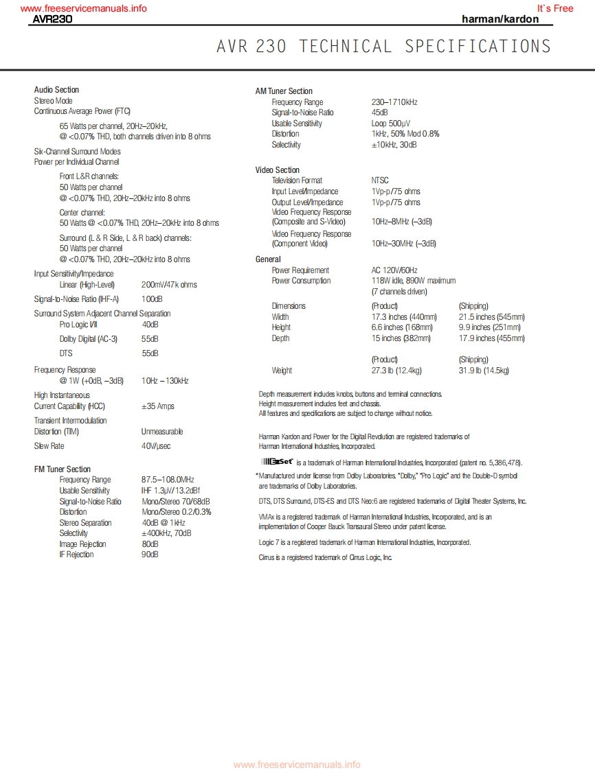 www.freeservicemanuals.infoIt's Freeharman/kardonAVR2306 X 50W 5.1/7.1 CHANNEL A/RECEIVERSERVICE MANUALR8测互DVD /COAX 1画DOLBY D EXa回ooog司harman/kardon⊙⊙0CONTENTSESD WARNING..2TECH TIP HKTT2003-01........................21LEAKAGE TESTING3UNIT EXPLODED VIEW....................22BASIC SPECIFICATIONS...…4BLOCK DIAGRAM...…23FRONT PANEL CONTROLS................5AMP BIAS ADJUSTMENT.....................24REAR PANEL CONNECTIONS.7PCB DRAWINGS.............25REMOTE CONTROL FUNCTIONS..........10ELECTRICAL PARTS LIST...................31TROUBLESHOOTING GUIDE...........3SEMICONDUCTOR PINOUTS.............67PROCESSOR RESET............13SCHEMATICS..108DISASSEMBLY..14WIRING DIAGRAM.........124BULLETIN HK2003-10..........................15PACKAGING.............125TECH TIP HKTT2004-03..........17harman/kardon,Inc.250 Crossways Park Dr.Woodbury,New York 11797Rev172005www.freeservicemanuals.info