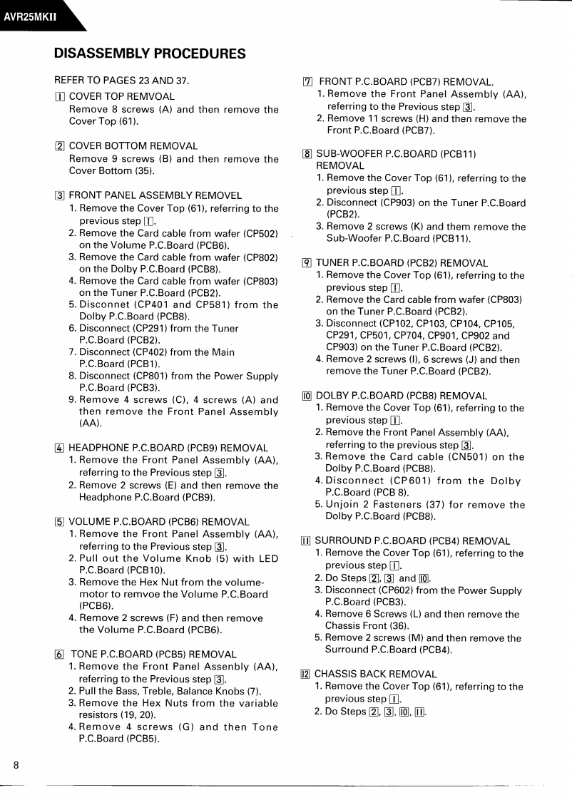 The Harman KardonModel AVR25MKIIAUDIO AND VIDEO RECEIVERTechnical Manualh.aman/kardon A饿5lVume①①①三且:8888888Eoconb00OCONTENTSSPECIFICATIONS…2GENERAL UNIT…23LEAKAGE TEST…4PRINTED CIRCUIT BOARDS…24BLOCK DIAGRAM…5ELECTRICAL PARTS LIST.............................26CONTROLS AND FUNCTIONS+6IC FUNCTIONAL BLOCK DIAGRAM4444…31DISASSEMBLY PROCEDURES........8WIRING DIAGRAM…37CIRCUIT DESCRIPTION................................10SCHEMATIC DIAGRAM (I)38ALIGNMENT PROCEDURES...........16SCHEMATIC DIAGRAM(I)⑩…39TROUBLESHOOTING…19SCHEMATIC DIAGRAM (III)..................40GENERAL UNIT PARTS LIST............22SCHEMATIC DIAGRAM (IV)..................41harman/kardonParts and Service Office80 Crossways Park West.Woodbury,N.Y.117971112-AVR25MKII G9604 1200 Printed in Korea