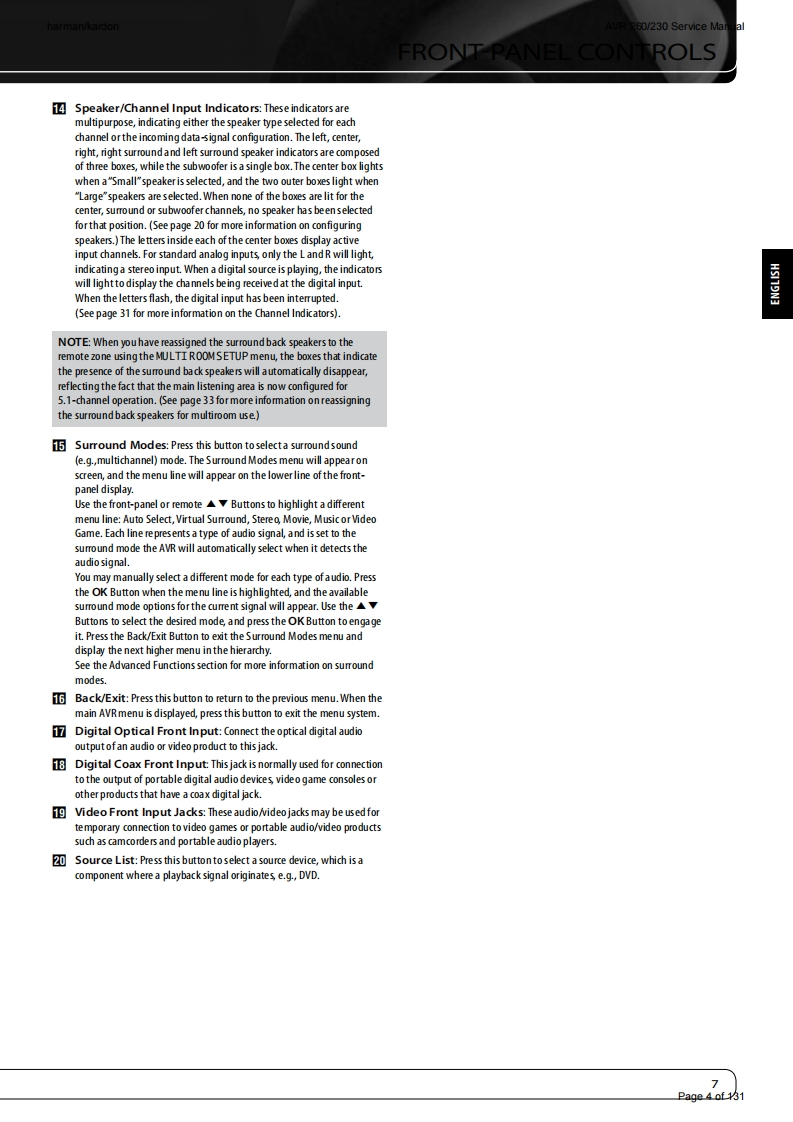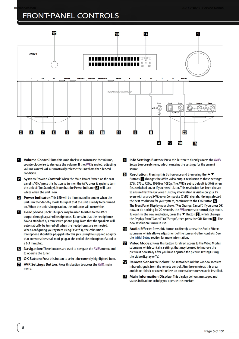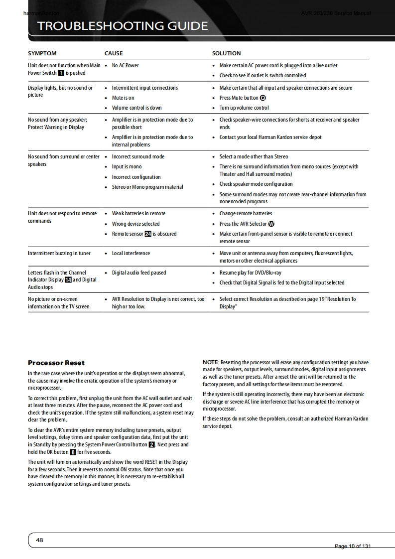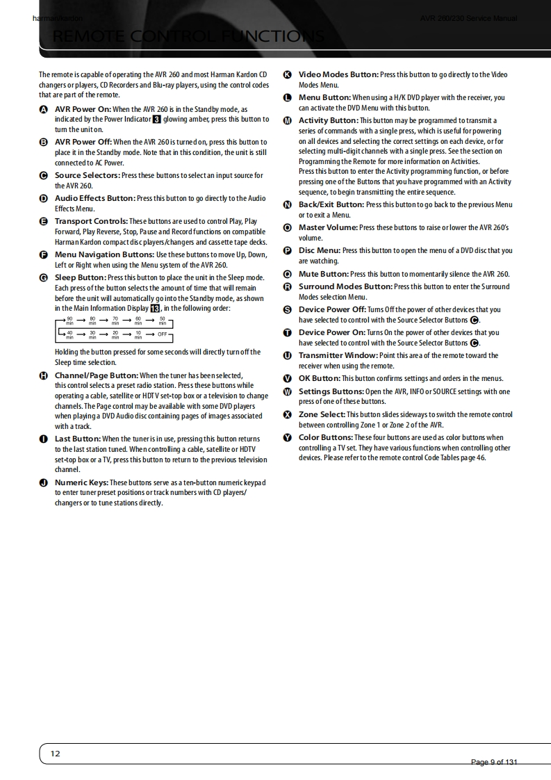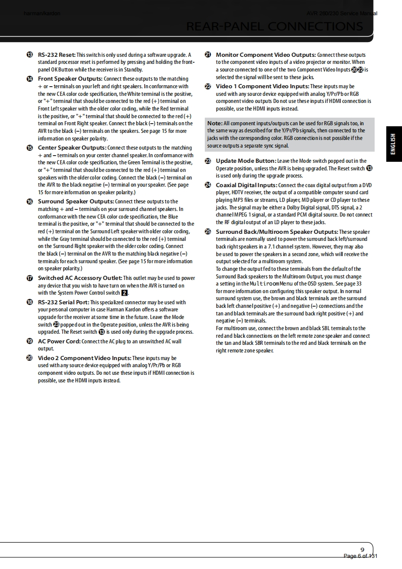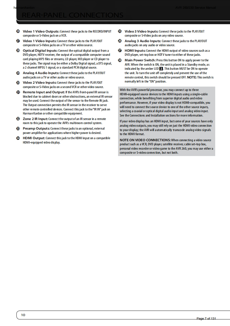 harman/kardonAVR 260/230 Service Manualharman/kardonService ManualAVR260/2307 x 50W 7.1 CHANNEL A/V RECEIVER圆GAME:ANA-4▣巴回LOGIC 7 GAMEharman/kardonCONTENTSESD WARNING2EXPLODED VIEW AND PARTS14FRONT AND REAR PANELS38ELECTRICAL PARTS LIST15REMOTE CONTROLSEMICONDUCTOR PINOUTS49TROUBLESHOOTING GUIDE10PCB DRAWINGS10PROCESSOR RESET10BLOCK DIAGRAM116BASIC SPECIFICATIONS11WIRING DIAGRAM117PACKAGE LISTS AND PARTS12AMP BIAS ADJUSTMENT118DISASSEMBLY13SCHEMATIC DIAGRAMS119-131Released EU2010Harman Consumer Group,Inc.Rev0,07/20108500 Balboa BoulevardNorthridge,California 91329Page 1 of 131