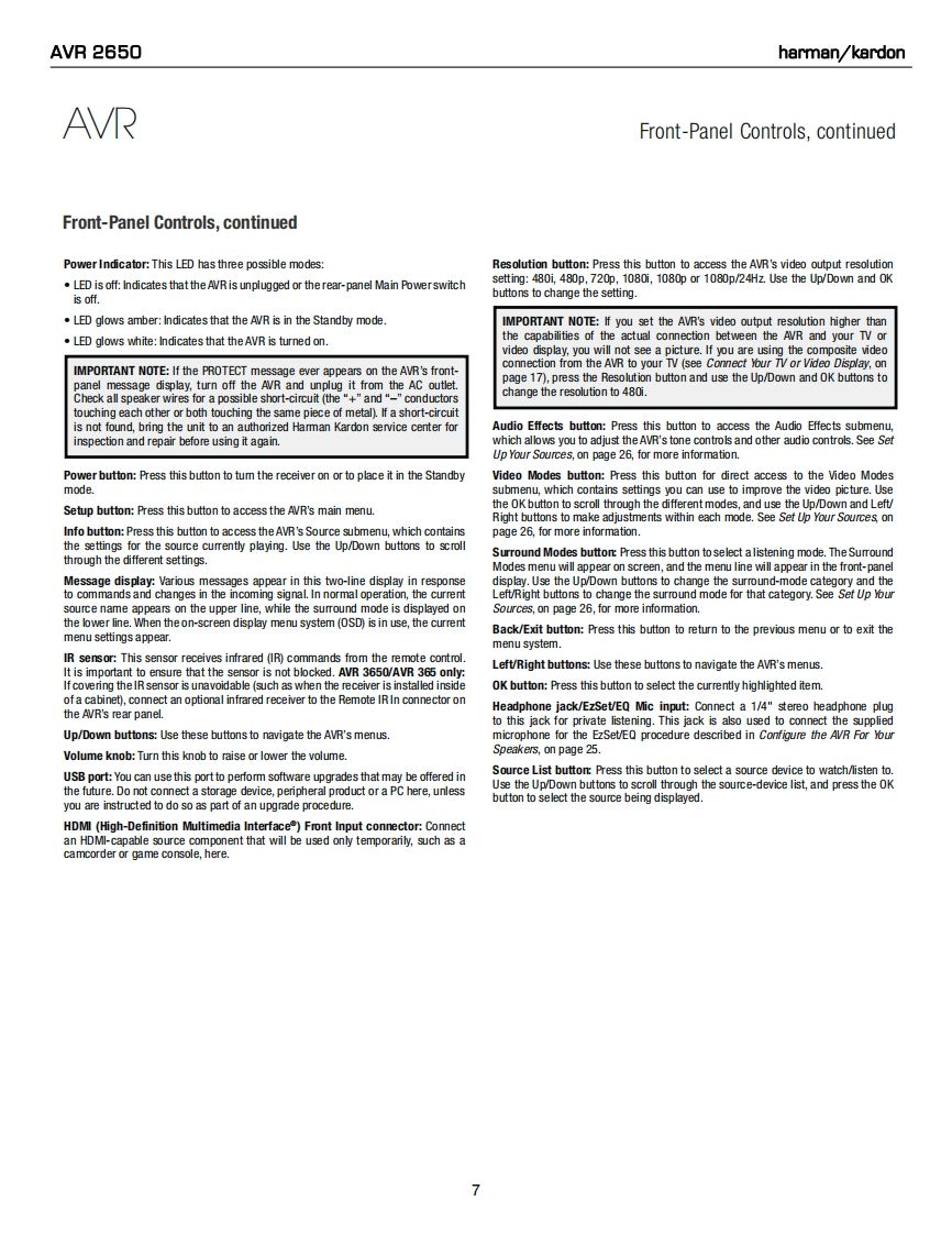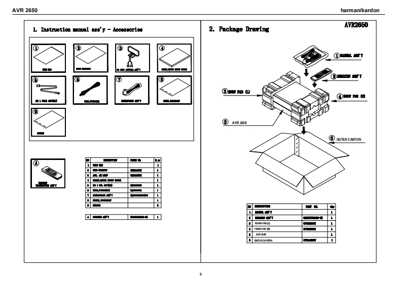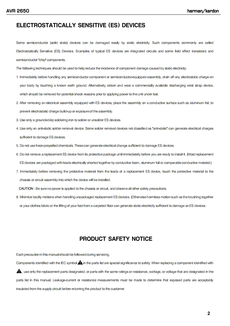harman/kardonAVR 26507X 95W 7.1 CHANNEL AV RECEIVERSERVICE MANUALAVR 2650CABLE/SATD0 LBY PLI×MOVIEharman/kardonCONTENTSESD WARNING..DISASSEMBLY......2LEAKAGE TESTING................3UNIT EXPLODED VIEW......................27BASIC SPECIFICATIONS.................4EXPLODED VIEWPARTS LIST...............8PACKAGING....5AMP BIAS ADJUSTMENT................9FRONT PANEL CONTROLS................6BLOCK DIAGRAM...30REAR PANEL CONNECTIONS.............8PCB DRAWINGS.............32REMOTE CONTROL FUNCTIONS..........10ELECTRICAL PARTS LIST.............47CONNECTIONS/INSTALLATION.............12SEMICONDUCTOR PINOUTS.............103OPERATION19SCHEMATICS...224TROUBLESHOOTING GUIDE..................24WIRING DIAGRAM.......................241REMOTE PROCESSOR RESETS..........25harman/kardon,Inc.Released 20118500 Balboa Blvd..Discontinued XXXXNorthridge,CA.91329Rev19/2011