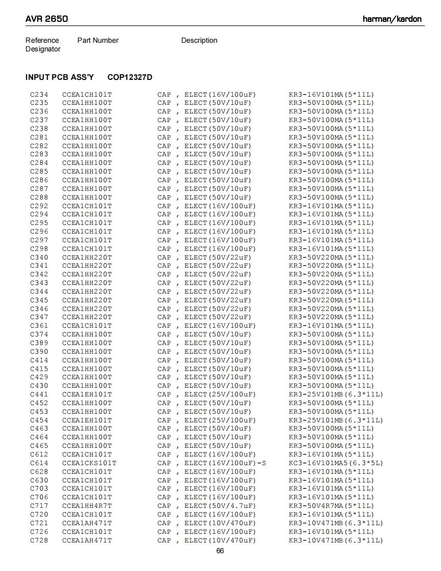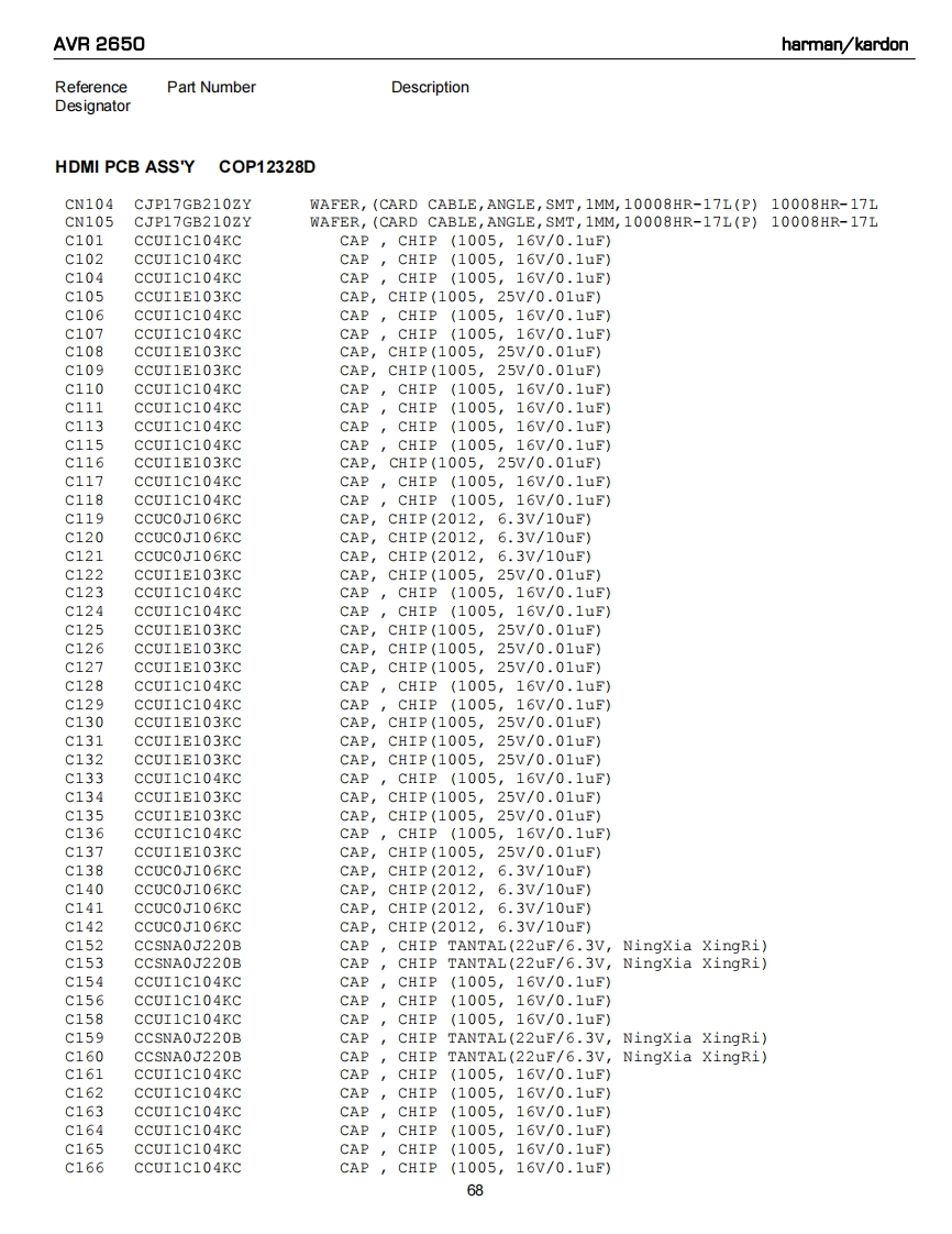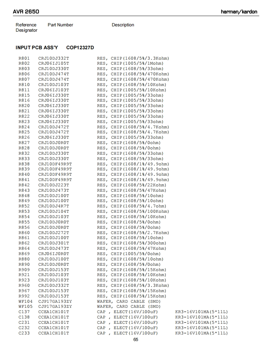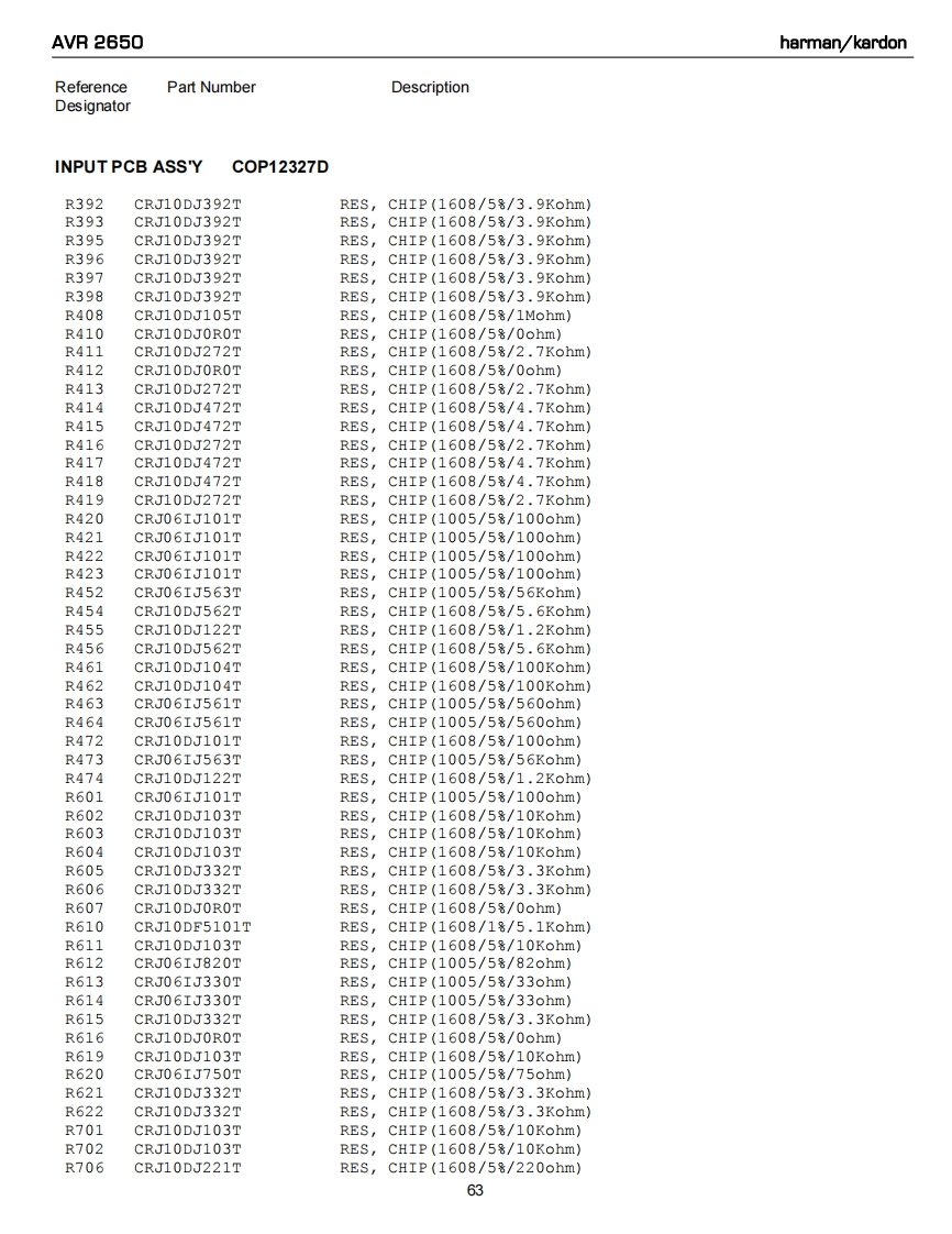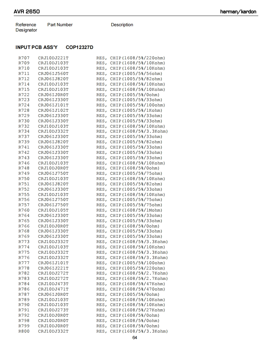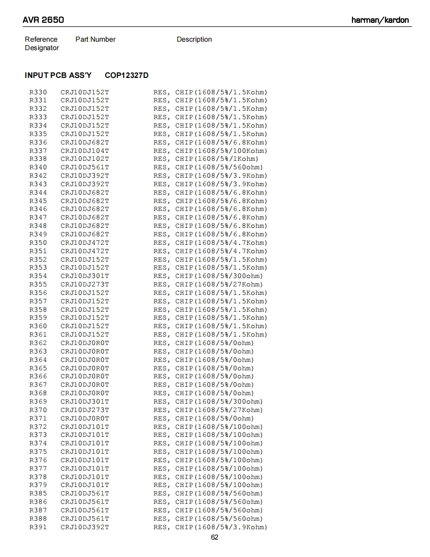 AVR 2650harman/kardonReferencePart NumberDescriptionDesignatorINPUT PCB ASS'YC0P12327DR237CRJ10DJ104TRESCHIP(1608/5号/100Kohm》R238CRJ10DJ104TRES,CHIP (1608/58/100Kohm)R239CRJ10DJ104TRES,CHIP (1608/58/100Kohm)R240CRJ10DJ104TRES,CHIP(1608/58/100Kohm)R241CRJ10DJOROTRES,CHIP(1608/58/0ohm)R242CRJ10DJOROTRES,cHIP(1608/58/0ohm)R243CRJ10DJOROTRES,CHIP(1608/58/0ohm)R247CRJ10DJOROTRES,CHIP(1608/58/0ohm)R248CRJ10DJOROTRES,cHIP(1608/5号/0ohm)R249CRJ1ODJOROTRES,CHIP(1608/5号/0ohm)R250CRJ10DJOROTREScHIP(1608/58/0ohm)R258CRJ10DJ4R7TRES,CHIP (1608/58/4.7ohm)R259CRJ10DJ4R7TRES,cHIP(1608/58/4.7ohm)R260CRJ10DJ4R7TRES,CHIP (1608/58/4.7ohm)R263CRJ10DJ184TRES,CHIP(1608/58/180Kohm)R264CRJ10DJ184TRESCHIP(1608/58/180Kohm)R265CRJ10DJ184TRES,cHIP(1608/58/180Kohm)R266CRJ10DJ184TRES,cHIP(1608/58/180Kohm)R267CRJ10DJ184TRES,CHIP(1608/58/180Kohm)R268CRJ10DJ184TRES,CHIP(1608/58/180Kohm)R274CRJ10DJ222TRES,cHIP(1608/58/2.2Kohm)R281CRJ10DJOROTRES,CHIP(1608/58/0ohm)R282CRJLODJOROTRES,CHIP(1608/58/0ohm)R283CRJ1ODJOROTRES,CHIP(1608/58/0ohm)R284CRJ10DJ152TRES,CHIP(1608/58/1.5Kohm)R285CRJ1ODJOROTRES,CHIP(1608/58/0ohm)R286CRJ10DJOROTRES,CHIP(1608/53/0ohm)R287CRJ1ODJOROTRES,CHIP(1608/58/0ohm)R288CRJ10DJOROTRES,cHIP(1608/5号/0ohm)R295CRJ10DJ563TRES,CHIP(1608/58/56Kohm)R296CRJ10DJ563TRES,CHIP(1608/58/56Kohm)R297CRJ10DJ563TRES,CHIP(1608/58/56Kohm)R298CRJ10DJ563TRES,CHIP(1608/58/56Kohm)R300CRJ10DJ103TRESCHIP(1608/58/10Kohm)R301CRJ10DJ332TRES,CHIP (1608/58/3.3Kohm)R302CRJ10DJ332TRES,CHIP(1608/5号/3.3Kohm》R303CRJ10DJ332TRES,CHIP (1608/58/3.3Kohm)R304CRJ10DJ332TRES,CHIP(1608/58/3.3Kohm)R305CRJ10DJ332TRESCHIP(1608/58/3.3Kohm)R306CRJ10DJ332TRES,CHIP (1608/58/3.3Kohm)R307CRJ10DJ332TRES,CHIP(1608/58/3.3Kohm)R308CRJ10DJ332TRES,CHIP(1608/58/3.3Kohm)R309CRJ10DJ332TRES,CHIP(1608/58/3.3Kohm)R310CRJ10DJ332TRES,CHIP(1608/58/3.3Kohm)R311CRJ10DJ332TRES,CHIP(1608/58/3.3Kohm)R312CRJ10DJ332TRES,CHIP (1608/58/3.3Kohm)R313CRJ10DJ332TRES,CHIP(1608/58/3.3Kohm)R314CRJ10DJ332TRES,cHIP(1608/58/3.3Kohm)R315CRJ10DJ332TRES,CHIP (1608/58/3.3Kohm)R316CRJ10DJ332TRES,CHIP (1608/58/3.3Kohm)R319CRJ10DJ561TRES,CHIP(1608/58/560ohm)R328CRJ10DJ152TRES,CHIP (1608/58/1.5Kohm)R329CRJ10DJ152TRES,CHIP(1608/58/1.5Kohm)61