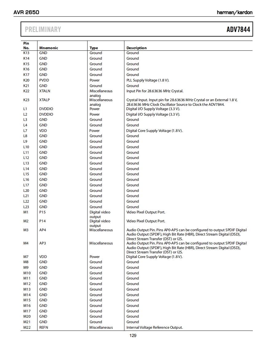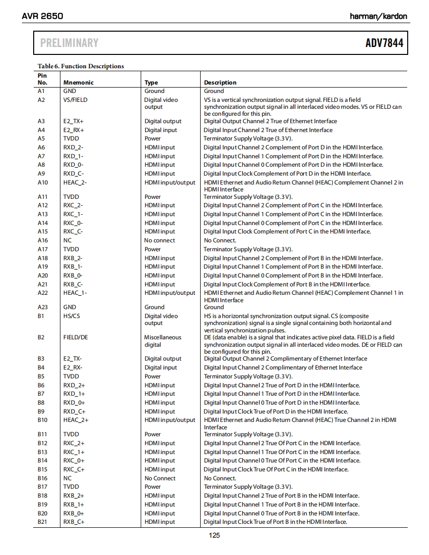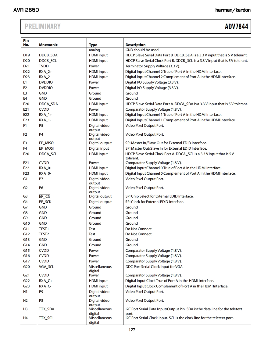 AVR 2650harman/kardonA3S56D30FTPZentelA3S56D40FTP256M Double Data Rate Synchronous DRAMPIN FUNCTIONSYMBOLTYPEDESCRIPTIONClock:CLK and /CLK are differential clock inputs.All address and controlinput signals are sampled on the crossing of the positive edge of CLK andCLK,/CLKInputnegative edge of/CLK.Output(read)data is referenced to the crossings ofCLK and /CLK (both directions of crossing).Clock Enable:CKE controls Power Down and Self Refresh.Taking CKE LOW provides Precharge Power Down or SelfRefresh (all banks idle),CKEInputor Active Power Down(row active in any bank).Taking CKE HIGH provides Power Down exit or Self Refresh exit.After Self Refresh is started,CKE becomes asynchronous input.Power Down and Self Refresh is maintained as long as CKE is LOW./CSInputChip Select:When/CS is HIGH,any command means No Operation./RAS,/CAS,/WEInputCombination of/RAS,/CAS,/WE defines basic commands.A0-12 specify the Row/Column Address in conjunction with BA0,1.TheRow Address is specified by A0-12.The Column Address is specified byA0-12InputA0-9(x8)and A0-8(x16).A10 is also used to indicate prechargeoption.When A10 is HIGH at a Read/Write command,an Auto Prechargeis performed.When A10 is HIGH at a Precharge command,all banks are precharged.BA0,1InputBank Address:BA0,I specifies one of four banks to which a command is applied.BA0,1 must be set with Active,Precharge,Read,Write commands.DQ0-7(x8),Input/OutputData Input/Output:Data busDQ0-15(x16),Data Strobe:Output with read data,input with write data.Edge-alignedDQS (x8)Input/Outputwith read data,centered in write data.Used to capture write data.UDOS,LDOS (x16)For the x16,LDQS corresponds to the data on DQ0-DQ7;UDQScorrespond to the data on DQ8-DQ15Input Data Mask:DM is an input mask signal for write data.Input datais masked when DM is sampled HIGH along with that input dataDM (x8)Inputduring a write access.DM is sampled on both edges of DQS.UDM,LDM(x16)Although DM pins are input only,the DM loading matches the DQand DQS loading For the x16,LDM corresponds to the data on DQ0-DQ7;UDM corresponds to the data on DQ8-DQ15.Vdd,VssPower SupplyPower Supply for the memory array and peripheral circuitry.VddQ,VssQPower SupplyVddQ and VssQ are supplied to DQ,DQS buffers.VREFInputSSTL_2 reference voltage.121