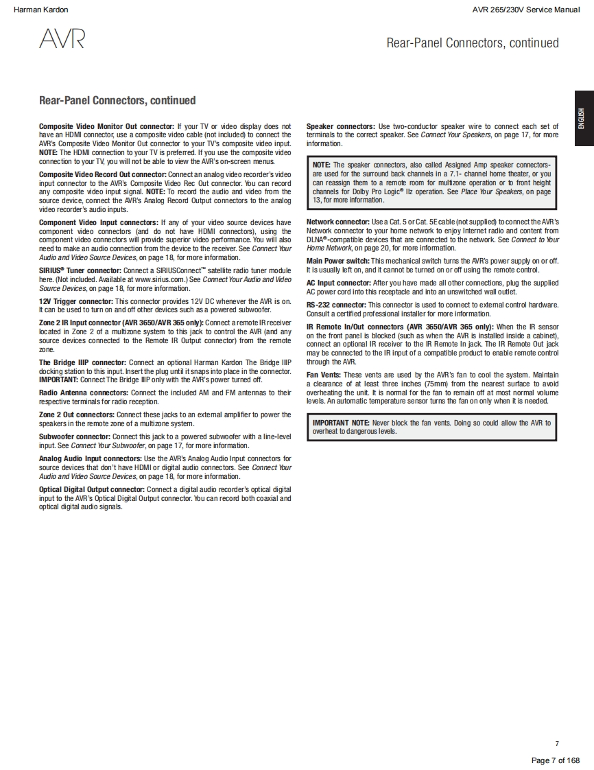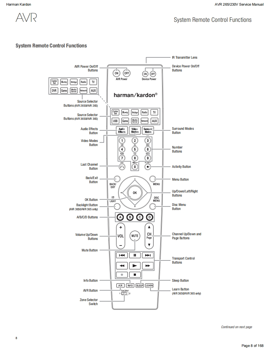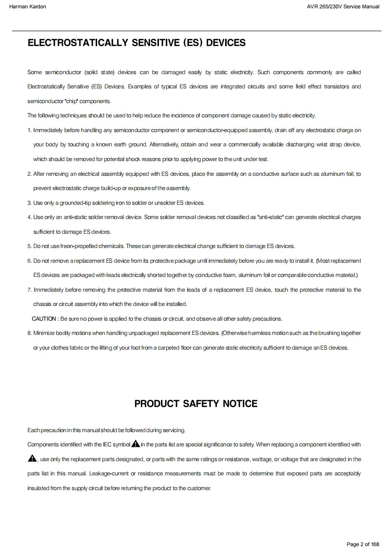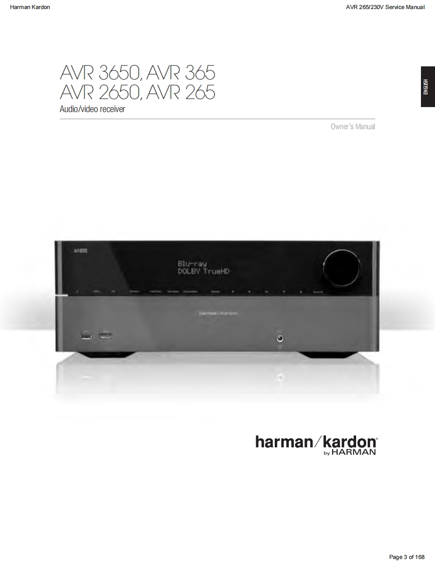 Harman KardonAVR 265/230V Service ManualHarman KardonService ManualAVR265/2307.1 CHANNEL AN RECEIVERWR函CABLE/SATDOLBY PLIx MOVIEharman/kardonCONTENTSESD WARNING24DISASSEMBLY3FRONT AND REAR PANELSEXPLODED VIEW AND PARTS24REMOTE CONTROLSELECTRICAL PARTS LIST5SETTINGS LOCK12IC PINOUTS63UPDATING NETWORK SOFTWARE13PCB DRAWINGS130RESET REMOTE AND PROCESSOR14BLOCK DIAGRAMS148TROUBLESHOOTING GUIDE15WIRING DIAGRAM150BASIC SPECIFICATIONS16AMP BIAS ADJUSTMENT151APPENDIX,SETTINGS17SCHEMATIC DIAGRAMS152-168PACKAGE LISTS AND PARTS22Released EU2011Harman Consumer Group,Inc.Rev0,10/20118500 Balboa BoulevardNorthridge,California 91329Page 1 of 168