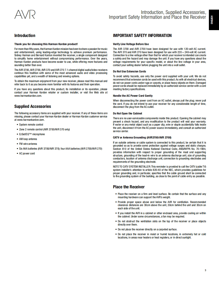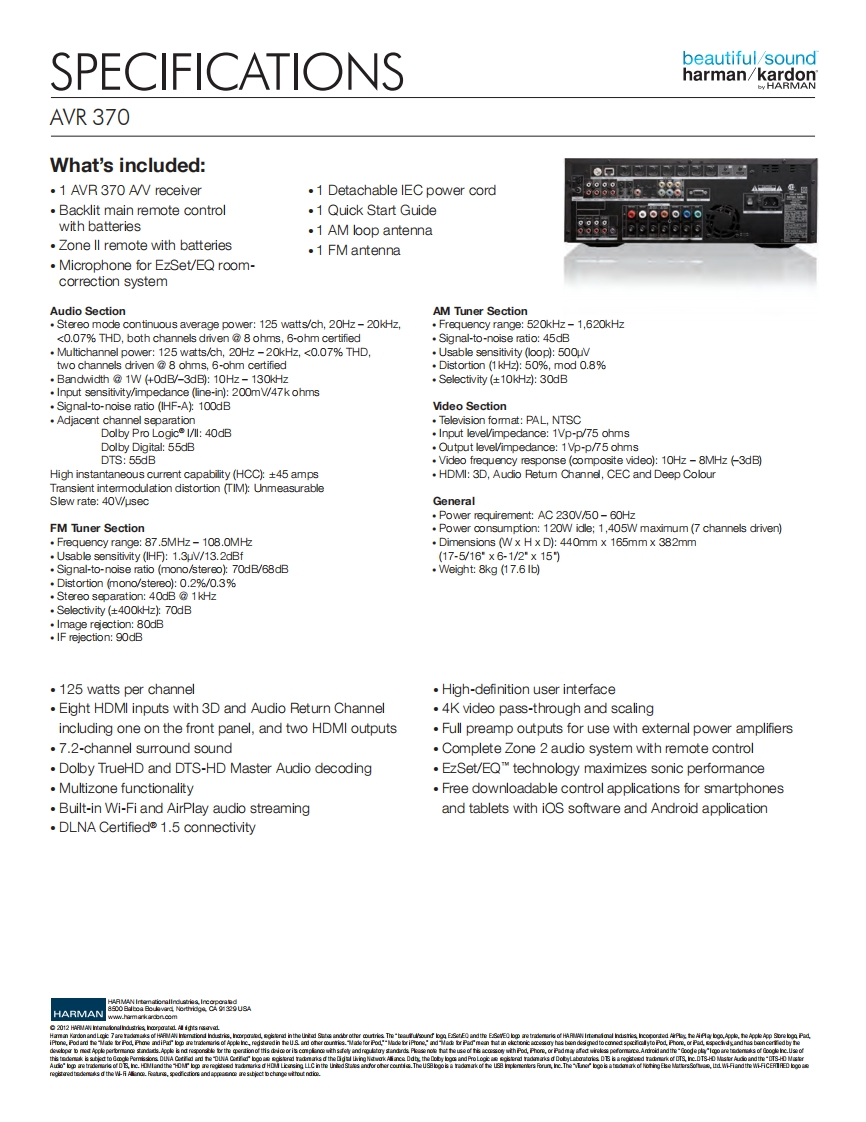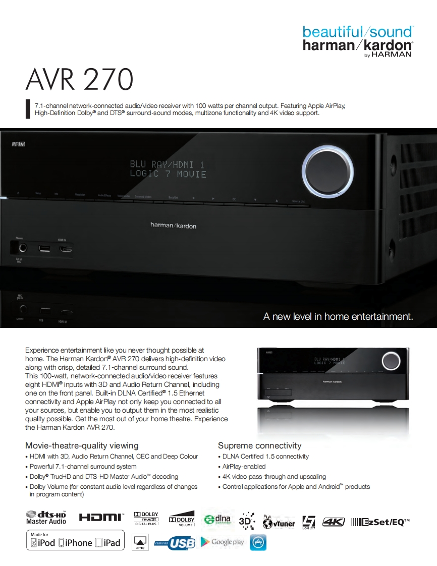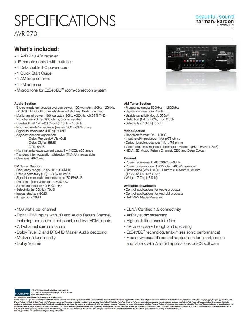 Harman KardonService ManualAVR 370125 watt 7.1 CHANNEL AN RECEIVERAVR 270100 watt 7.1 CHANNEL AN RECEIVERWR圆FM 87.50MHz 1LOGIC 7 MOVIEharman/kardonCONTENTSPRODUCT SHEETS WITH SPECS26BILL OF MATERIALS,AVR 2707OWNER'S MANUALBILL OF MATERIALS,AVR 270126PACKAGE DRAWINGS69BLOCK DIAGRAMS161EXPLODED VIEW AND PARTS1WIRING DIAGRAM163DISASSEMBLY7SCHEMATIC DIAGRAMS164BIAS ADJUSTMENT75Released EU2012Harman Consumer Group,Inc.Rev0,11/20128500 Balboa BoulevardNorthridge,California 91329