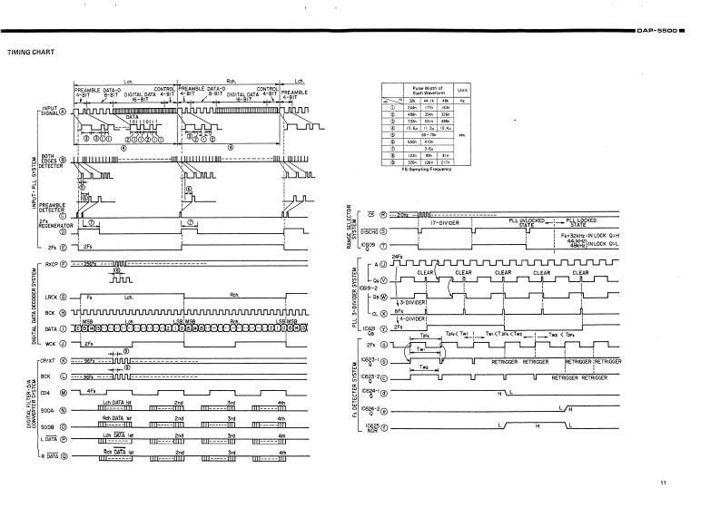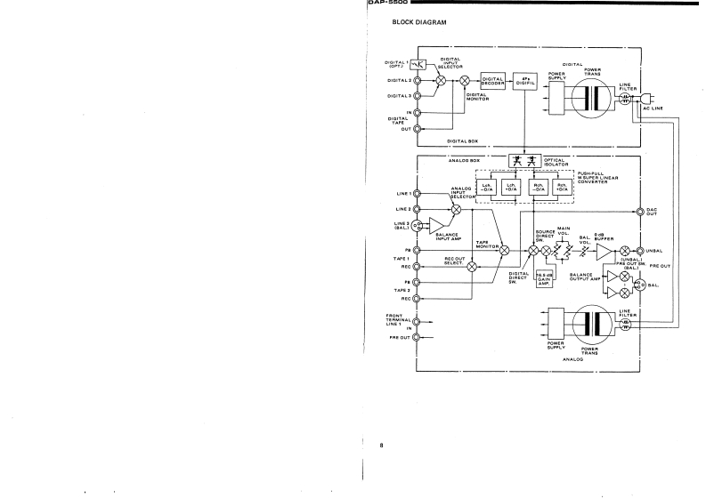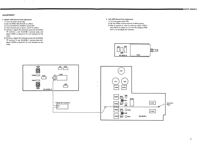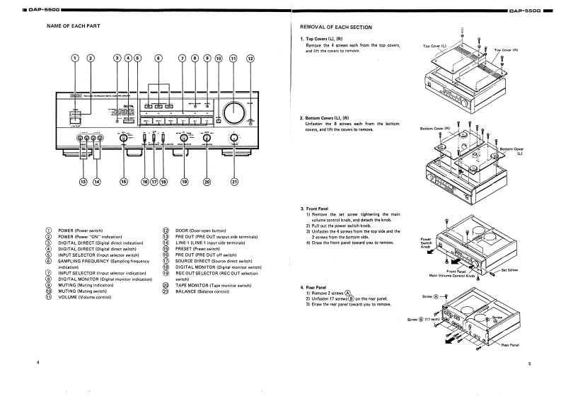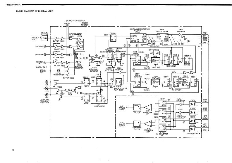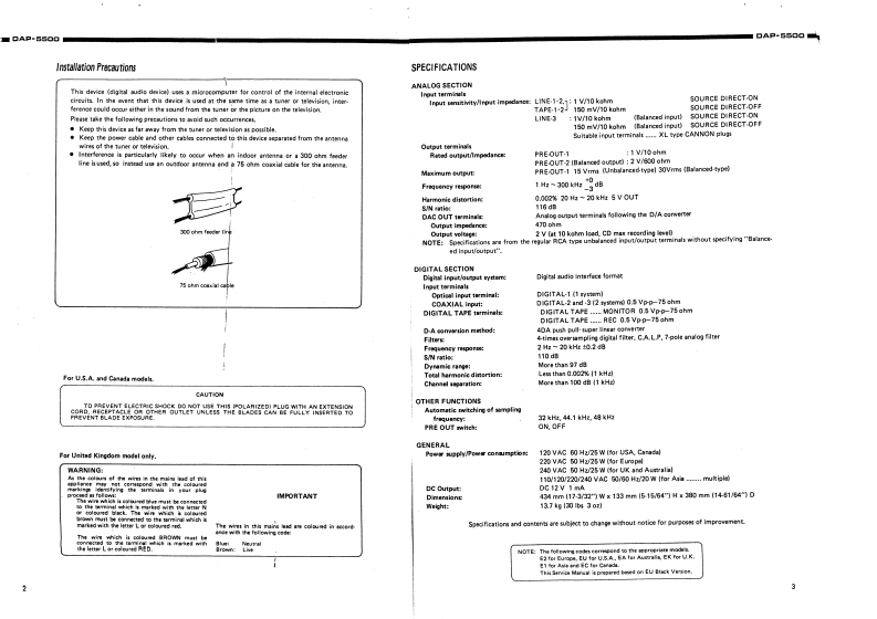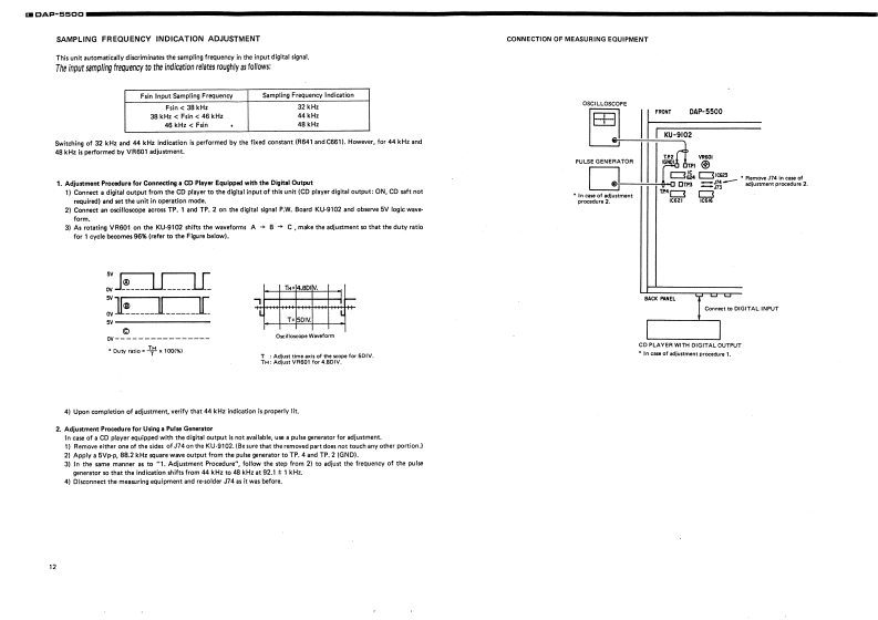 DENONHi-Fi Digital Audio PreamplifierSERVICE MANUALMODEL DAP-5500DIGITAL AUDIO PREAMPLIFIERTABLE OF CONTENTSPRECAUTIONSSPECIFICATIONS3NAME OF EACH PARTREMOVAL OF EACH SECTIONCONNECTIONS..6,7BLOCK DIAGRAMADJUSTMENT9BLOCK DIAGRAM OF DIGITAL UNIT.........TIMING CHART...11SAMPLING FREQUENCY INDICATION ADJUSTMENT....12SEMICONDUCTORS....13,14PRINTED WIRING BOARD PARTS LIST.15~20KU-9102E DIGITAL SIG UNITKU-9103E DIGITAL P.S.UNITKU-9104E D.A INPUT UNITKU-9105E ANALOG P.S.UNITKU-9116E SERVO UNITPRINTED WIRING BOARD PATTERNS........2123KU-9105 ANALOG P.S.UNITKU-9102 DIGITAL SIG UNITKU-9104 D.A.INPUT UNITKU-9116 SERVO UNITKU-9103 DIGITAL P.S.UNITEXPLODED VIEW OF CHASSIS AND CABINET2PARTS LIST OF EXPLODED VIEW...WIRING DIAGRAM.....252SCHEMATIC DIAGRAM (ANALOG UNIT)SCHEMATIC DIAGRAM (DIGITAL UNIT)28NIPPON COLUMBIA CO..LTD.