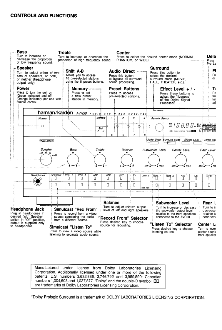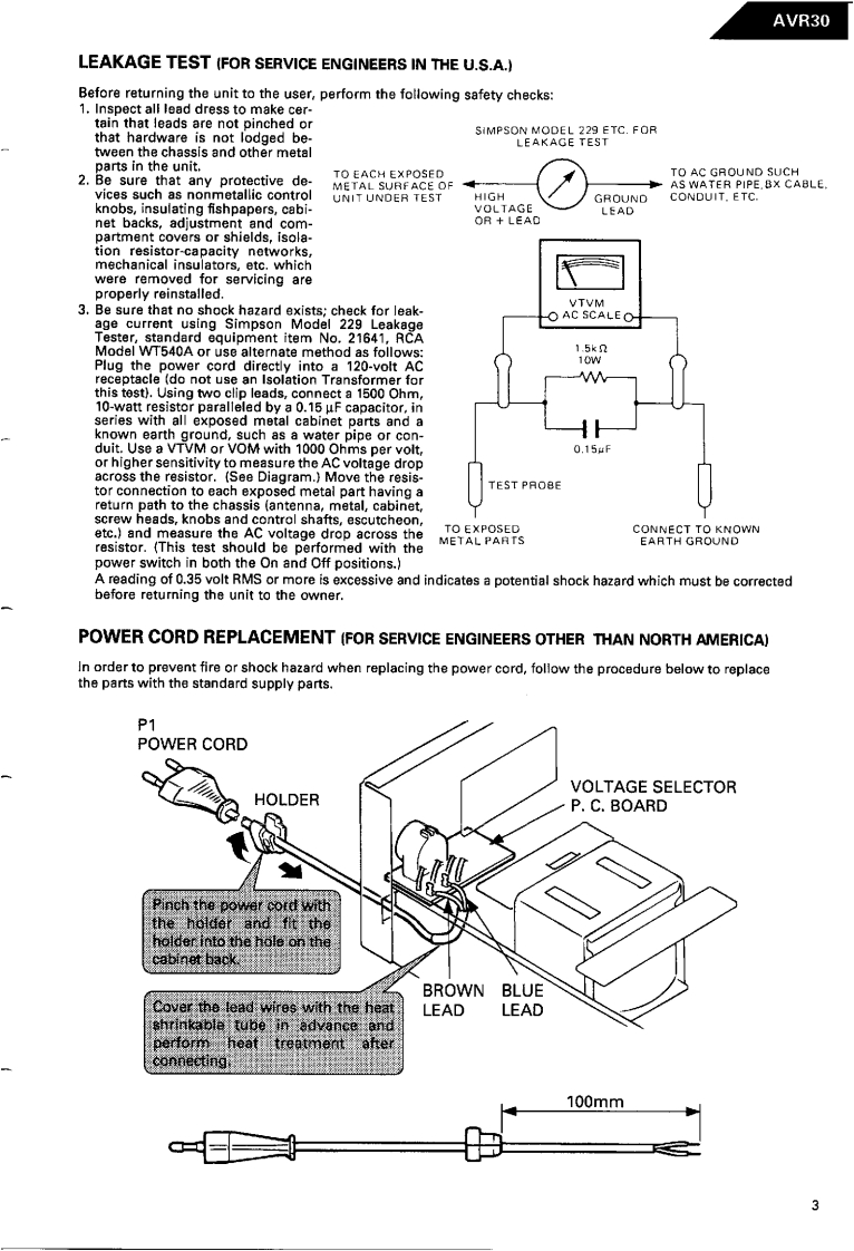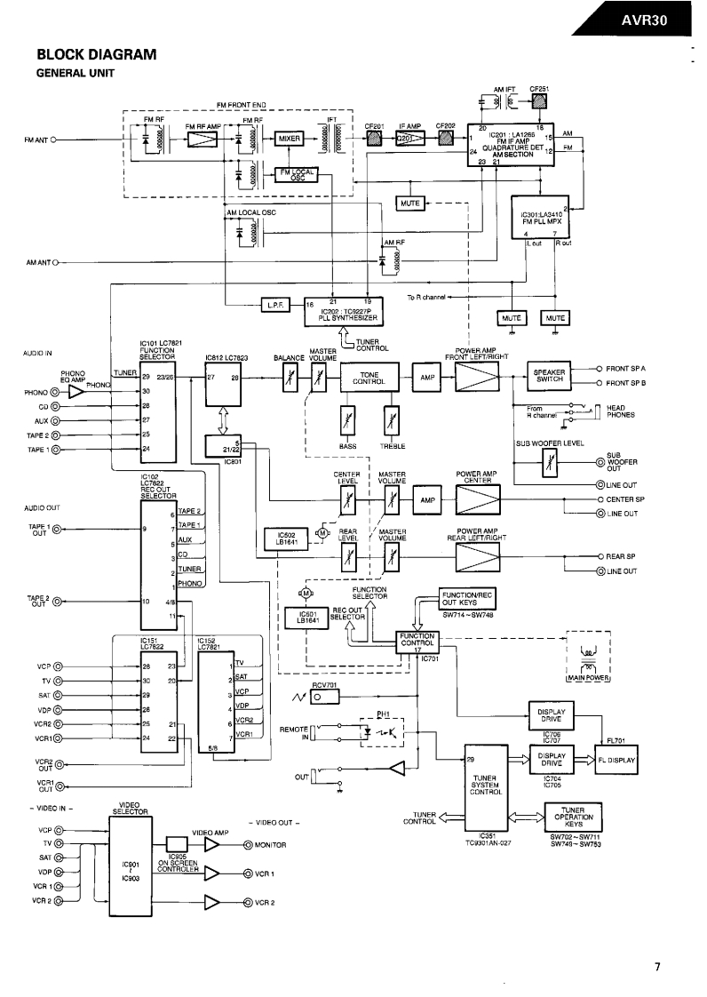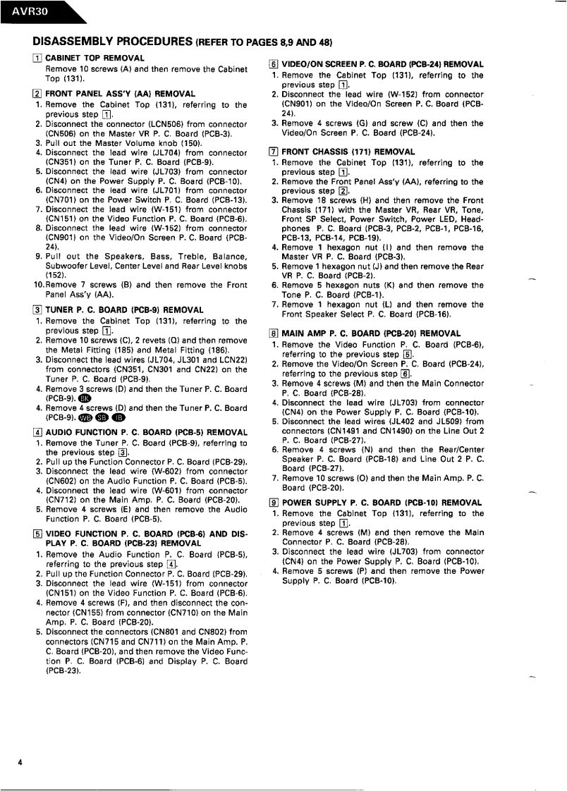 The Harman KardonModel AVR30Manual18阳BAUDIO AND VIDEO RECEIVERTechnical Manualharman kardon次边“:8888.--This manual is to be applied to the North America area model Black versionwith serial number S235-05761 and above,and Asia,Singapore and interna-tional models.The following marks found in the parts list of this manualidentify the models as follows.North America area model Black versionAsia model Black versionB:Singapore model Black versionIBInternational model Black versionCONTENTSSPECIFICATIONS..BLOCK DIAGRAM..................PRECAUTIONS..GENERAL UNIT PARTS LIST...................8LEAKAGETEST3GENERAL UNIT.8POWER CORD REPLACEMENT.........3P.C.BOARDSDISASSEMBLY PROCEDURES........10ELECTRICAL PARTS LIST15CONTROLS AND FUNCTIONS................5IC BLOCK DIAGRAMS..........................31ALIGNMENT PROCEDURES........6SCHEMATIC DIAGRAMS.......36CIRCUIT DESCRIPTION.......6WIRING DIAGRAM.48harman/kardonParts and Serwce Office240 Crossways Park West.Woodbury.N.Y.117971112-0330B152 G9402 1500 Printed in Japan