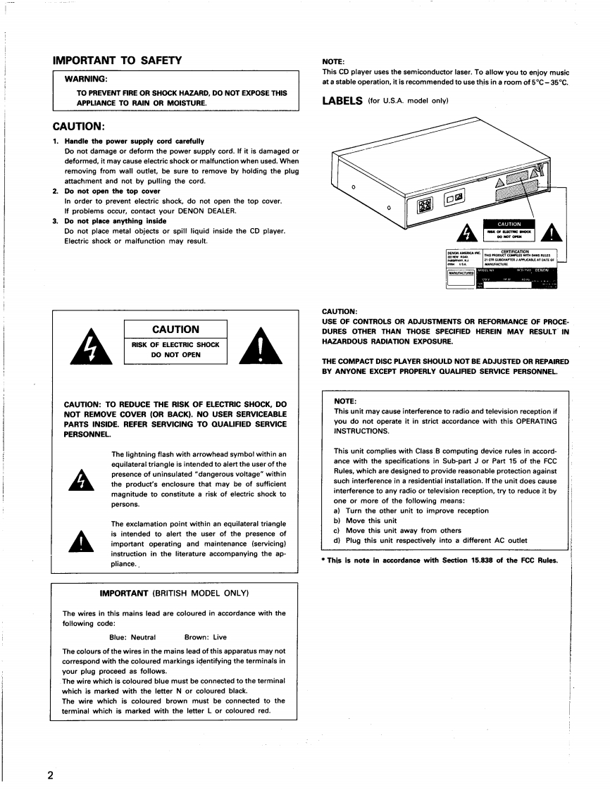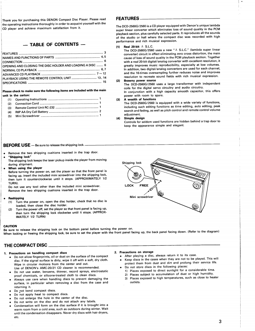 (oDENONHi-Fi ComponentSERVICE MANUALSTEREO CD PLAYERM▣DEL DCD-2560sTABLE OF CONTENTSOPERATING INSTRUCTIONS214SPECIFICATIONS15NOTE FOR HANDLINGOFLASERPICK-UP..............................................16-17DISASSEMBLY18-19ADJUSTMENT…20-25HEAT RUN MODE FUNCTION ............................................................26IC TERMINAL FUNCTION LIST27-31PARTS LIST OF P.W.BOARD3233PARTS LISTOF EXPLODEDVIEW.........................................................34PARTS LIST OF PACKING ACCESSORIES34EXPLODED VIEW…EXPLODED VIEW OF MECHA UNIT36PARTS LIST OF MECHA UNITP.W.BOARD37,38WIRING DIAGRAM3gSEMICONDUCTORSSCHEMATIC DIAGRAM........41NIPPON COLUMBIA CO.LTD.