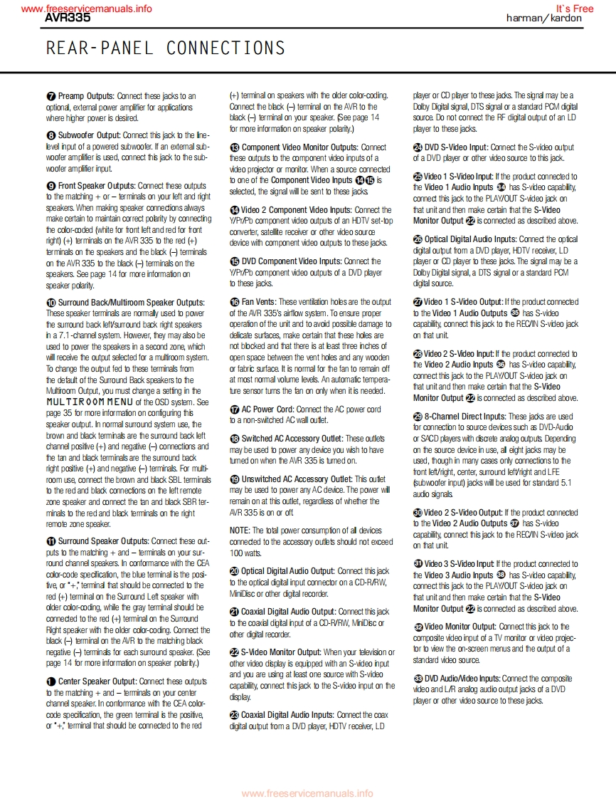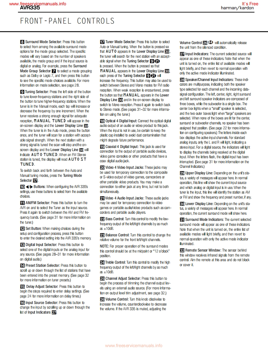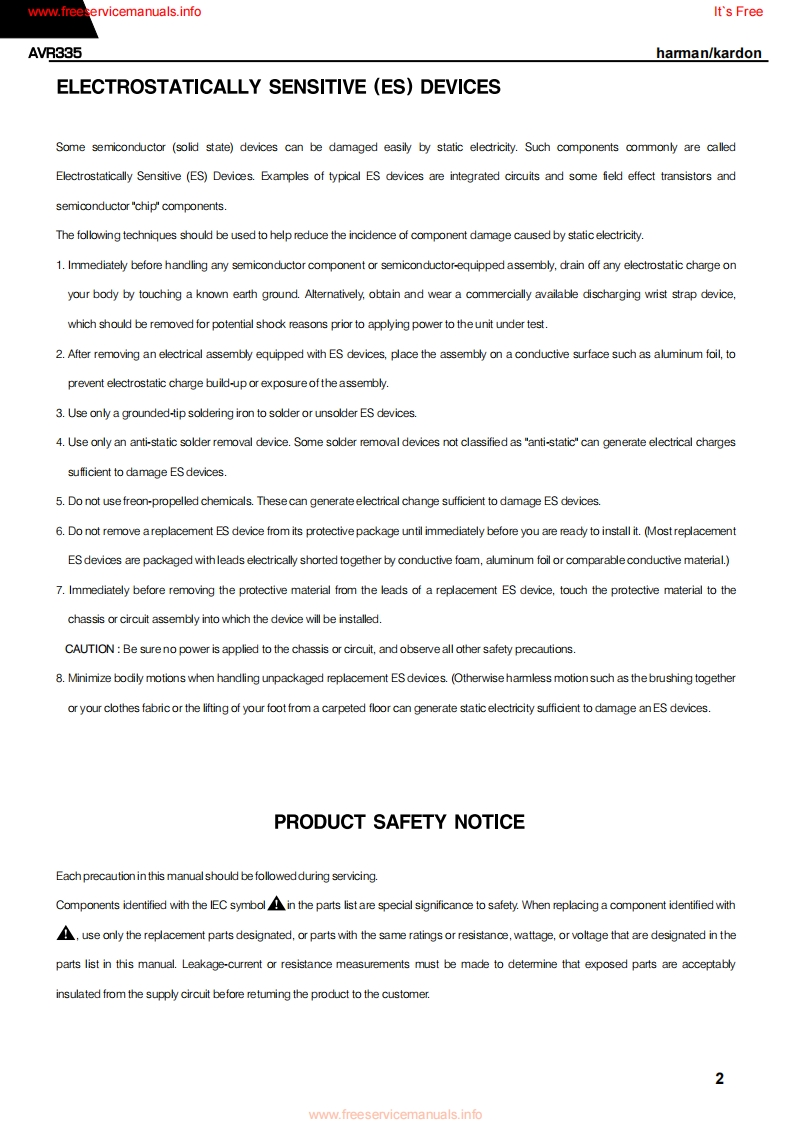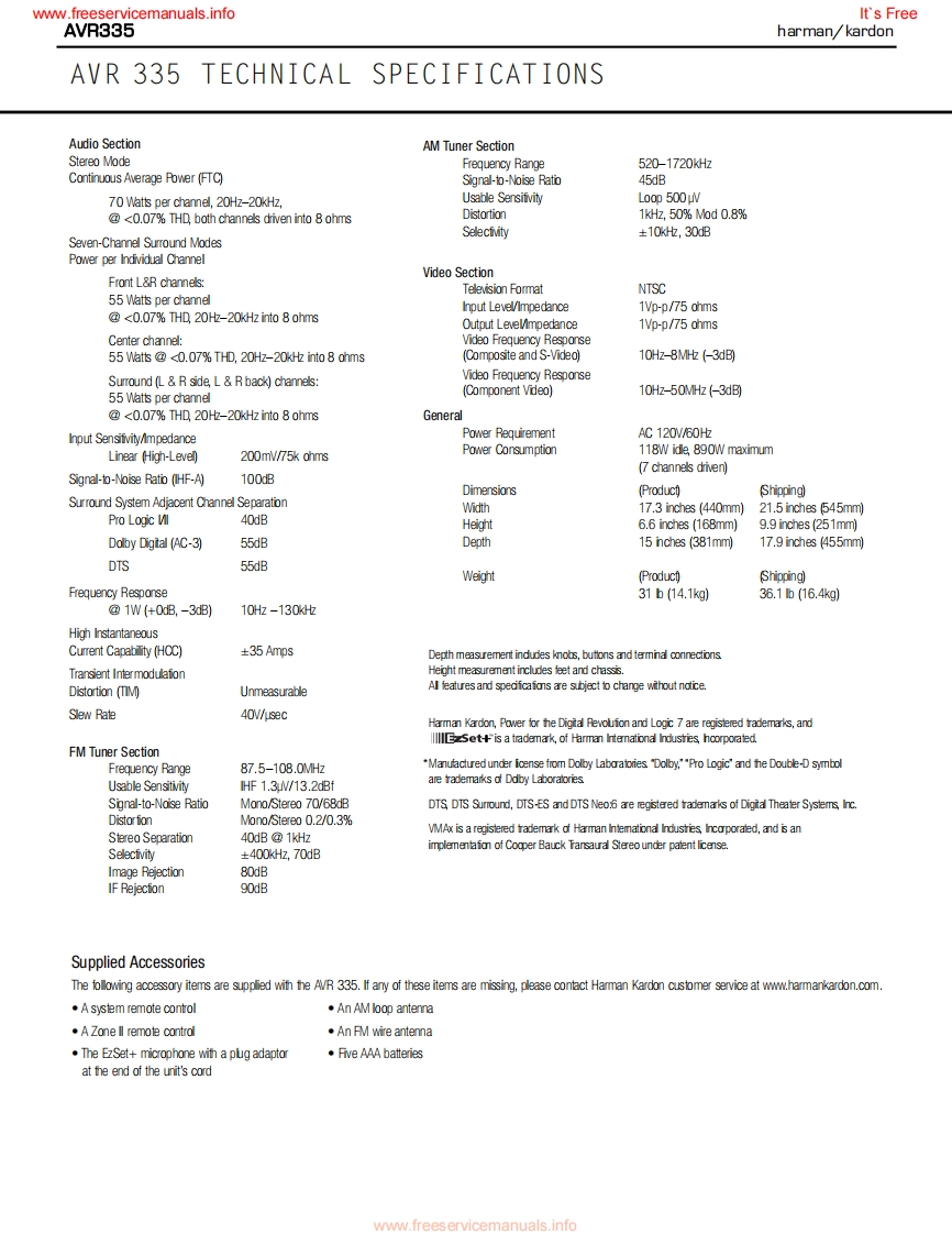www.freeservicemanuals.infoIt's Freeharman/kardonAVR3357 X 55W 7.1 CHANNEL AN RECEIVERSERVICE MANUALWR函DVD/C0AX1mm四D0 LBY D EX黑國⊙⊙⊙⊙⊙harman/kardon⊙CONTENTSESD WARNING.......2DISASSEMBLY....23LEAKAGE TESTING...........3AMP BIAS ADJUSTMENT....................24BASIC SPECIFICATIONS.......4TECH TIP HKTT2003-01.................25FRONT PANEL CONTROLS......5BLOCK DIAGRAM......26REAR PANEL CONNECTIONS..7PCB DRAWINGS......................27REMOTE CONTROL FUNCTIONS..........10ELECTRICAL PARTS LIST.......34INSTALLATION/CONNECTIONS..........13SEMICONDUCTOR PINOUTS...............77OPERATION...............15SCHEMATICS...........119TROUBLESHOOTING GUIDE...............21WIRING DIAGRAM......126PROCESSOR RESET.........................21PACKAGING..127UNIT EXPLODED VIEW..................22haman/kardon,Inc.250 Crossways Park Dr.Woodbury,New York 11797Rev15/2005www.freeservicemanuals.info