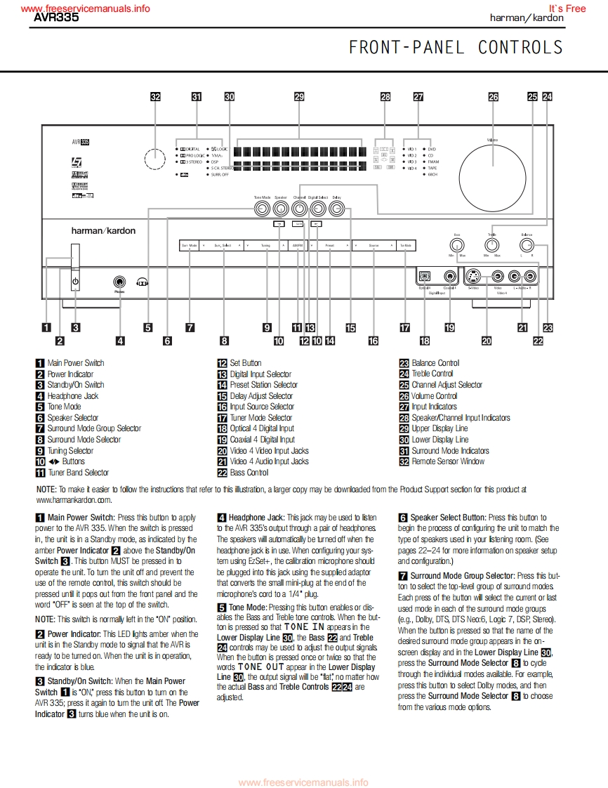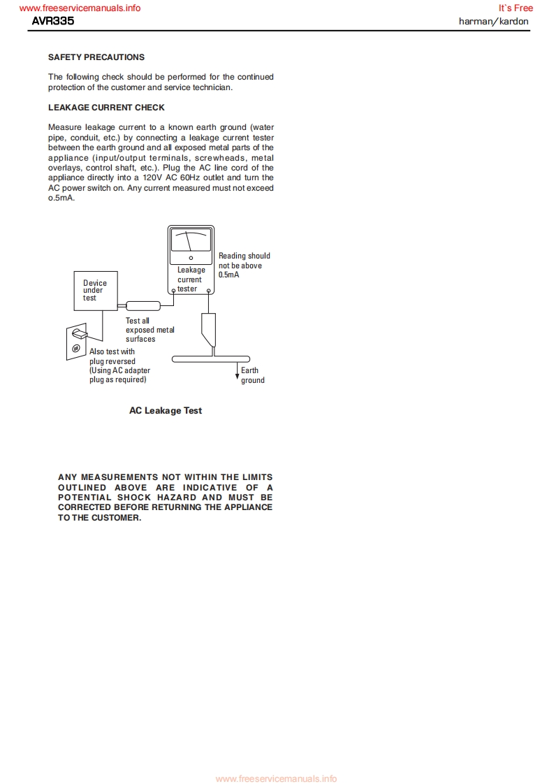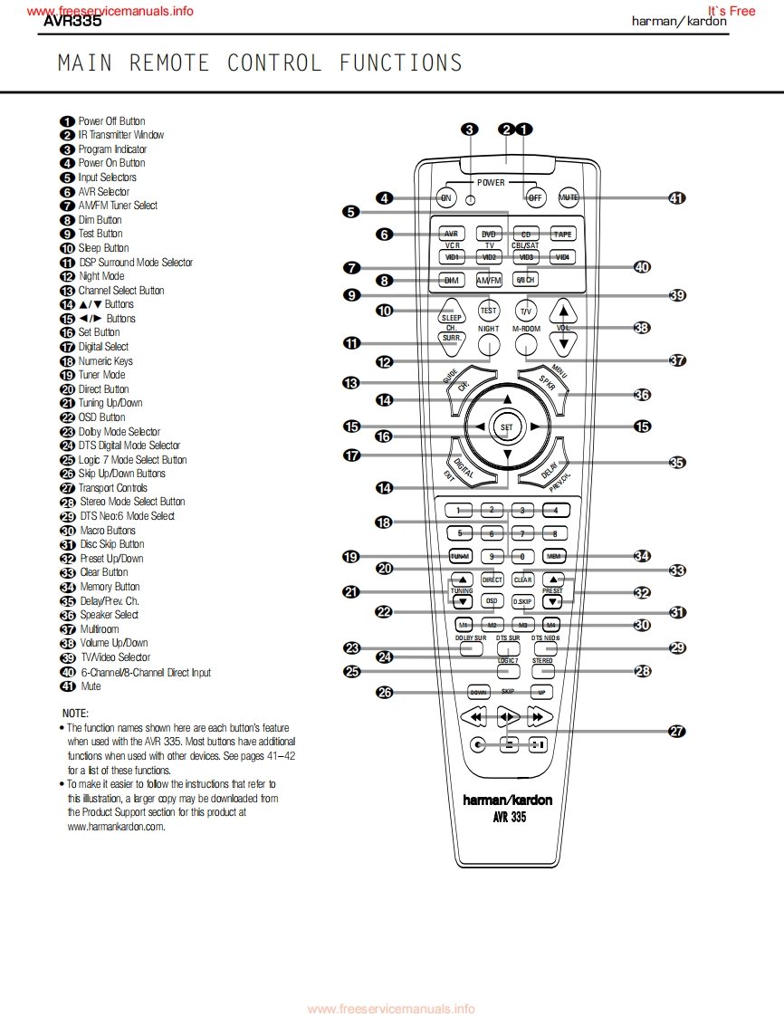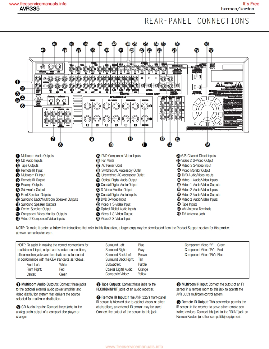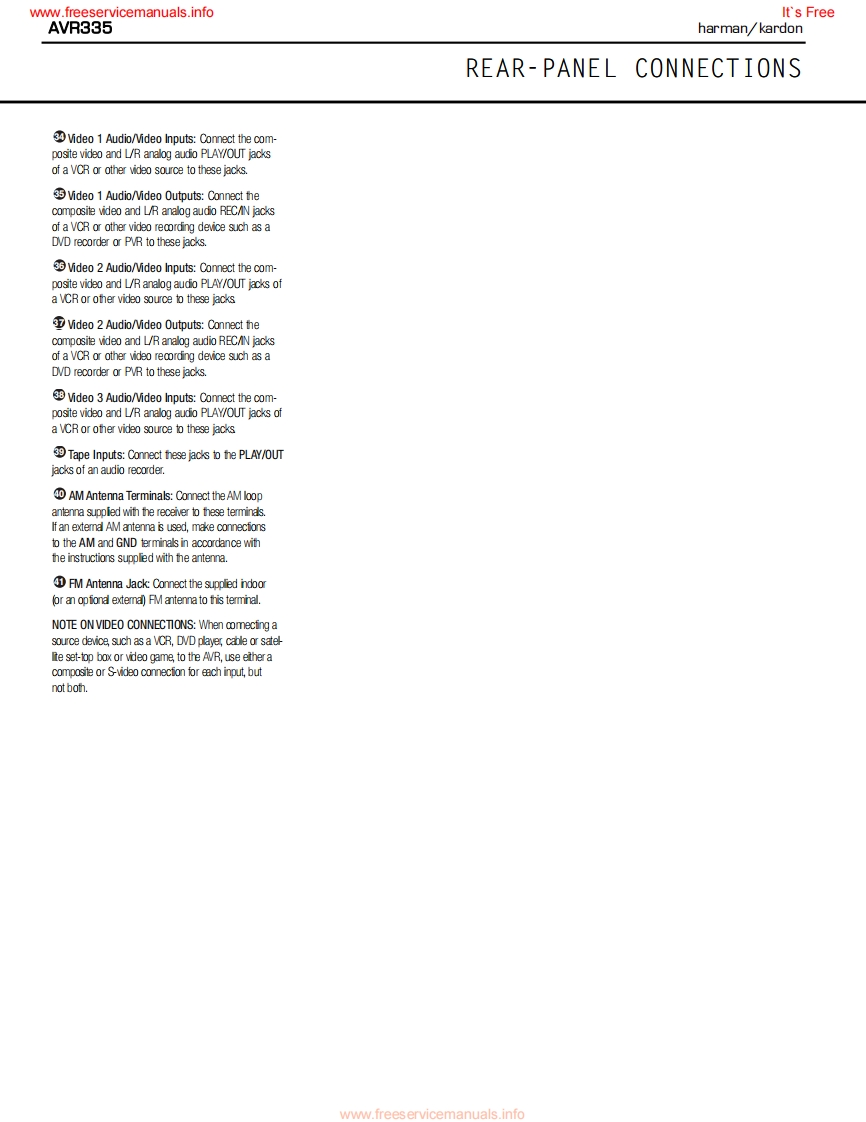 www.freeservicemanuals.infoIt's Freeharman/kardonAVR3357 X 55W 7.1 CHANNEL AN RECEIVERSERVICE MANUALWR函DVD/C0AX1mm四D0 LBY D EX黑國⊙⊙⊙⊙⊙harman/kardon⊙CONTENTSESD WARNING.......2DISASSEMBLY....23LEAKAGE TESTING...........3AMP BIAS ADJUSTMENT....................24BASIC SPECIFICATIONS.......4TECH TIP HKTT2003-01.................25FRONT PANEL CONTROLS......5BLOCK DIAGRAM......26REAR PANEL CONNECTIONS..7PCB DRAWINGS......................27REMOTE CONTROL FUNCTIONS..........10ELECTRICAL PARTS LIST.......34INSTALLATION/CONNECTIONS..........13SEMICONDUCTOR PINOUTS...............77OPERATION...............15SCHEMATICS...........119TROUBLESHOOTING GUIDE...............21WIRING DIAGRAM......126PROCESSOR RESET.........................21PACKAGING..127UNIT EXPLODED VIEW..................22haman/kardon,Inc.250 Crossways Park Dr.Woodbury,New York 11797Rev15/2005www.freeservicemanuals.info