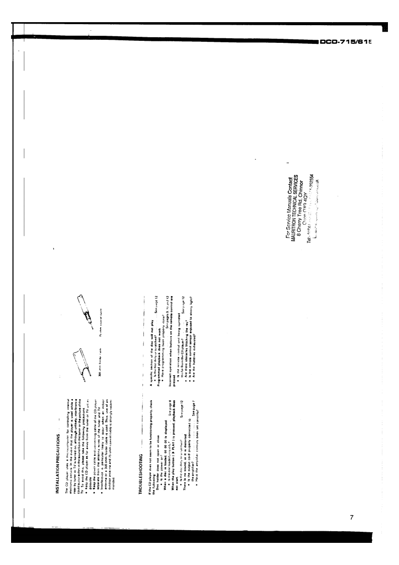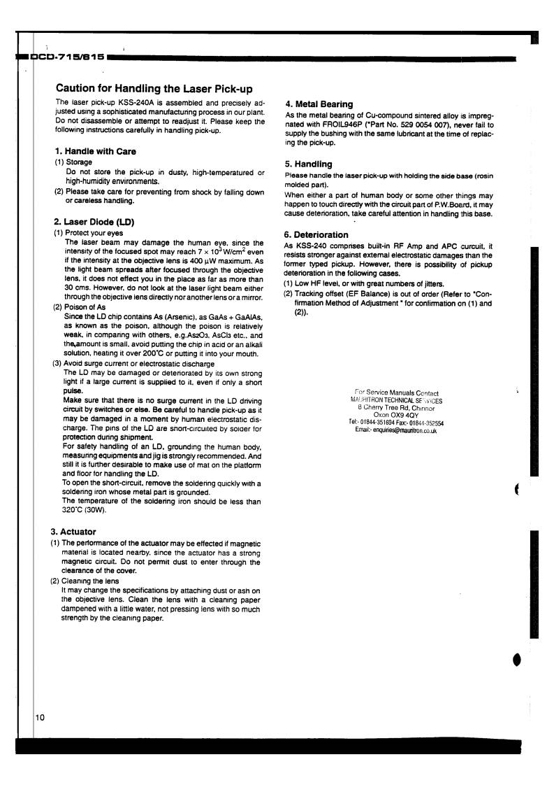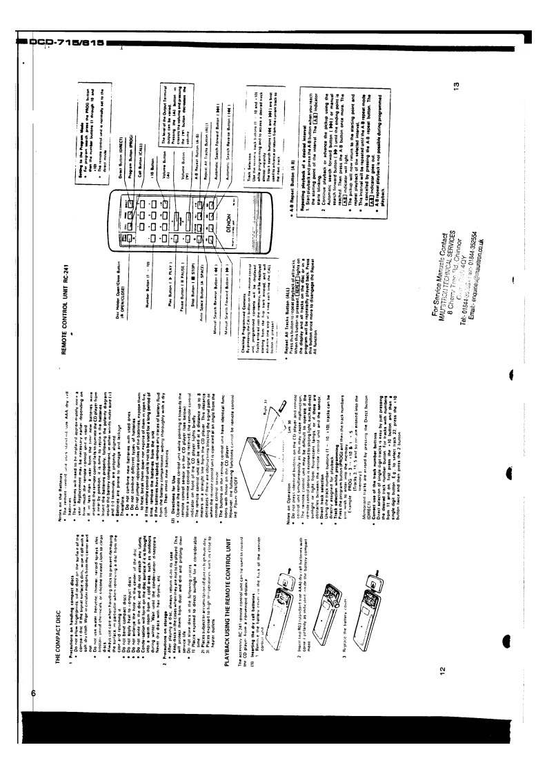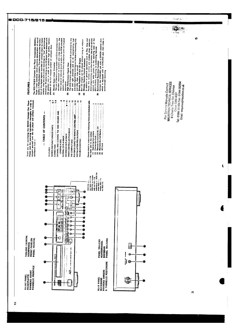 DENONHi-Fi ComponentSERVICE MANUALFOR EUROPE AND U.K.MODELSMODELD▣-715MODEL▣G▣-615STEREO CD PLAYERFor Service Manuals ContactMAURITRON TECHNICAL SERVICES8 Cherry Tre Hd,ChinnorOHon CX9 40Tk01844351694F30144-352554Email:-enquiresmauriton.co.uk(Photo DCD-715)-TABLE OF CONTENTS-OPERATING INSTRUCTIONSSPECIFICATONS2-7…8NOTE FOR HANDLING OF LASER PICK-UPDISASSEMBLY9,10ADJUSTMENT11HEAT RUN MODE FUNCTION12-15IC TERMINAL FUNCTION16PARTS LIST OF P.W.BOARD…17-20PARTS LISTOF PACKING ACCESSORIES...................................................212PARTS LISTOF EXPLODED VIEW (Europe and U.K.)...........................................EXPLODED VIEW2PARTS LISTOF FG-74 MECHANISMUNIT ................................................EXPLODED VIEW OF FG-74 MECHANISM UNIT,,....,,,..:·.···,··242P.W.BOARDWIRING DIAGRAM...25SEMICONDUCTORS..2SCHEMATICDIAGRAM...............................27,2829.30NIPPON COLUMBIA CO.,LTD.