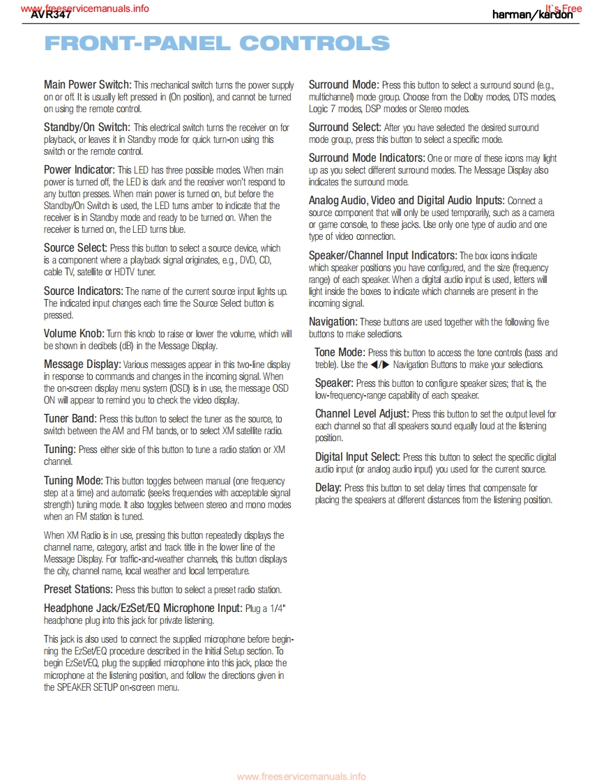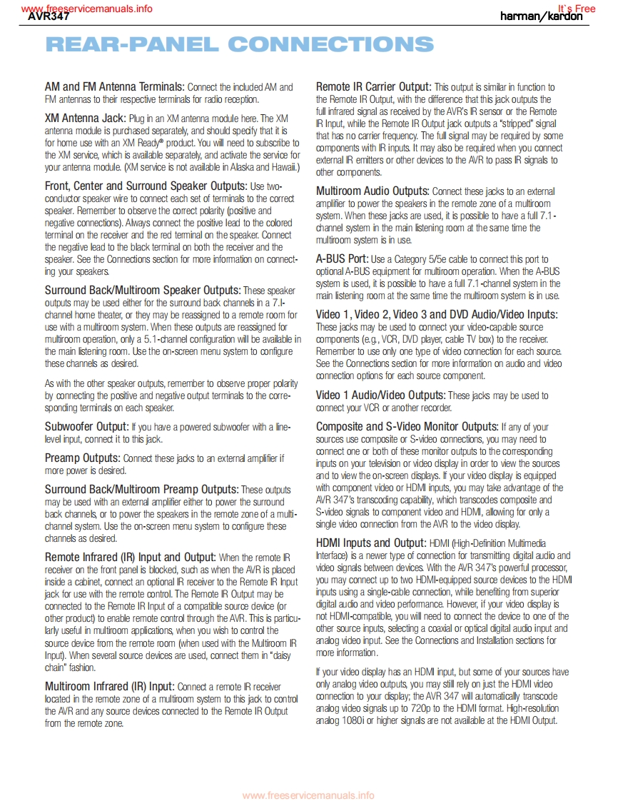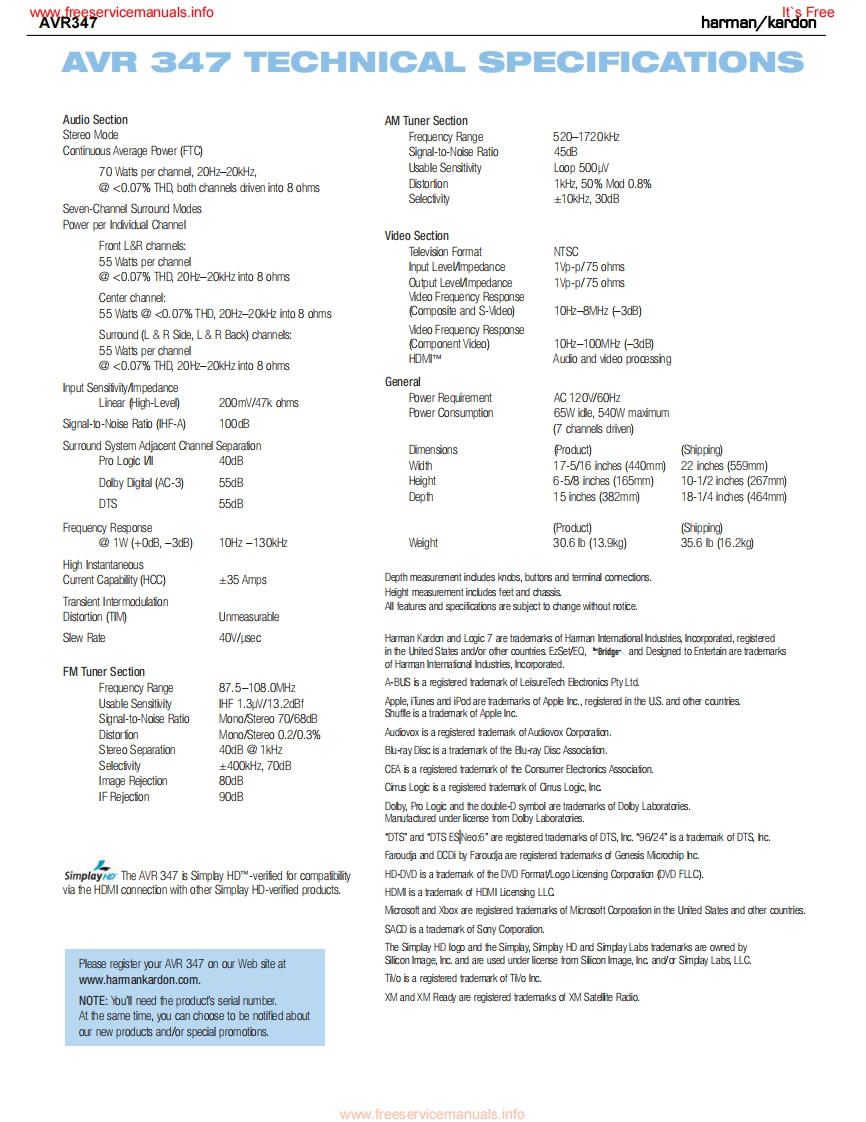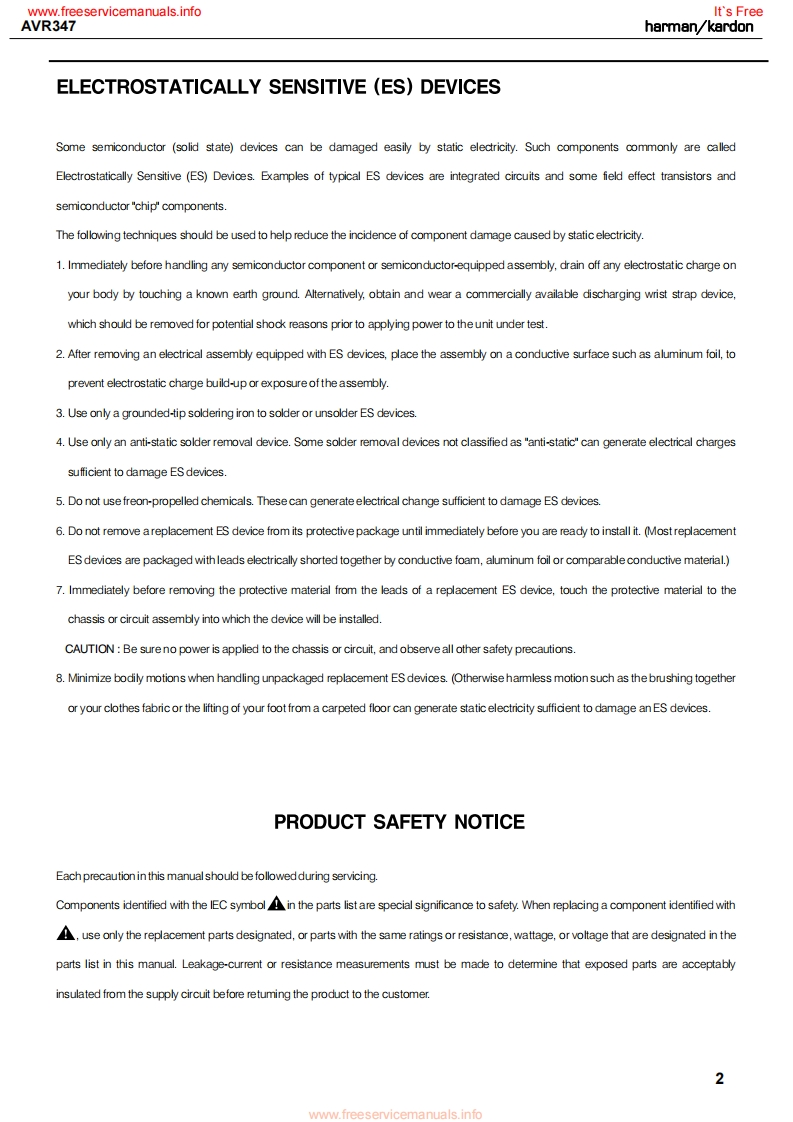 www.freeservicemanuals.infoIt's Freeharman/kardonAVR3477X 55W 7.1 CHANNEL AV RECEIVERSERVICE MANUAL帽丽·候这DDC0AX1回只回L0GIc77CHcI且目6660666dharman/kardon⊙⊙⊙CONTENTSESD WARNING.....DISASSEMBLY......43LEAKAGE TESTING.3UNIT EXPLODED VIEW.....48BASIC SPECIFICATIONS......4EXPLODED VIEW PARTS LIST..............PACKAGING..........5AMP BIAS ADJUSTMENT......................50FRONT PANEL CONTROLS.6BLOCK DIAGRAM..51REAR PANEL CONNECTIONS...............8ELECTRICAL PARTS LIST...................52REMOTE CONTROL FUNCTIONS..........11PCB DRAWINGS.............98CONNECTIONS.14SEMICONDUCTOR PINOUTS...............107oPERATION33SCHEMATICS....209TROUBLESHOOTING GUIDE.................41WIRING DIAGRAM..............................219PROCESSOR RESET...............42haman/kardon,Inc.250 Crossways Park Dr.Woodbury,New York 11797Rev06/2007www.freeservicemanuals.info