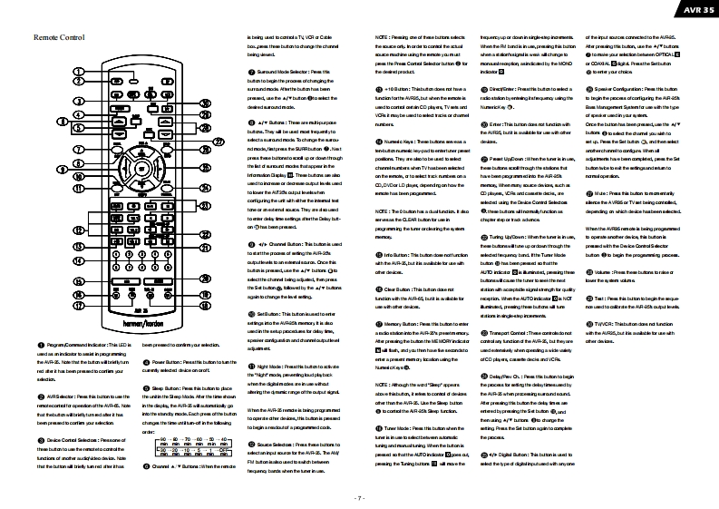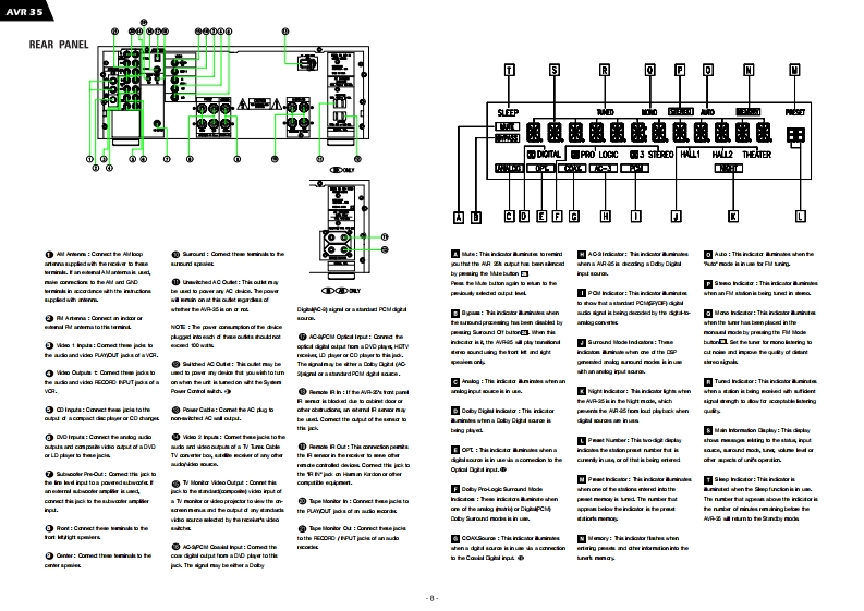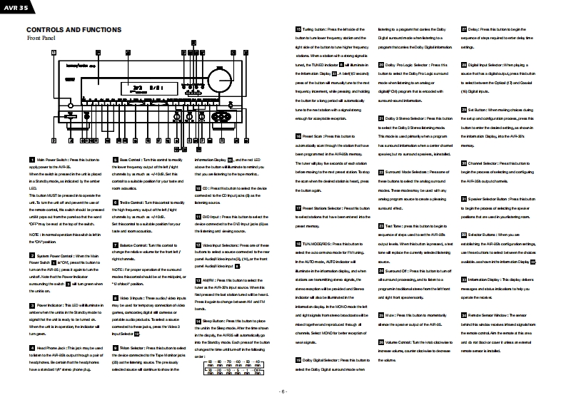 AVR 35The Harman KardonModel AVR 35Manual AAUDIO AND VIDEO DIGITAL RECEIVERTechnical Manualharman/kardon AVR 35混DKD3/21660哈8兰@回回The following marks found in the parts list of the manualidentify the models as follows.EK AVR 35North America area model Black versionAVR 35 RDS Europe area model Black versionA3 AVR 35 SNG:Asia area model Black versionCONTENTSSPECIFICATIONS2GENERAL UNIT EXPLODED VIEWELECTROSTATICALLY SENSITIVE(ES)DEVICE4PC.BOARDS21LEAKAGE TESTELECTRICAL PARTS LISTCONTROLS AND FUNCTIONS6IC BLOCK DIAGRAMS41SERVICE PROCEDURE9CPU PIN CONFIGURATION54TEST EQUIPMENT REQUIRED9FLT PIN CONFIGURATION60ALIGNMENT PROCEDURES9SCHEMATIC DIAGRAMS EALIGNMENT AND TEST POINTSSCHEMATIC DIAGRAMS OB69CIRCUIT DESCRIPTION1SCHEMATIC DIAGRAMS A76BLOCK DIAGRAMPIN CONNECTION DIAGRAM78DISASSEMBLY PROCEDURES17WIRING DIAGRAM7GENERAL UNIT PARTS LISTPACKING MATERIAL AND PARTS LIST80harman/kardonParts and Service Office250 Crossways Park Dr.,Woodbury,N.Y.117971112-AVR35 1200 Printed in KOREA-1-