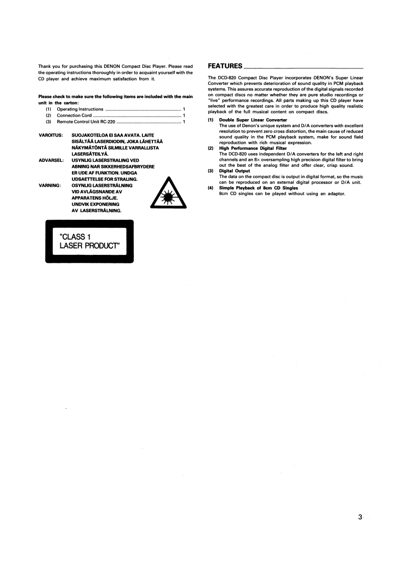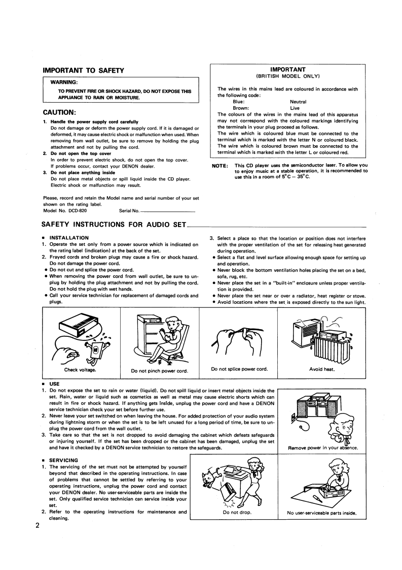 DENONHi-Fi ComponentSERVICE MANUALFOR EUROPE AND U.K.MODELSSTEREO CD PLAYERMODEL DCD-820TABLE OF CONTENTSOPERATING INSTRUCTIONS...........................................................2-12SPECIFICATIONS........................................................................3NOTEFORHANDLINGOFLASERPICK-UP..............................................14-16DISASSEMBLY.17ADJUSTMENT。。18-24HEAT RUNMODE FUNCTION...........................................25ICTERMINAL FUNCTIONLIST.........................................................26-31PARTSLISTOFPW.BOARD............................................................32,33PARTS LIST OF EXPLODED VIEW .........................................................PARTSLISTOF PACKING&ACCESSORIES..................................................34EXPLODED VIEW..............5EXPLODED VIEWOF MECHAUNIT...................................................36PARTSLISTOF MECHAUNIT .............................................................36P.W.BOARD37-339SEMICONDUCTORS..............40SCHEMATIC DIAGRAM.........NIPPON COLUMBIA CO..LTD