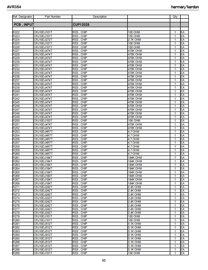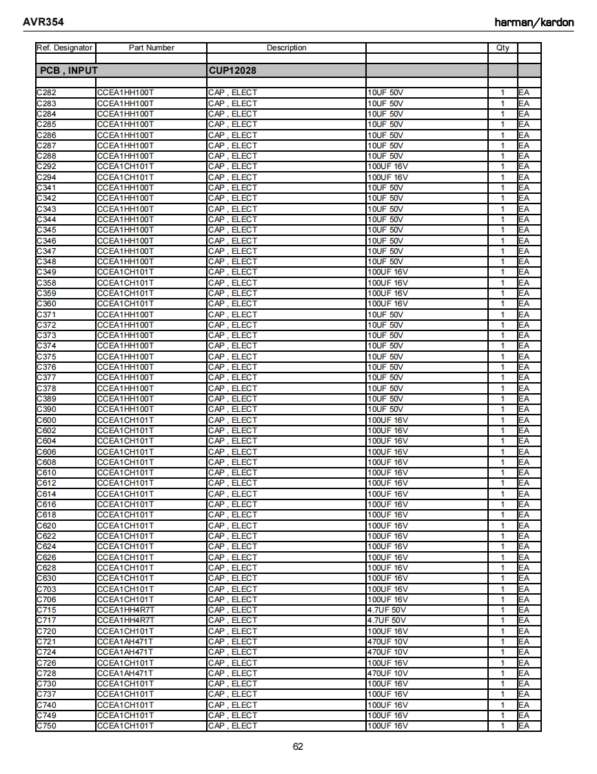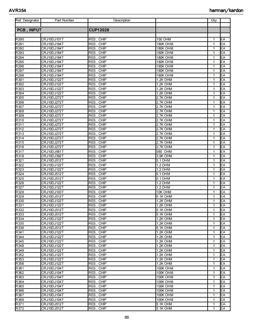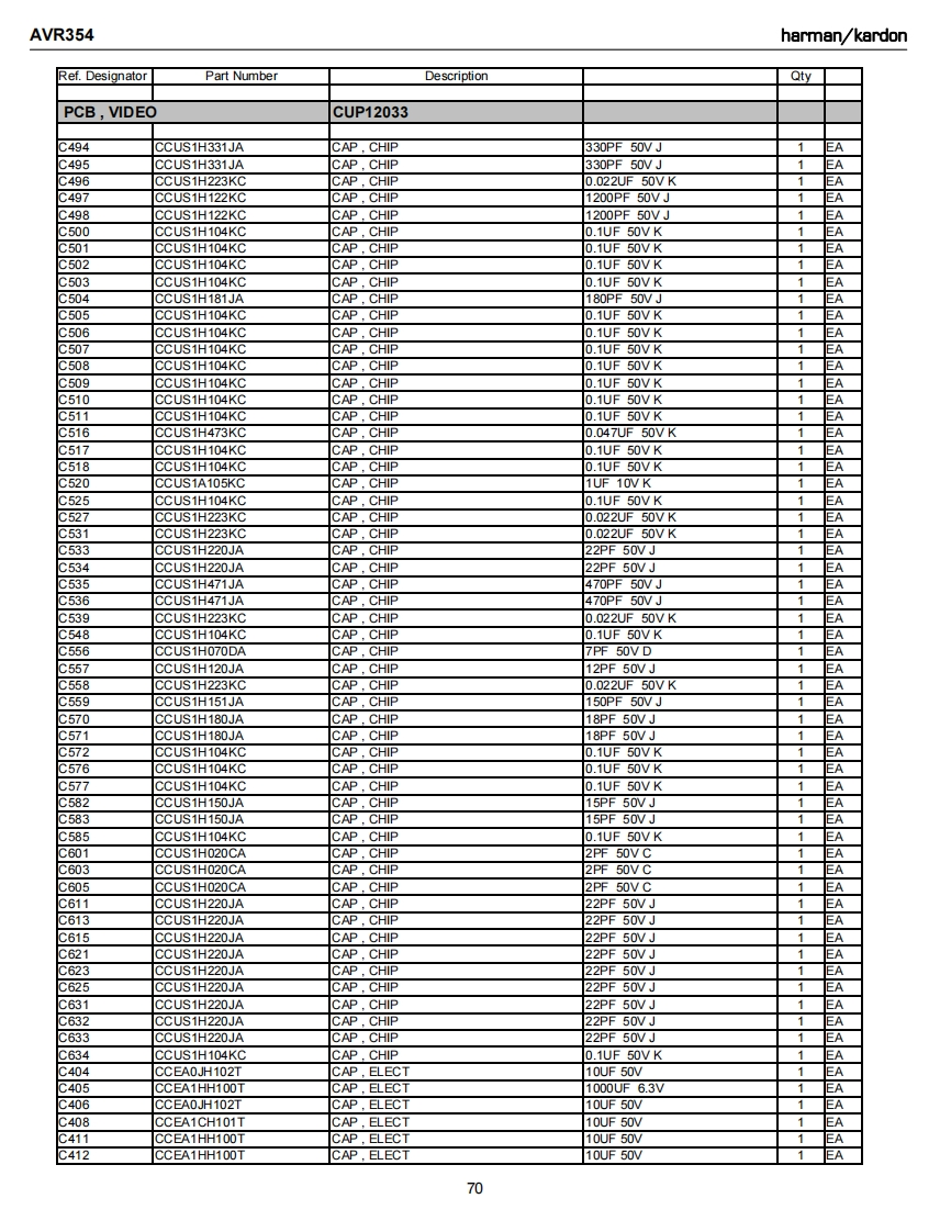 AVR354harman/kardonRef.DesignatorPart NumberDescriptionQtyPCB,INPUTCUP12028C731CCUS1H104KCCAP CHIP0.1UF 50V KEAC733CCUS1H104KCCAP.CHIP0.1UF 50VK1EAC734CCUS1H104KCCAP CHIP0.1UF 50V KAC738CCUS1A105KCCAP CHIP1UF 10VKC739CCUS1H103KCCAP.CHIP0.01UF50WKEAC741CCUS1H104KCCAP CHIP0.1UF 50V K1EAC742CCUS1H180JACAP CHIP18PF 50V JC743CCUS1H104KCCAP CHIP0.1UF 50V KEAC744CCUS1H180JACAP.CHIP18PF 50V JEAC745CCUS1H104KCCAP.CHIP0.1UF 50VKEAC746CCUS1H104KCCAP,CHIP0.1UF 50VKEAC747CCUS1H104KCCAP.CHIP0.1UF 50VKEAC748CCUS1H104KCCAP CHIP0.1UF 50V KEAC751CCUS1H104KCCAP.CHIP0.1UF 50VKEAC754CCUS1H104KCCAP.CHIP0.1UF 50VKEAC756CCUS1H104KCCAP.CHIP0.1UF 50VKEAC758CCUS1H104KCCAP CHIP0.1UF 50VKEAC759CCUS1H104KCCAP.CHIP0.1UF 50VK1EAC760CCUS1H104KCCAP.CHIP0.1UF 50VK1EAC761CCUS1H104KCCAP CHIP0.1UF 50VK1EAC762CCUS1H104KCCAP CHIP0.1UF 50VK1EAC763CCUS1H104KCCAP.CHIP0.1UF 50VKEAC765CCUS1H104KCCAP CHIP0.1UF 50VKEAC768CCUS1H104KCCAP CHIP0.1UF 50VKEAC769CCUS1H104KCCAP CHIP0.1UF 50VK1EAC770CCUS1H104KCCAP CHIP0.1UF 50VKEAC771CCUS1H104KCCAP.CHIP0.1UF 50VKEAC772CCUS1H104KCCAP CHIP0.1UF 50V K1EAC773CCUS1H104KCCAP CHIP0.1UF 50VK1EAC775CCUS1H104KCCAP.CHIP0.1UF 50VKEAC780CCUS1H102KCCAP.CHIP1000PF50WK1EAC781CCUS1H223KCCAP.CHIP0.022UF50VK1EAC782CCUS1H103KCCAP CHIP0.01UF50WKEAC783CCUS1H103KCCAP CHIP0.01UF50WK1EAC784CCUS1H103KCCAP.CHIP0.01UF50WK1EAC787CCUS1H103KCCAP.CHIP0.01UF 50VK1EAC789CCUS1H103KCCAP CHIP0.01UF50WKC790CCUS1H103KCCAP CHIP0.01UF50WKEAC791CCUS1H104KCCAP CHIP0.1UF 50V K1EAC793CCUS1H101JACAP,CHIP100PF 50V J1EAC794CCUS1H181JACAP,CHIP180PF 50V JC795CCUS1H181JACAP.CHIP180PF 50V JEAC796CCUS1H104KCCAP CHIP0.1UF 50VK1EAC797CCUS1H104KCCAP.CHIP0.1UF 50VKEAC798CCUS1H104KCCAP.CHIP0.1UF 50VK1EAC820CCUS1H104KCCAP.CHIP0.1UF 50VKEAC261CCEA1EH470TCAP,ELECT47UF 25VEAC262CCEA1EH470TCAP.ELECT47UF 25VAC263CCEA1日H470TCAP.ELECT47UF 25V1EAC264CCEA1EH470TCAP.ELECT47UF 25V1EAC265CCEA1EH470TCAP,ELECT47UF 25V1EAC266CCEA1EH470TCAP,ELECT47UF 25VEAC267CCEA1EH470TCAP.ELECT47UF 25VEAC268CCEA1EH470TCAP.ELECT47UF 25VEAC270CCEA1HH100TCAP.ELECT10UF 50VEAC271CCEA1HH100TCAP.ELECT10UF 50V1EAC272CCEA1HH100TCAP ELECT10UF 50VEAC273CCEA1HH100TCAP,ELECT10UF 50VEAC275CCEA1HH100TCAP,ELECT10UF 50V1EAC276CCEA1HH100TCAP.ELECT10UF 50V1C281CCEA1HH100TCAP ELECT10UF 50V1EA61