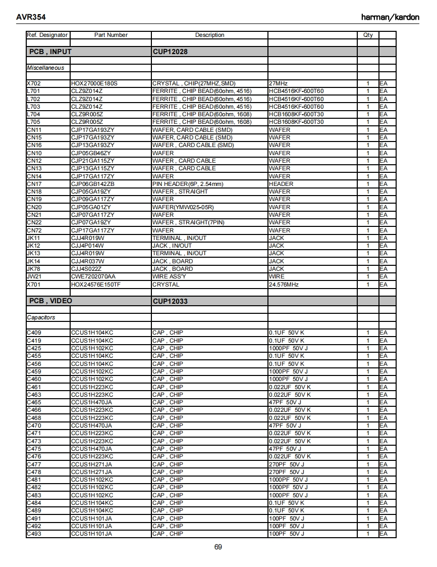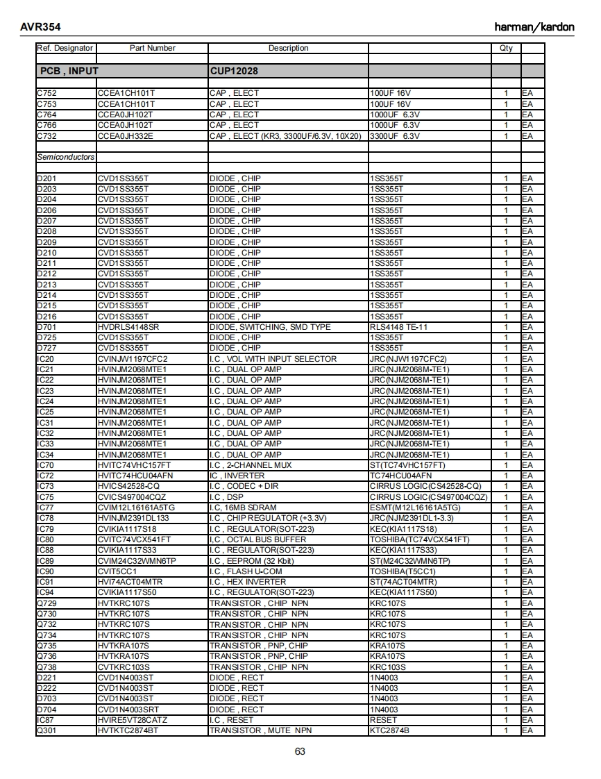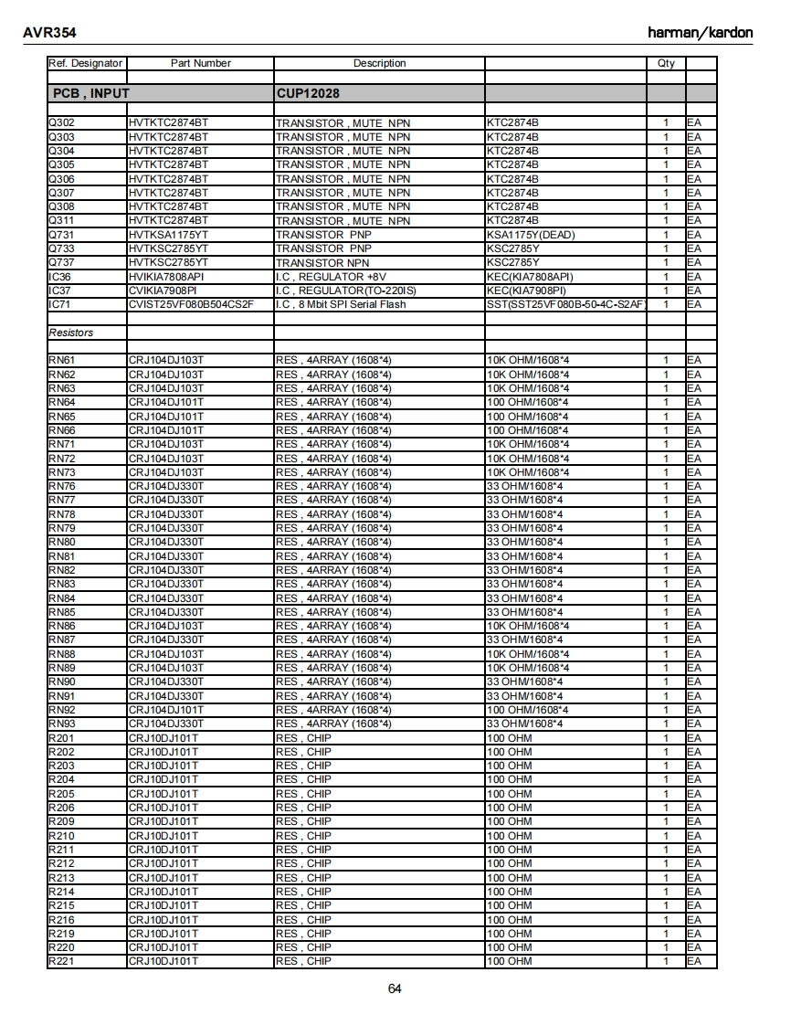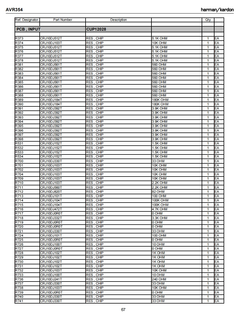 AVR354harman/kardonRef.DesignatorPart NumberDescriptionQtyPCB,INPUTCUP12028C731CCUS1H104KCCAP CHIP0.1UF 50V KEAC733CCUS1H104KCCAP.CHIP0.1UF 50VK1EAC734CCUS1H104KCCAP CHIP0.1UF 50V KAC738CCUS1A105KCCAP CHIP1UF 10VKC739CCUS1H103KCCAP.CHIP0.01UF50WKEAC741CCUS1H104KCCAP CHIP0.1UF 50V K1EAC742CCUS1H180JACAP CHIP18PF 50V JC743CCUS1H104KCCAP CHIP0.1UF 50V KEAC744CCUS1H180JACAP.CHIP18PF 50V JEAC745CCUS1H104KCCAP.CHIP0.1UF 50VKEAC746CCUS1H104KCCAP,CHIP0.1UF 50VKEAC747CCUS1H104KCCAP.CHIP0.1UF 50VKEAC748CCUS1H104KCCAP CHIP0.1UF 50V KEAC751CCUS1H104KCCAP.CHIP0.1UF 50VKEAC754CCUS1H104KCCAP.CHIP0.1UF 50VKEAC756CCUS1H104KCCAP.CHIP0.1UF 50VKEAC758CCUS1H104KCCAP CHIP0.1UF 50VKEAC759CCUS1H104KCCAP.CHIP0.1UF 50VK1EAC760CCUS1H104KCCAP.CHIP0.1UF 50VK1EAC761CCUS1H104KCCAP CHIP0.1UF 50VK1EAC762CCUS1H104KCCAP CHIP0.1UF 50VK1EAC763CCUS1H104KCCAP.CHIP0.1UF 50VKEAC765CCUS1H104KCCAP CHIP0.1UF 50VKEAC768CCUS1H104KCCAP CHIP0.1UF 50VKEAC769CCUS1H104KCCAP CHIP0.1UF 50VK1EAC770CCUS1H104KCCAP CHIP0.1UF 50VKEAC771CCUS1H104KCCAP.CHIP0.1UF 50VKEAC772CCUS1H104KCCAP CHIP0.1UF 50V K1EAC773CCUS1H104KCCAP CHIP0.1UF 50VK1EAC775CCUS1H104KCCAP.CHIP0.1UF 50VKEAC780CCUS1H102KCCAP.CHIP1000PF50WK1EAC781CCUS1H223KCCAP.CHIP0.022UF50VK1EAC782CCUS1H103KCCAP CHIP0.01UF50WKEAC783CCUS1H103KCCAP CHIP0.01UF50WK1EAC784CCUS1H103KCCAP.CHIP0.01UF50WK1EAC787CCUS1H103KCCAP.CHIP0.01UF 50VK1EAC789CCUS1H103KCCAP CHIP0.01UF50WKC790CCUS1H103KCCAP CHIP0.01UF50WKEAC791CCUS1H104KCCAP CHIP0.1UF 50V K1EAC793CCUS1H101JACAP,CHIP100PF 50V J1EAC794CCUS1H181JACAP,CHIP180PF 50V JC795CCUS1H181JACAP.CHIP180PF 50V JEAC796CCUS1H104KCCAP CHIP0.1UF 50VK1EAC797CCUS1H104KCCAP.CHIP0.1UF 50VKEAC798CCUS1H104KCCAP.CHIP0.1UF 50VK1EAC820CCUS1H104KCCAP.CHIP0.1UF 50VKEAC261CCEA1EH470TCAP,ELECT47UF 25VEAC262CCEA1EH470TCAP.ELECT47UF 25VAC263CCEA1日H470TCAP.ELECT47UF 25V1EAC264CCEA1EH470TCAP.ELECT47UF 25V1EAC265CCEA1EH470TCAP,ELECT47UF 25V1EAC266CCEA1EH470TCAP,ELECT47UF 25VEAC267CCEA1EH470TCAP.ELECT47UF 25VEAC268CCEA1EH470TCAP.ELECT47UF 25VEAC270CCEA1HH100TCAP.ELECT10UF 50VEAC271CCEA1HH100TCAP.ELECT10UF 50V1EAC272CCEA1HH100TCAP ELECT10UF 50VEAC273CCEA1HH100TCAP,ELECT10UF 50VEAC275CCEA1HH100TCAP,ELECT10UF 50V1EAC276CCEA1HH100TCAP.ELECT10UF 50V1C281CCEA1HH100TCAP ELECT10UF 50V1EA61