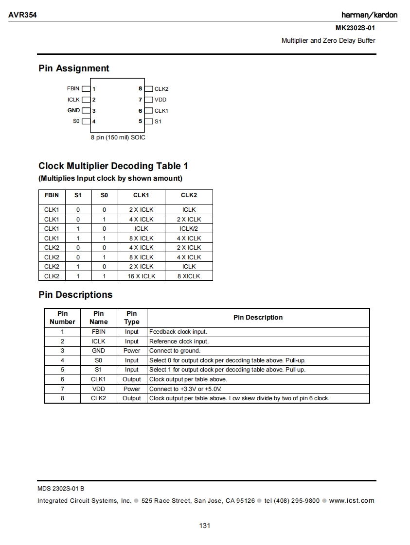 AVR354harman/kardonMK2302S-01Multiplier and Zero Delay BufferDescriptionFeaturesThe MK2302S-01is a high performance Zero Delay·8 pin SOIC packageBuffer(ZDB)which integrates ICS'proprietaryLow input to output skew of 250ps maxanalog/digital Phase Locked Loop (PLL)techniques.The chip is part of ICS'ClockBlocksTM family and was·Absolute jitter:±500psdesigned as a performance upgrade to meet today's·Propagation Delay±350pshigher speed and lower voltage requirements.The zeroAbility to choose between different multipliers from0.5X to 16Xdelay feature means that the rising edge of the inputclock aligns with the rising edges of both output docks.Output clock frequency up to 133 MHz at 3.3Vgiving the appearance of no delay through the device.Can recover degraded input clock duty cycleThere are two outputs on the chip,one being a.Output clock duty cycle of 45/55low-skew divide by two of the other output.Full CMOS clock swings with 25mA drive capabilityThe MK2302S-01 is ideal for synchronizing outputs in aat TTL levelslarge variety of systems,from personal computers toAdvanced,low power CMOS processdata communications to graphics/video.By allowingOperating voltage of 3.3V or 5Voff-chip feedback paths.the device can eliminate theIndustrial temperature version availabledelay through other devices.Block DiagramICLK-PhaseVcoCLK1Detector.S1:0Charge2Pump,and LoopCLK2FilterFBINdivideby NExternal feedback can come from CLK1 or CLK2 (see table on page 2)MDS 2302S-01 BIntegrated Circuit Systems,Inc.525 Race Street,San Jose,CA 95126tel(408)295-9800 www.icst.com130