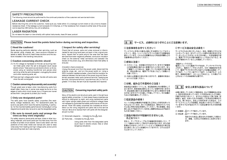 DENONFor U.S.A.,CanadaEurope modelVer.3SERVICE MANUALPlease refer to theMODIFICATION NOTICEMODEL DCM-390DCM-290DCM-27DCM-500AESTEREO CD PLAYER注意片一又卷书乙存前忙、乙0片一又又二1了儿卷必矿书読<龙古L。本機太、火災、感電、付在忙对寸石安全性左確保寸石左协忙、志未芒未在配嘘左龙乙在一乙)、未左法的体「電氖用品安全法」屯上可老、所定0許可卷得乙製造这九乙拈)夫寸。従一文竹一上入卷拈乙在今際志、乙九5)安全性摊持志九石太)、乙D少一上入マ二ュ了記截志九乙小石注意事项在必寸书守)〈龙八。For purposes of improvement,specifications and●本機仕樣性能改良)龙协、予告在〈姿更寸石℃上design are subject to change without notice.态)未寸。·補修用性能部品)保有期問太、製造打切後8年飞寸。Please use this service manual with referring to the●修理)際太、必寸取极說明害左参照上、作業在行2operating instructions without fail.(<龙达。Some illustrations using in this service manual are●本文中忙使用L乙石与又卜休、脱明)都合上现物slightly different from the actual set.七多少異春石場合态)未李。DENONTOKYO,JAPANDenon Brand Company,D&M Holdings Inc.X0283V.03DE/CD☑0706