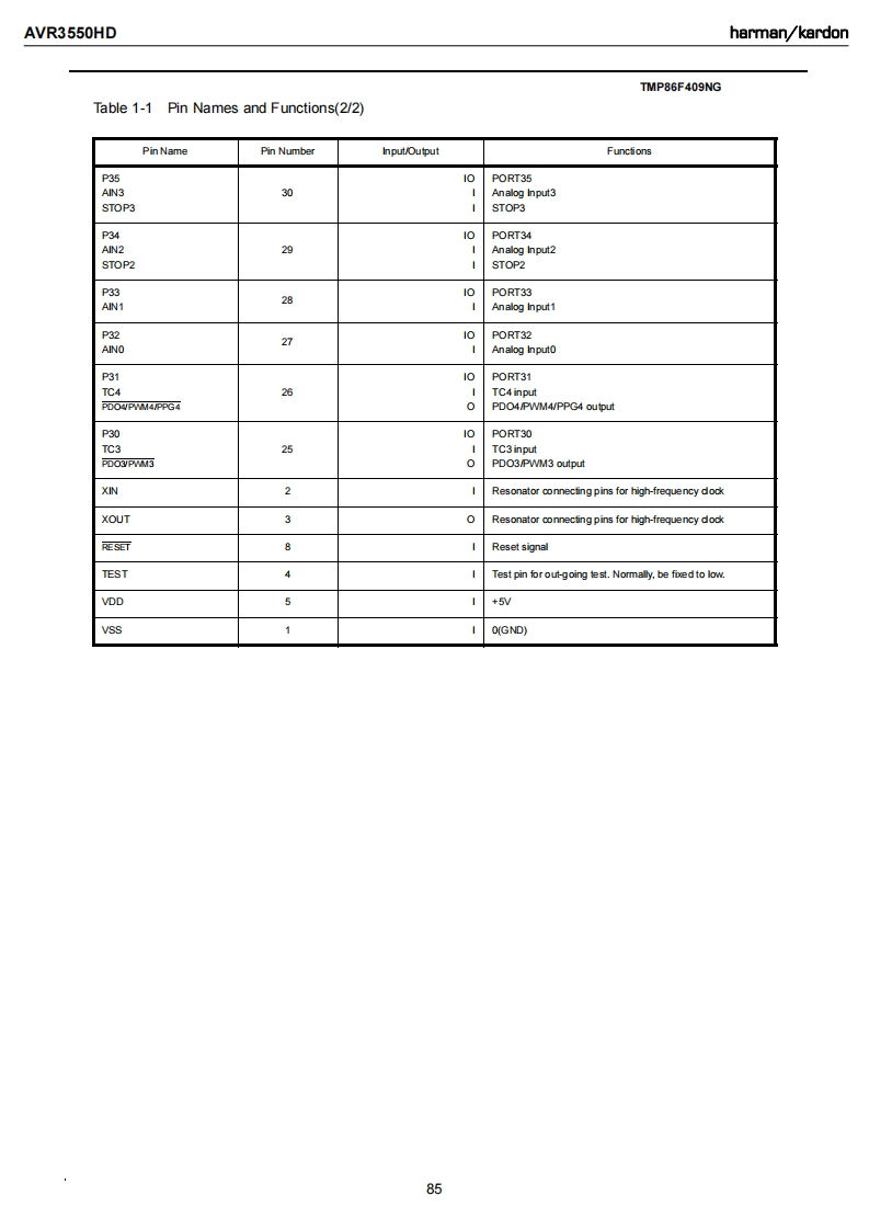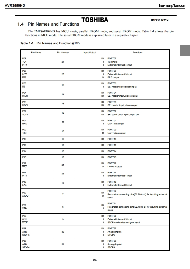 AVR3550HDharman/kardon1.1 FeaturesTMP86F409NG9.8bit Serial Expansion Interface(SED):1 channel(MSB/LSB selectable and max.4Mbps at 16MHz)10.10-bit successive approximation type AD converter·Analog input:6ch11.Key-on wakeup:4 channels12.Clock operationSingle clock modeDual clock mode13.Low power consumption operationSTOP mode:Oscillation stops.(Battery/Capacitor back-up.)SLOWI mode:Low power consumption operation using low-frequency clock.(High-frequency clockstop.)SLOW2 mode:Low power consumption operation using low-frequency clock.(High-frequency clockoscillate.)IDLEO mode:CPU stops,and only the Time-Based-Timer(TBT)on peripherals operate using high fre-quency clock.Release by falling edge of the source clock which is set by TBTCR.IDLEl mode:CPU stops and peripherals operate using high frequency clock.Release by interru-puts(CPU restarts).IDLE2 mode:CPU stops and peripherals operate using high and low frequency clock.Release by inter-ruputs.(CPU restarts).SLEEPO mode:CPU stops,and only the Time-Based-Timer(TBT)on peripherals operate using low fre-quency clock.Release by falling edge of the source clock which is set by TBTCR.SLEEPI mode:CPU stops,and peripherals operate using low frequency clock.Release by interru-put.(CPUrestarts).SLEEP2 mode:CPU stops and peripherals operate using high and low frequency clock.Release byinterruput.14.Wide operation voltage:4.5Vto5.5V116MHz/32.768Hz2.7 V to 5.5 V at 8 MHz/32.768 kHz81