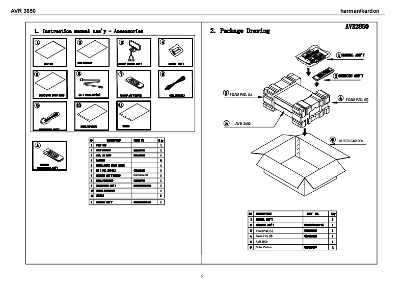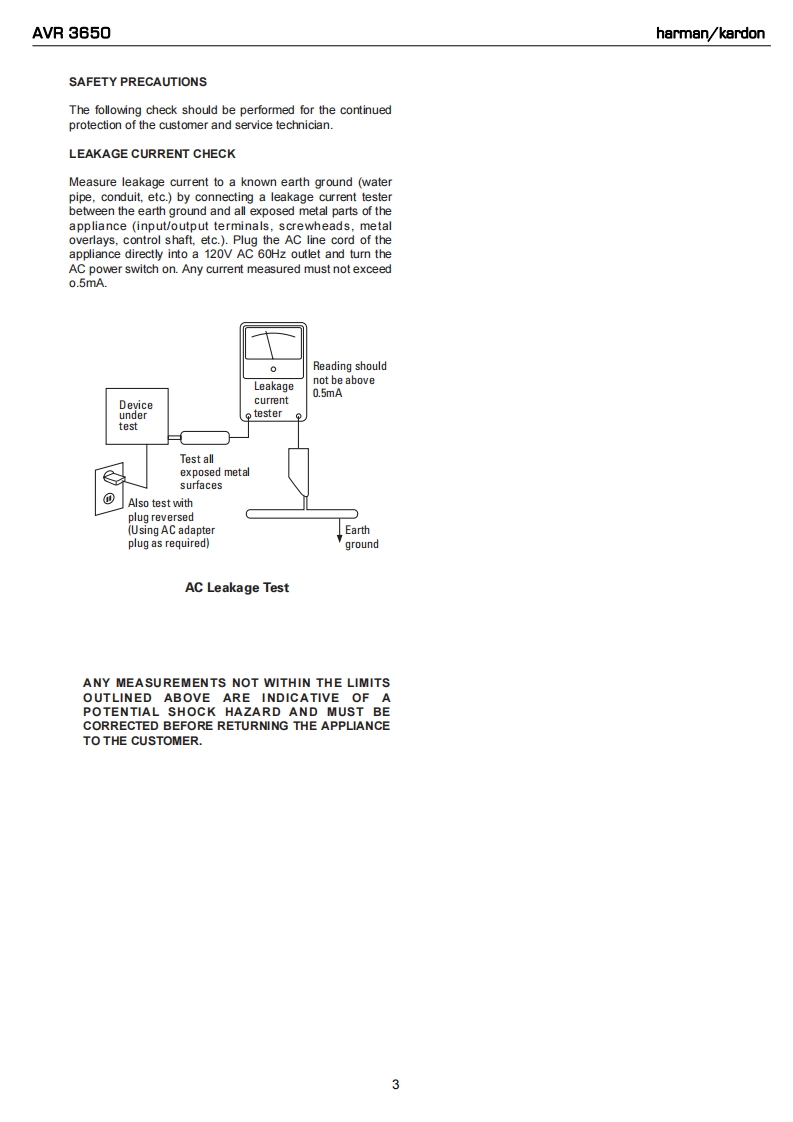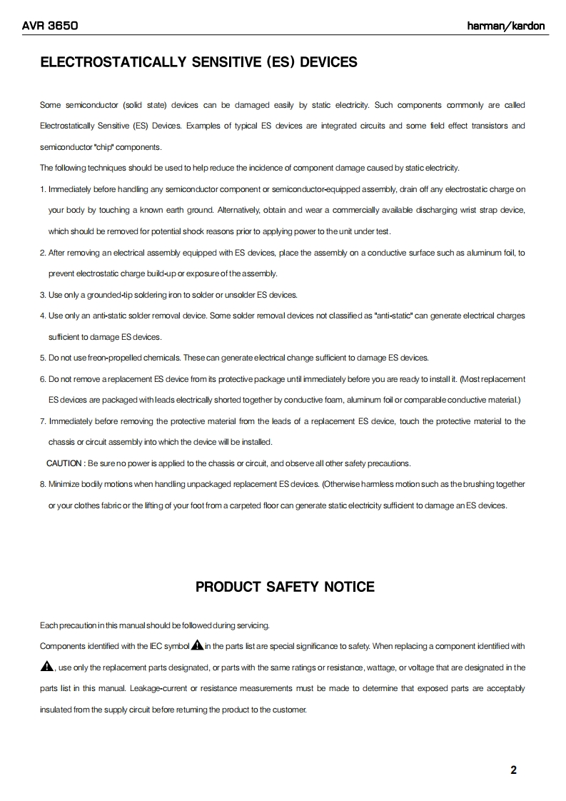 harman/kardonAVR 36507 X 110W 7.1 CHANNEL AN RECEIVERSERVICE MANUALAVRE:30CABLE/SATDOLBY PLI×4OUIEharman/kardonCONTENTSESD WARNING.........2DISASSEMBLY........26LEAKAGE TESTING.3UNIT EXPLODED VIEW...................27BASIC SPECIFICATIONS..................4EXPLODED VIEWPARTS LIST...............8PACKAGING.........5AMP BIAS ADJUSTMENT.....................29FRONT PANEL CONTROLS.......6BLOCK DIAGRAM..30REAR PANEL CONNECTIONS..............8pcB pRAWINGS....32REMOTE CONTROL FUNCTIONS..........10ELECTRICAL PARTS LIST......51CONNECTIONS/INSTALLATION.............12SEMICONDUCTOR PINOUTS...............108OPERATION......19SCHEMATICS........241TROUBLESHOOTING GUIDE.................24WIRING DIAGRAM............258REMOTE PROCESSOR RESETS..........25harman/kardon,Inc.Released 20118500 Balboa Blvd..Discontinued XXXXNorthridge,CA.91329Rev06/2011