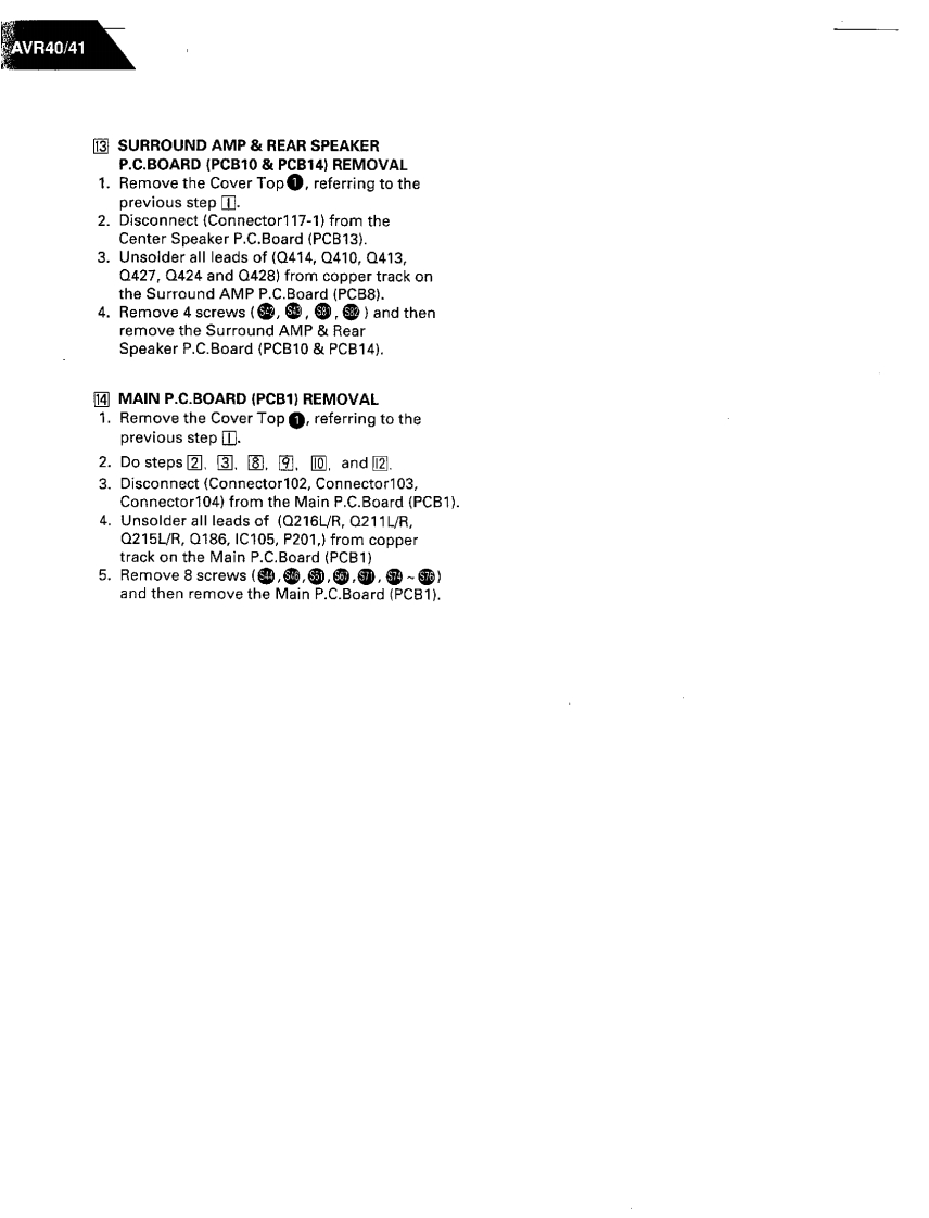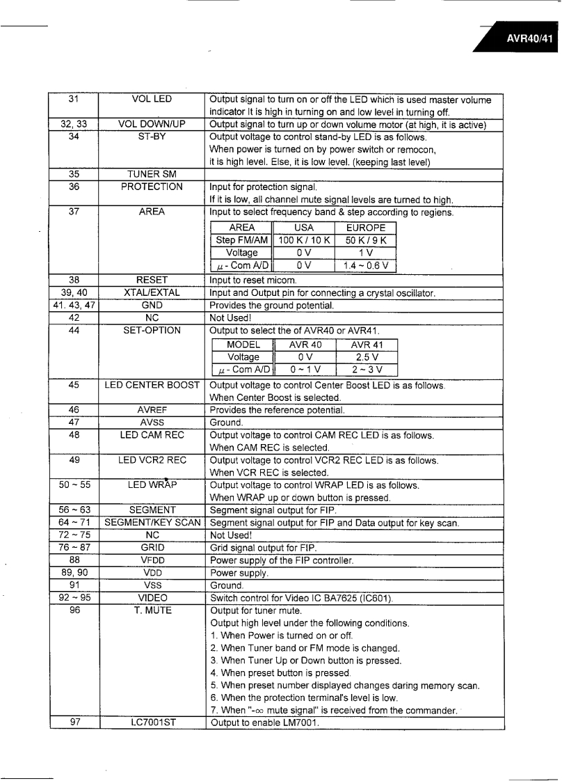 97.1/2The Harman KardonModel AVR40/41Manual AAUDIO AND VIDEO RECEIVERTechnical Manualharman/kardon0PRii0BIE`出@@@CONTENTS■SPECIFICATIONS…2GENERAL UNIT EXPLODED VIEW.............26LEAKAGE TEST.........3PRINTED CIRCUIT BOARDS…27CONTROLS AND FUNCTIONS.........4ELECTRICAL PARTS LIST..30BLOCK DIAGRAM…5IC FUNCTIONAL BLOCK DIAGRAM .............36DISASSEMBLY PROCEDURES.................6SCHEMATIC DIAGRAMS (D),(II),(III),(IV)…41CIRCUIT DESCRIPTION.......................8SCHEMATIC DIAGRAMS (V),(VI).(VII)4…45ALIGNMENT PROCEDURES…4444419SCHEMATIC DIAGRAMS (VIID,(IX).(X)…48TROUBLESHOOTING·444…22WIRING DIAGRAM.......................................51GENERAL UNIT PARTS LIST .................25PACKAGE…………52harman/kardonParts and Service Office80 Crossways Park West,Woodbury,N.Y.117971112-AVR40/41 G9710 1200 Printed in Karea