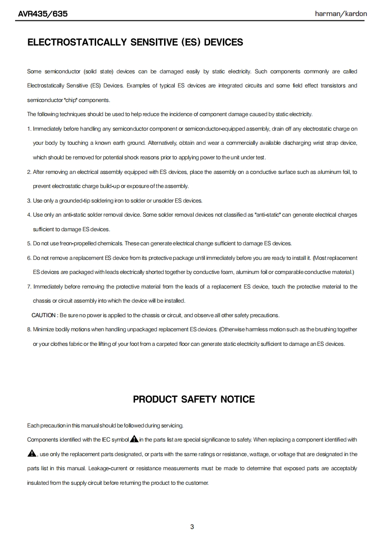 harman/kardonAVR4357 X 65W 7.1 CHANNEL A/V RECEIVERAVR6357 X 75W 7.1 CHANNEL A/RECEIVERSERVICE MANUALn图通DUD/CORX1m四mDOLBY D EX器n图harman kardon国红DUD/C0AX1田"密D0 LBY D E×=D画G西harman kardonCONTENTSPACKINGEXPLODED VIEW..27ESD WARNING..3MECHANICAL PARTS LIST..28LEAKAGE TESTING............4TECH TIP HKTT2003-01......30AVR435 BASIC SPECIFICATIONS........5IDLE ADJUSTMENT PROCEDURES.......31AVR635 BASIC SPECIFICATIONS.6BLOCK DIAGRAMS...........................33FRONT PANEL CONTROLS..7AVR435 PARTS LISTS.....................35REAR PANEL CONNECTIONS..............10AVR635 PARTS LISTS..........................54REMOTE CONTROL FUNCTIONS...........13SEMICONDUCTOR PINOUTS...............75INSTALLATION/CONNECTIONS............17PCB DRAWINGS..........................117OPERATION......20SCHEMATICS................128TROUBLESHOOTING GUIDE.................26WIRING DIAGRAM.........................142PROCESSOR RESET............26haman/kardon,Inc.250 Crossways Park Dr.Woodbury,New York 11797Rev16/2004