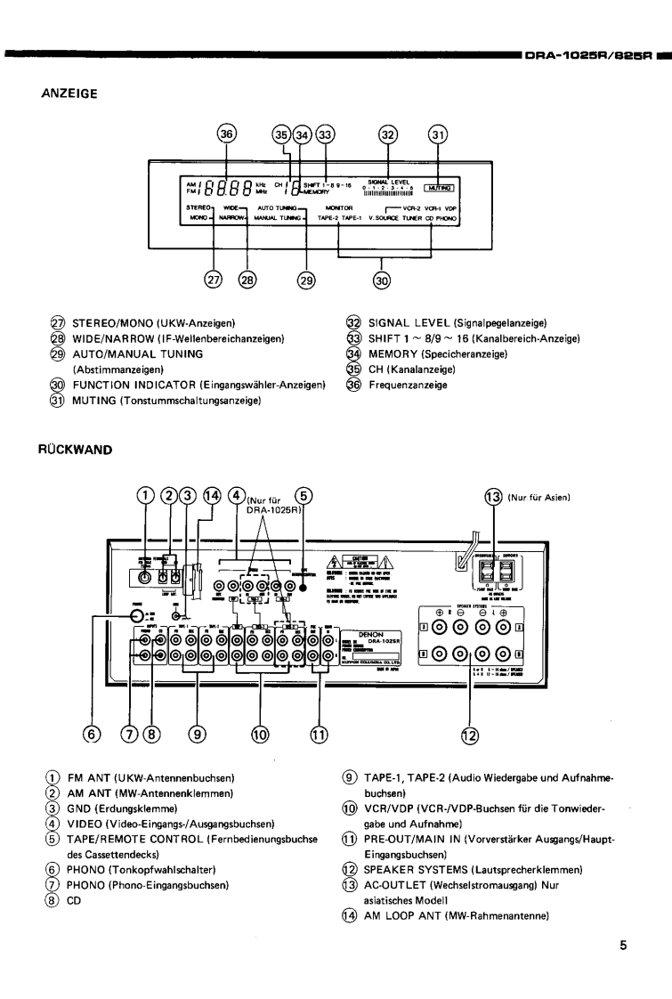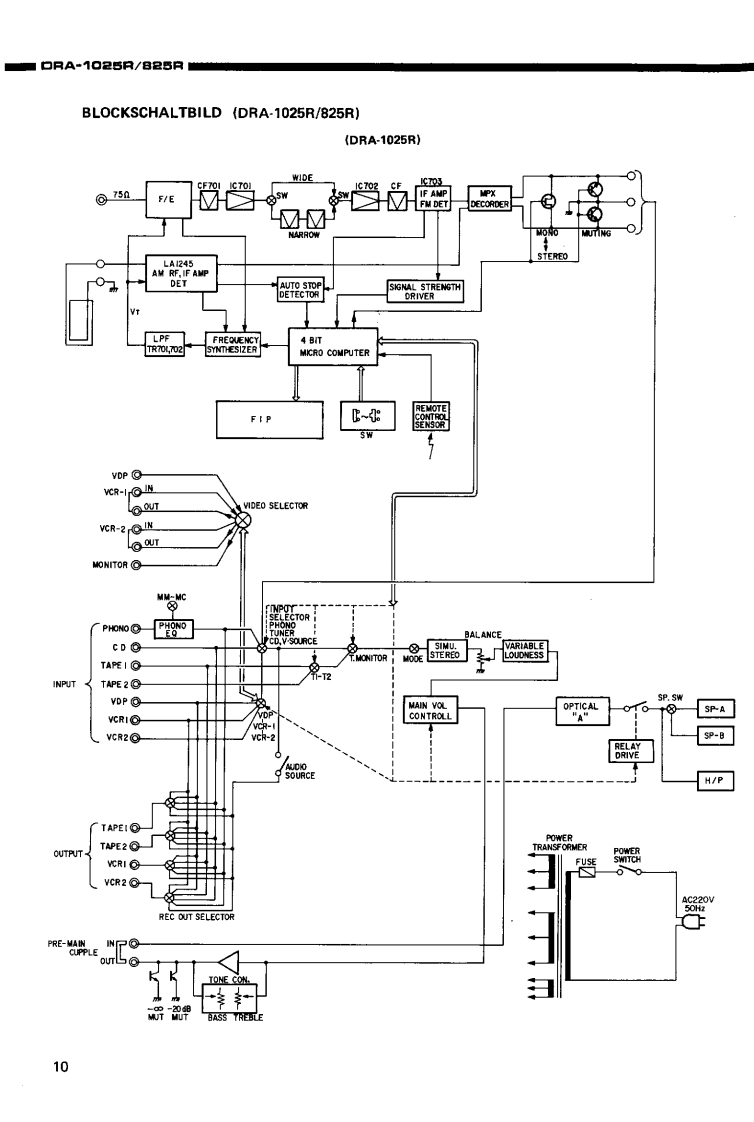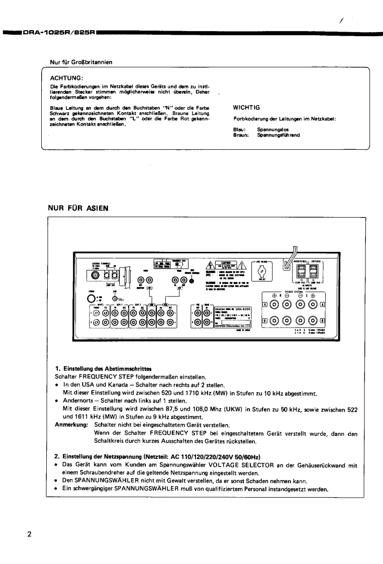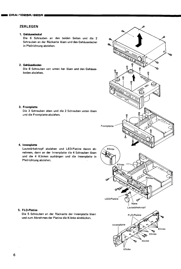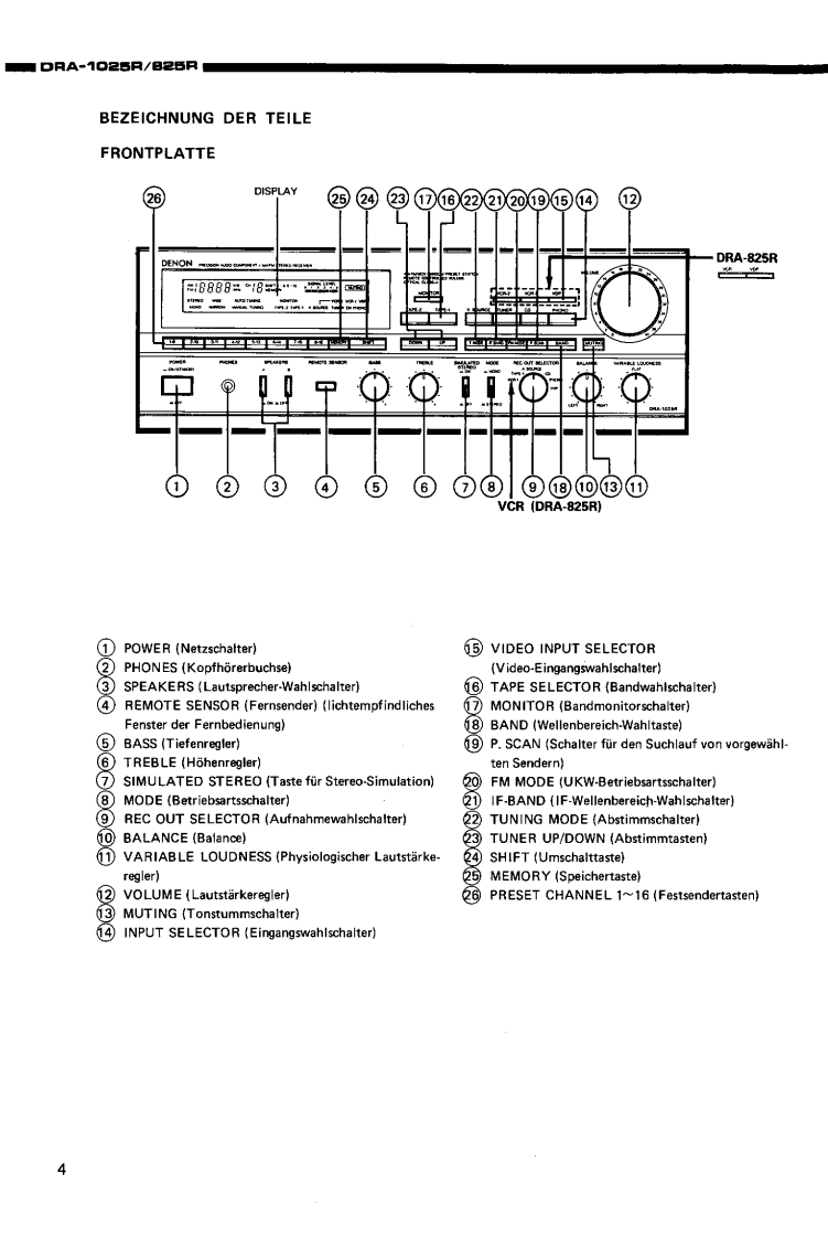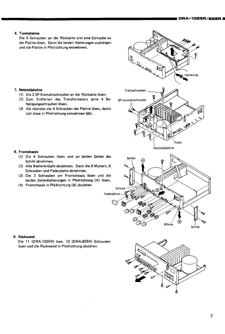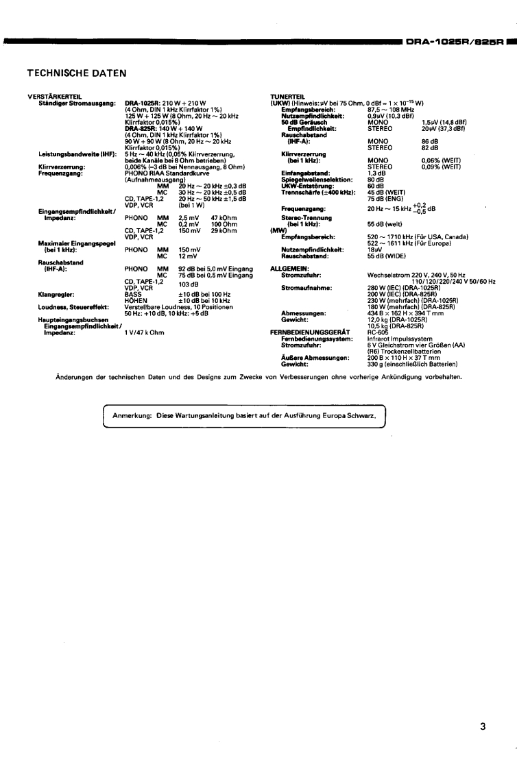 DENONHi-Fi-MW/UKW-StereoreceiverWARTUNGSANLEITUNGFur die Europa-.und AsienTYPDRA-1025R/825RMW/UKW STEREORECEIVER*DRA-1025RDRA-826RINHALTSVERZEICHNISTECHNISCHE DATEN,,·,·:…·…···BEZEICHNUNG DER TEILE..........................................4.5ZERLEGEN6,7ANSCHLOSSE........BLOCKSCHALTBILD (DRA-1025R/825R)............10,11JUSTIERUNG....12.13HALBLEITER...···.··,··,···.14,15PLATINENVERSTARKERBAUGRUPPE1U-1640(DRA-1025R).·,,····6VERSTARKERBAUGRUPPE1U-1650(DRA825R).,.·,·.:········:17TUNERBAUGRUPPE 1U-1647 (DRA-1025R)18TUNERBAUGRUPPE 1U-1646 (DRA-825R)......。”+4。…9…”4,…4919NETZTEIL-U.ENTZERRERBAUGRUPPE 1U-1648 (DRA-1025R/825R)20TEILELISTE ZU DEN PLATINENVERSTARKERBAUGRUPPE 1U-1640 (DRA-1025R)21,2VERSTARKERBAUGRUPPE1U-1650B(DRA-825R)....:·,·.···22TUNERBAUGRUPPE 1U-1647 (DRA-1025R)..............22,2TUNERBAUGRUPPE1U-1646B(DRA-825R),··24NETZTEIL-U.ENTZERRERBAUGRUPPE 1U-1648 (DRA-1025R)24.2NETZTEIL-U.ENTZERRERBAUGRUPPE 1U-1648D (DRA-825R)25EXPLOSIONSZEICHNUNG VON CHASSIS UND GEHAUSE UND TEILELISTETEILELISTE ZUR EXPLOSIONSZEICHNUNG (DRA-1025R/825R AUSFOHRUNGEUROPA.SCHWARZ).···,...25,26TEILELISTE ZUR EXPLOSIONSZEICHNUNG (DRA-1025R/825R,AUSFOHRUNG EUROPA,GOLD)....26TEILELISTE ZUR EXPLOSIONSZEICHNUNG (DRA-825R AUSFOHRUNG ASIEN,SCHWARZ)..。。。…。。。·,,。。。””2EXPLOSIONSZEICHNUNG VON CHASSIS UND GEHAUSE(DRA-1025R/825R).............7VERDRAHTUNGSZEICHNUNG(DRA-1025R/825R)..,......·..,.·,··,·28SCHALTPLAN(DRA-1025R),,,,,,..,..,..·....··...29,30SCHALTPLAN (DRA-825R)...31,32NIPPON COLUMBIA CO.,LTD.